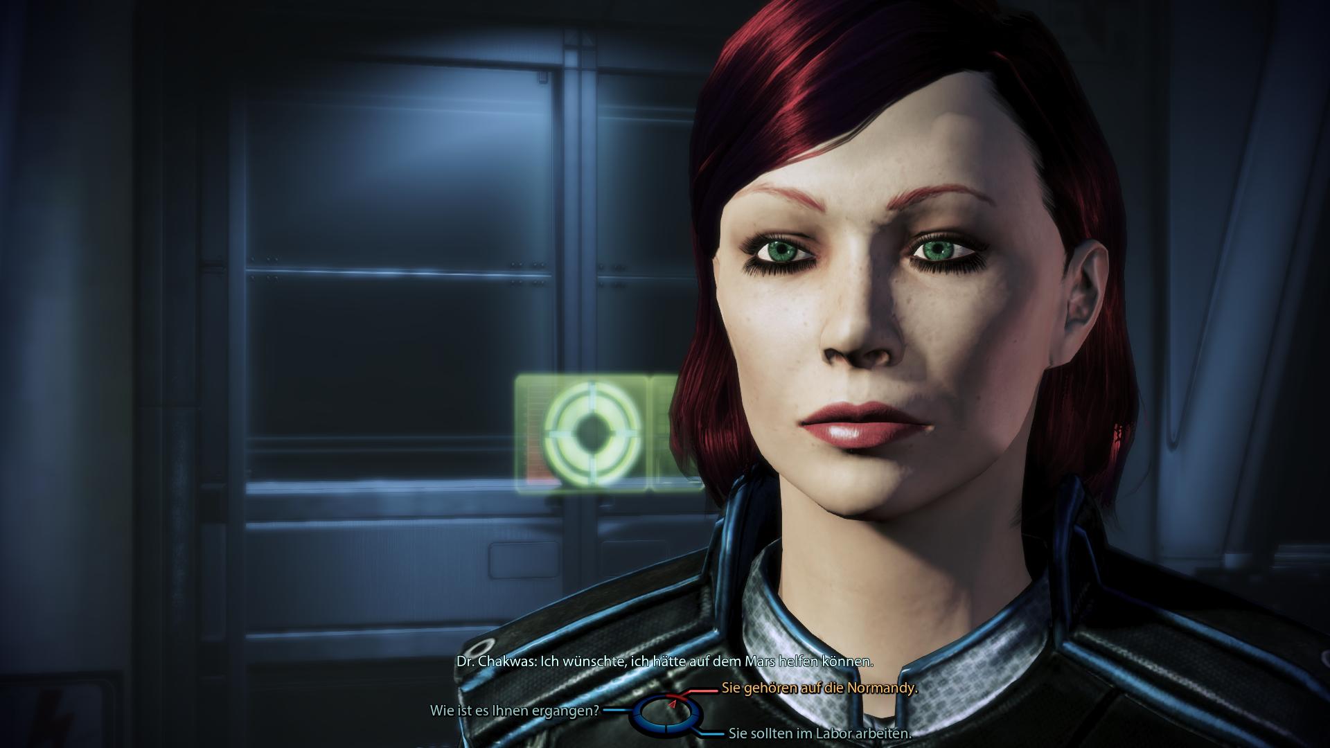 Fundort:Falls ihr in Mass Effect 2 nach der Entführung der Normandy-Crew umgehend zur Reaper Basis geflogen seid und Dr. Chakwas dadurch überlebt hat, könnt ihr sie ab dem ersten Citadel Besuch (nach dem Mars Prolog) im Wartezimmer des Huertas-Krankenhauses treffen.