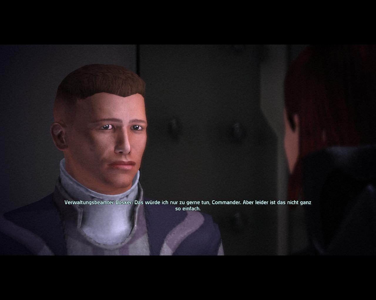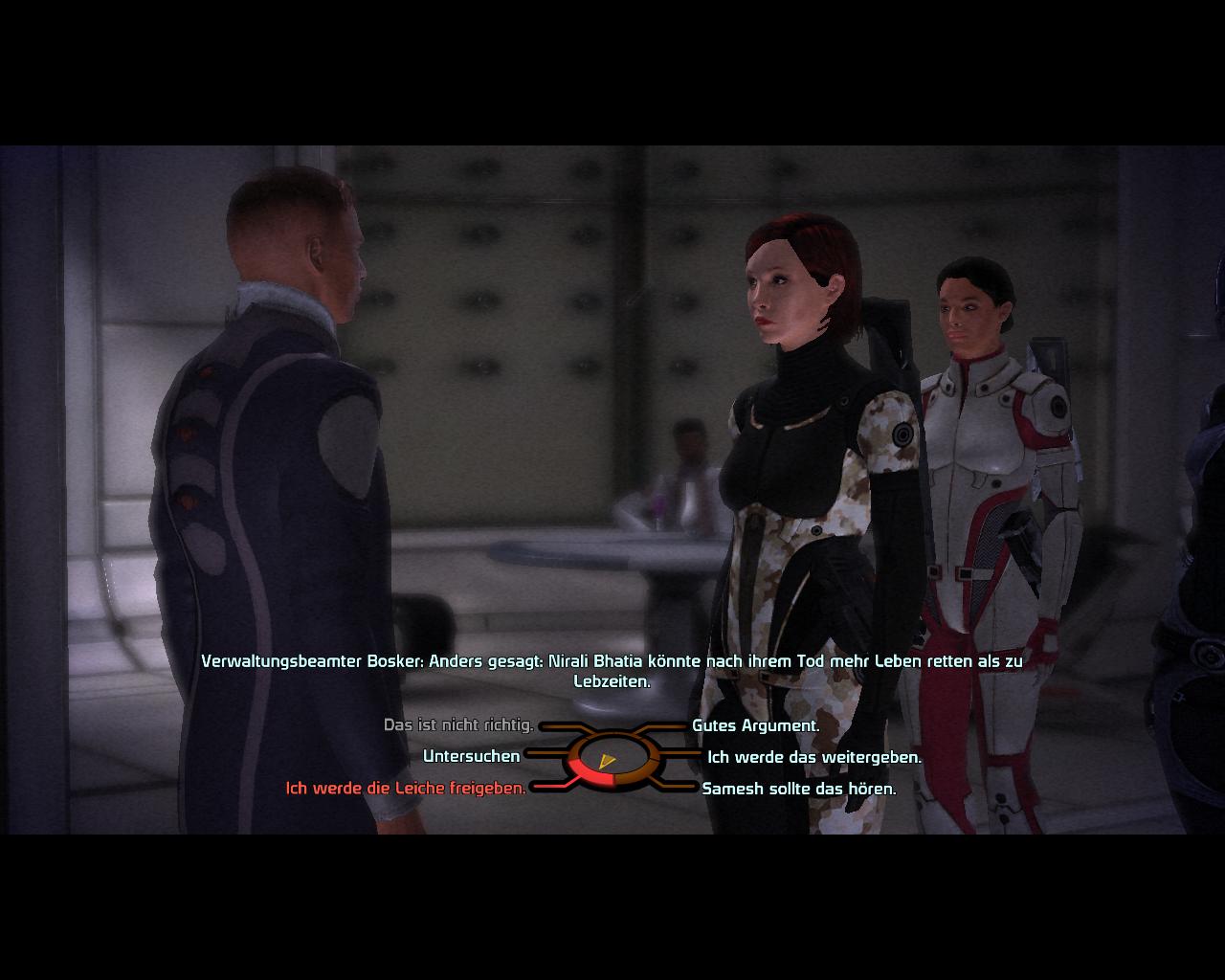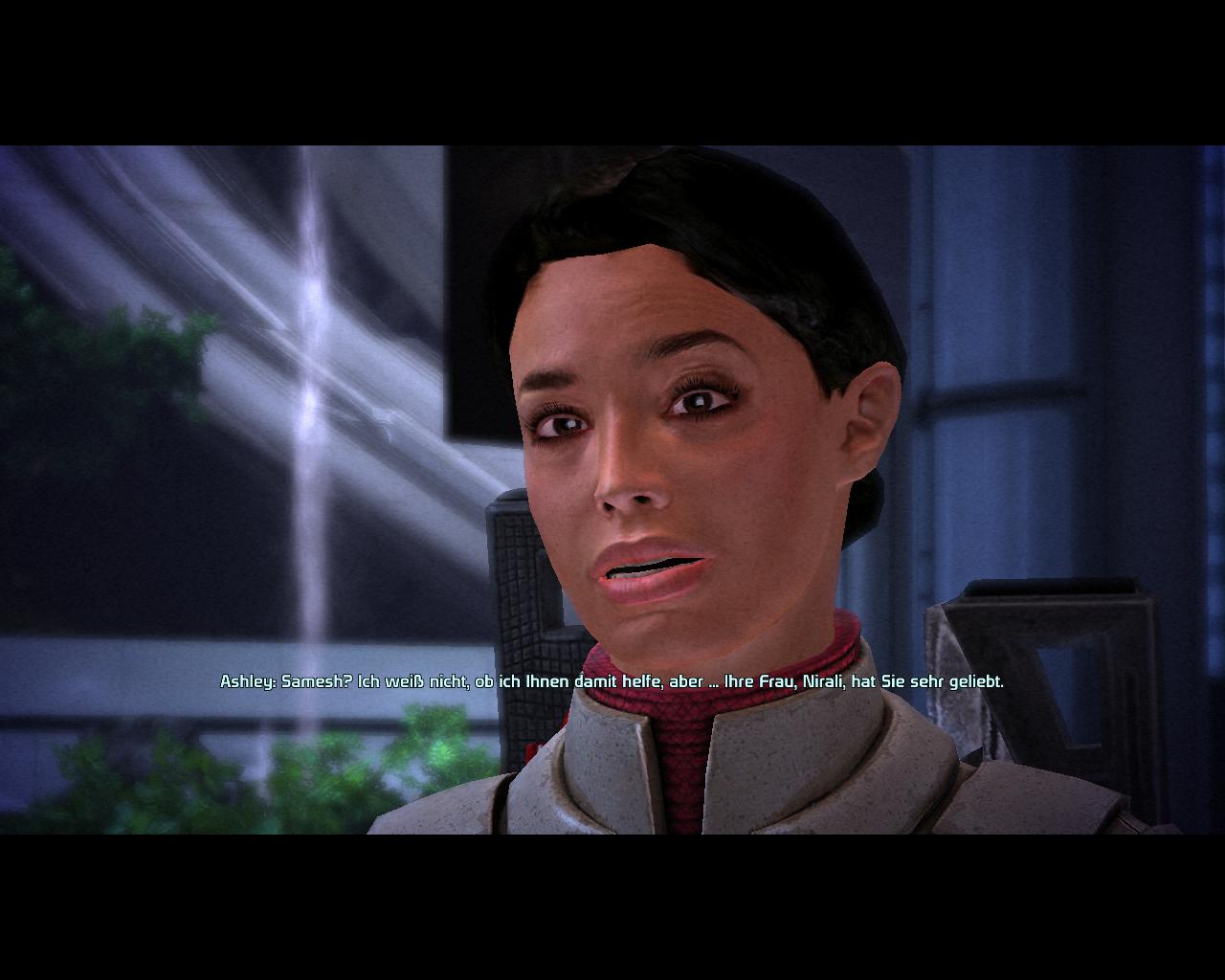 Samesh hat seine Frau Nirali Bhatia auf Eden Prime verloren. Sie gehörte zur 212., Ashley Williams Einheit. Falls Ashley in eurer Gruppe ist, wird sie sich entsprechend zu Wort melden. Das beeinflusst den Verlauf des Auftrages jedoch nicht. Samesh möchte nichts weiter als den Leichnam seiner Frau wieder haben. Aber die Allianz will ihn nicht freigeben. Geht in die angrenzende Botschafts-Lounge und redet dort mit Verwaltungsbeamten Bosker. Bosker erklärt, dass Nirali durch unbekannte Waffen getötet wurde und ihre Leiche deshalb für Tests benötigt wird. An diesem Punkt könnt ihr versuchen es Samesh zu erklären.