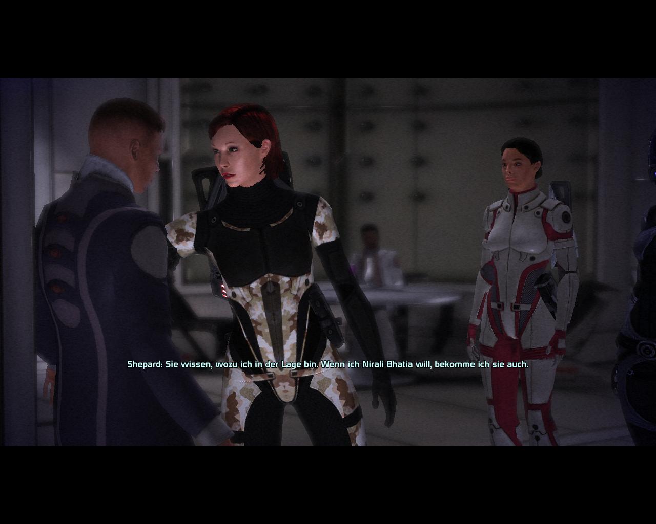 Eine zufriedenstellende Lösung der Quest ist jedoch nur mit Überredungskünsten möglich. Entweder müsst ihr Samesh (erfordert Stufe 3 Einschüchtern/Schmeicheln) oder Bosker (erfordert Stufe 2 Einschüchtern/Schmeicheln) [bzw. Stufe 8 in der Release Version von Mass Effect]. Als Belohnung erhaltet ihr 8-9 viele Abtrünnig/Vorbildlich Punkte. Falls ihr Samesh Nirali Körper zurück beschafft und Ashley in der Gruppe ist, erzählt sie von Niralis Liebe fürs Essen und Musik.