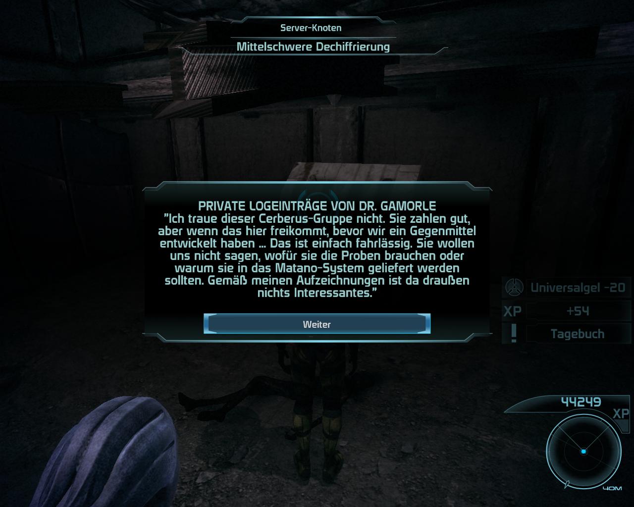 Auf Feros haben Sie das persönliche Log eines ExoGeni-Angestellten gefunden. Laut den Notizen des Doktors ist er besorgt über einige Proben, die eine Gruppe namens Cerberus erhalten soll.