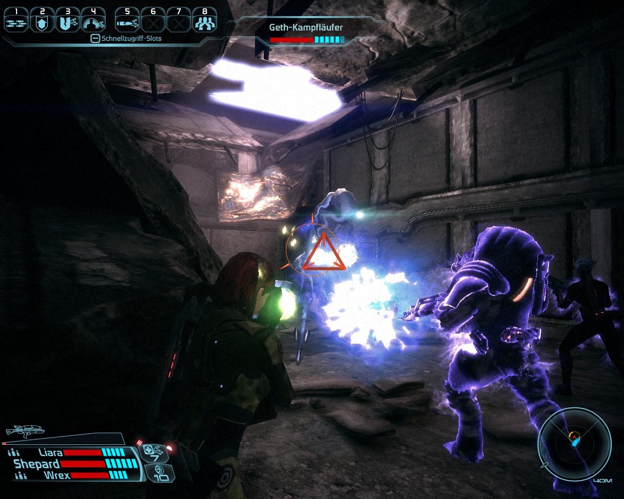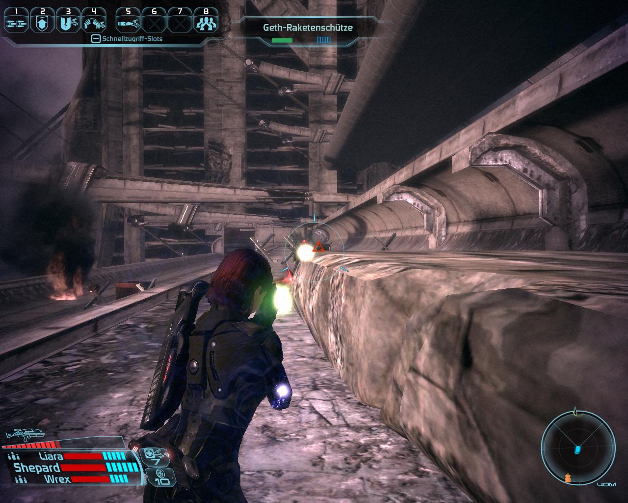 Der Skyway selbst besteht aus zwei langen geraden Abschnitten, die vom Flüchtlingslager (Wiegestation) unterbrochen werden. Auf beiden Strecken müsst ihr zahlreiche Geth-Frontkämpfer, Geth-Raketenschützen und Geth-Kampfläufer erledigen. Wie üblich gilt, ihr erhaltet mehr Erfahrungspunkte, wenn ihr sie mit der Squad und nicht dem Mako erledigt. Falls es euch selbst mit dem Mako zu schwer sein sollte, bedenkt, dass die Angreifer immer auf die Nase des Mako feuern. Seitliches Ausweichen oder die Spitze des Fahrzeugs hinter einem Felsen zu parken, wirkt Wunder! Bei einigen Geth-Stellungen gibt es Tunnel mit Eingängen auf der Fahrbahn. Es lohnt sich dort hinab zu steigen und die Geth-Truppen darin ebenfalls zu erledigen. Vielleicht findet ihr in der ein oder anderen Kiste einen Kampfsensor V oder höher, der euch im ExoGeni-Komplex hilft.