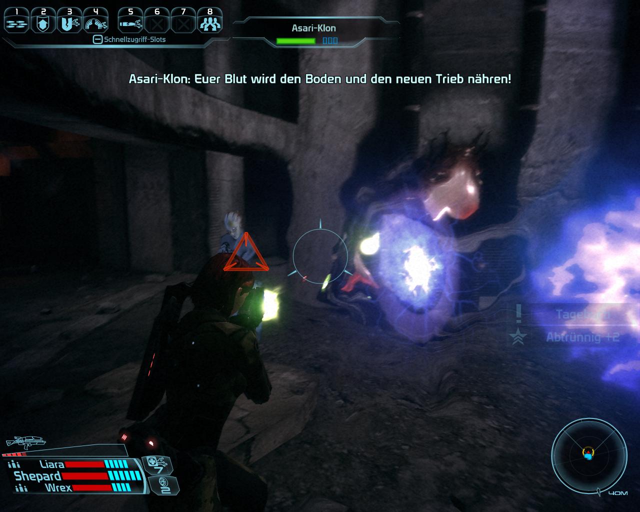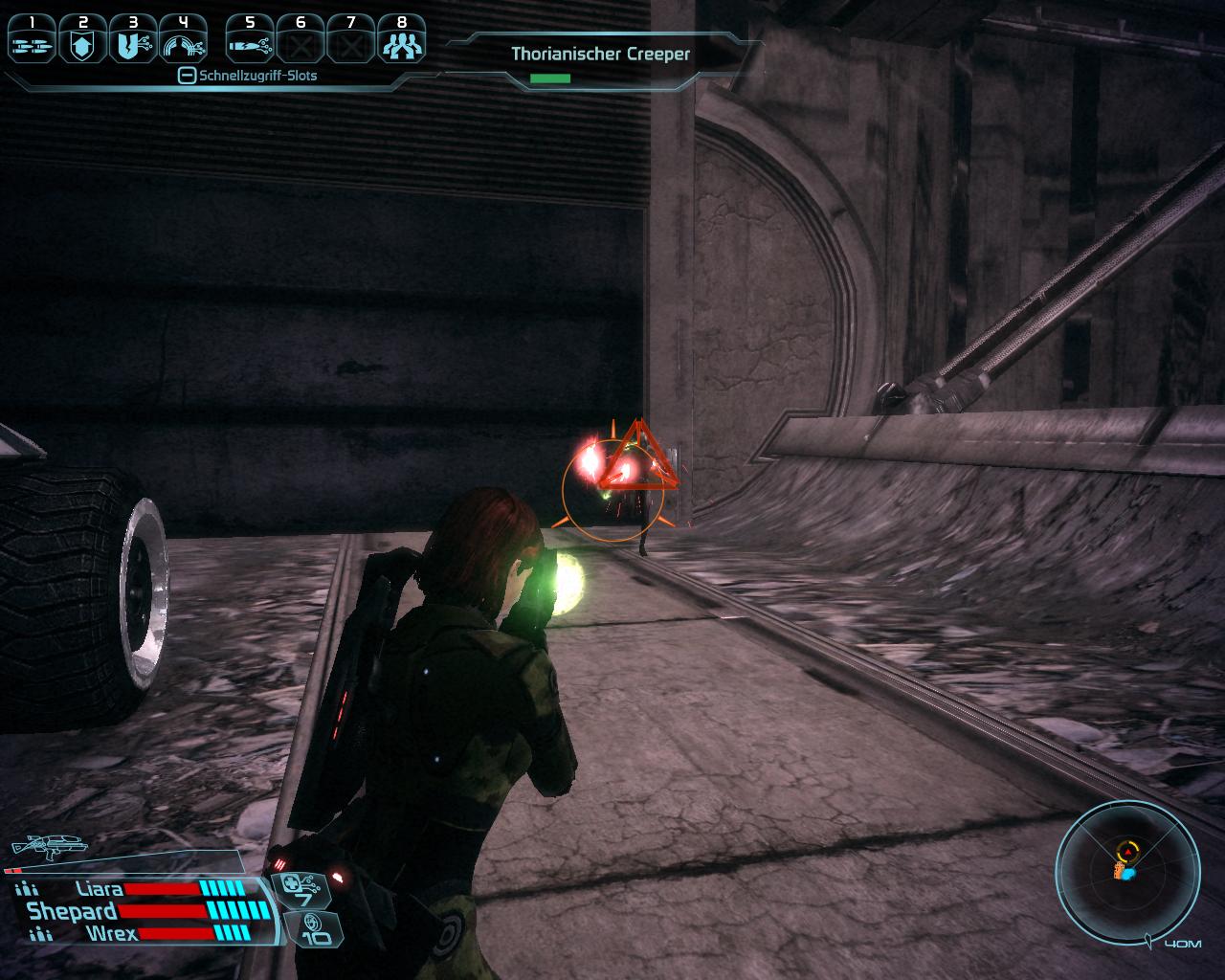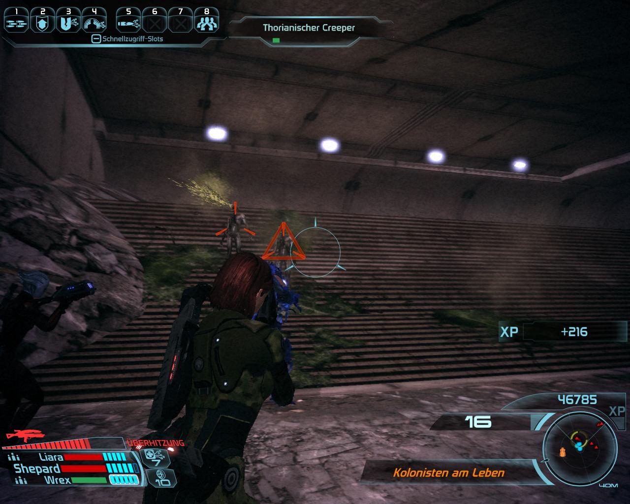 Vor dem Tor zu Zhu's Hopes Garage hält der Mako automatisch und die Zwischensequenz macht euch auf die Thorianischen Creeper aufmerksam. Bevor ihr das Garagentor öffnet, solltet ihr unbedingt abspeichern! Das Gespräch mit euren Squadmitgliedern entscheidet, wie sie sich in den folgenden Gefechten verhalten. Befehlt ihnen, wie auch ihr euch verhalten wollt. Es geht hier zunächst um Abtrünnig- oder Vorbildlich-Punkte und falls Jeong gestorben ist auch um den Fortbestand der ganzen Einrichtung. Für jeden überlebenden (bewusstlosen) Kolonisten erhaltet ihr zwei Vorbildlich-Punkte und für jeden toten Abtrünnig-Punkte. Die kommenden Kämpfe werden also um so schwerer, wenn ihr vorbildlich handeln wollt. Denn im Gegensatz zu euren Gefährten, müsst ihr selbst Feinde identifizieren und dürft Kolonisten nicht versehentlich erschießen. Die Kolonisten stehen häufig nicht nah genug beisammen, damit eine Granate alle (teilweise vier auf einmal) umhaut. Für alle 16 werdet ihr vermutlich 6-8 Granaten benötigen. Falls ihr die nicht habt, müsst ihr den Kolonisten im Nahkampf gegenüber treten. Schläge töten die Kolonisten nicht, sondern machen sie nur bewusstlos.