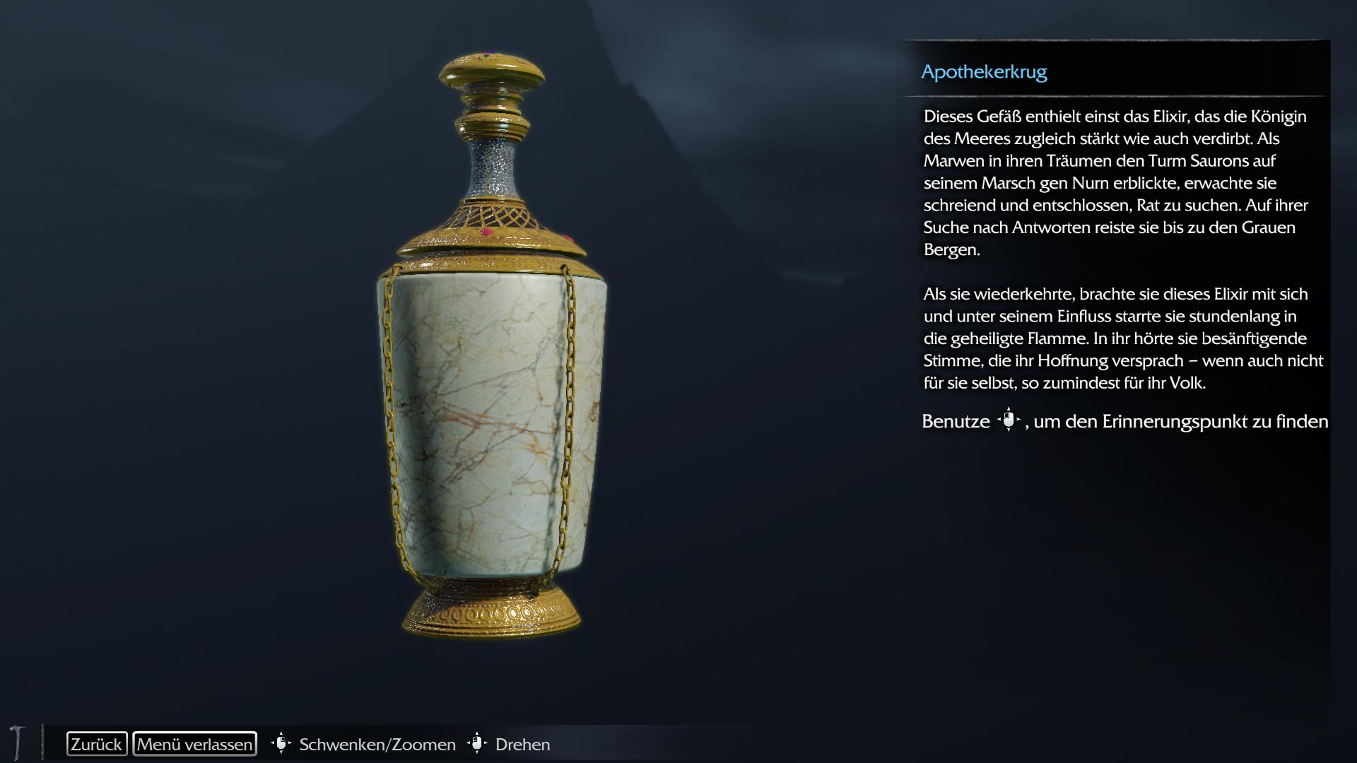 Dieses Gefäß enthielt einst das Elixir, das die Königin des Meeres zugleich stärkt, wie auch verdirbt. Als Marwen in ihren Träumen den Turm Saurons auf seinem Marsch gegen Nurn erblickte, erwachte sie schreiend und entschlossen, Rat zu suchen. Auf ihrer Suche nach Antworten reisten sie bis zu den Grauen Bergen.