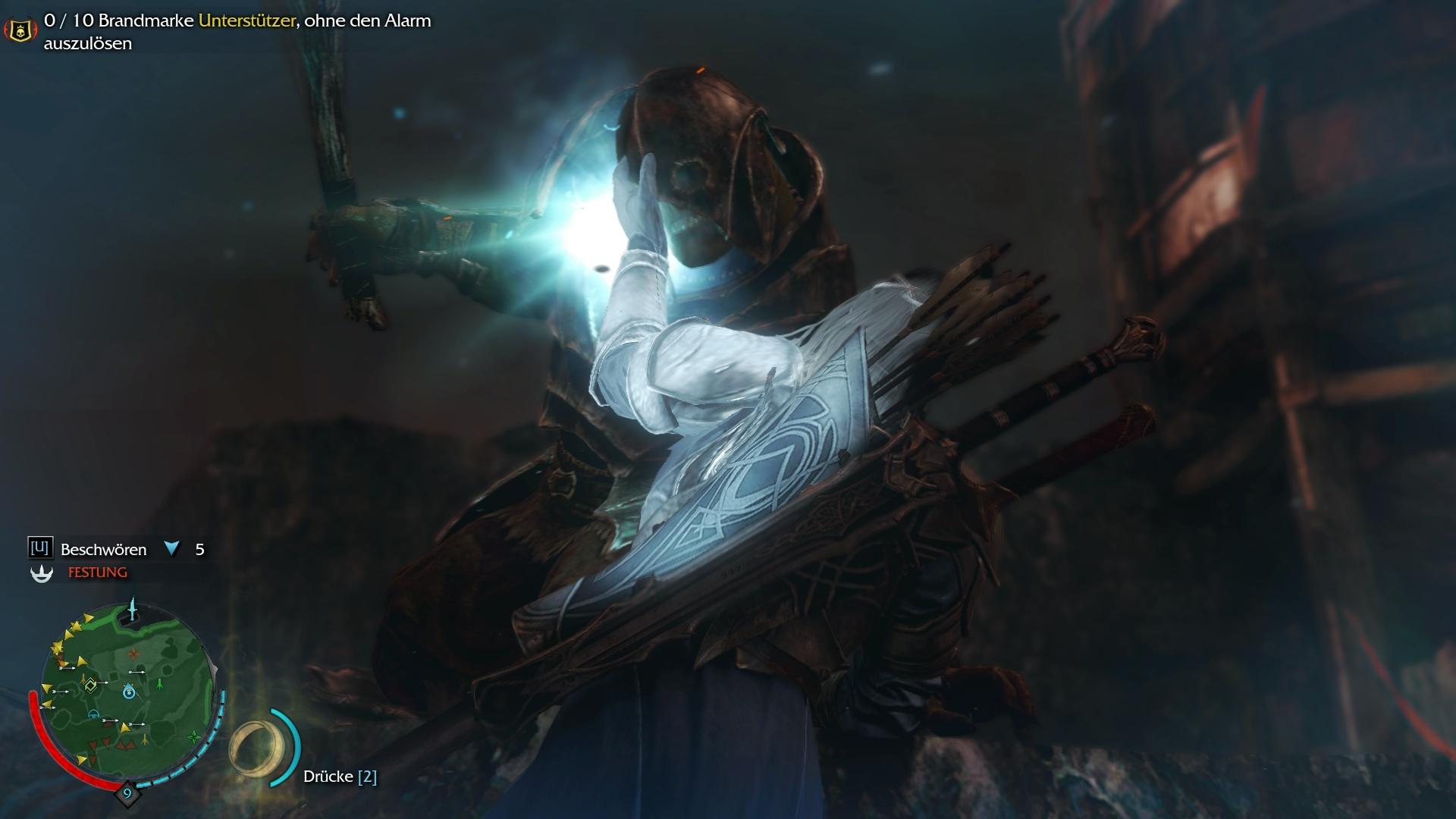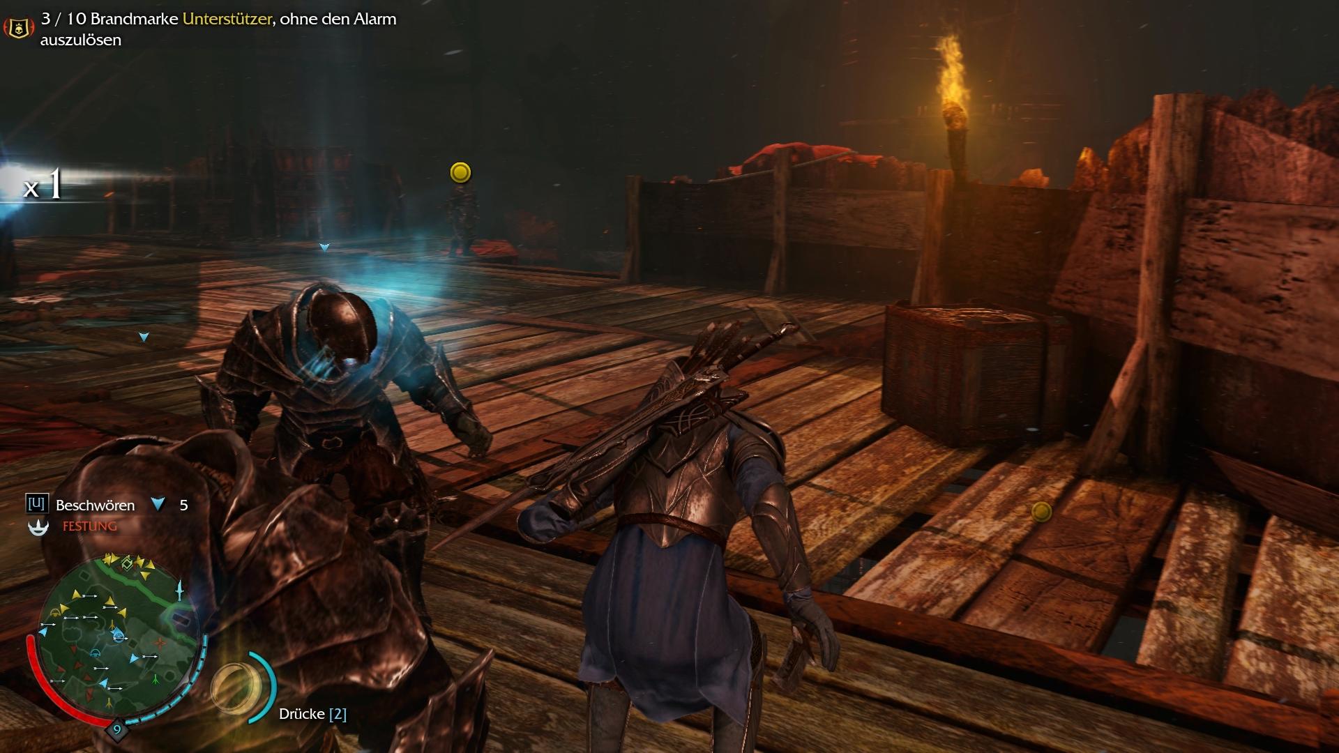 Die Uruks am Boden, auf dem Weg zum Haupttor der Garnison, beobachten sich gegenseitig und sind schwierig einzeln zu erledigen. Ignoriert sie möglichst und sucht euch Abseits Ziele.