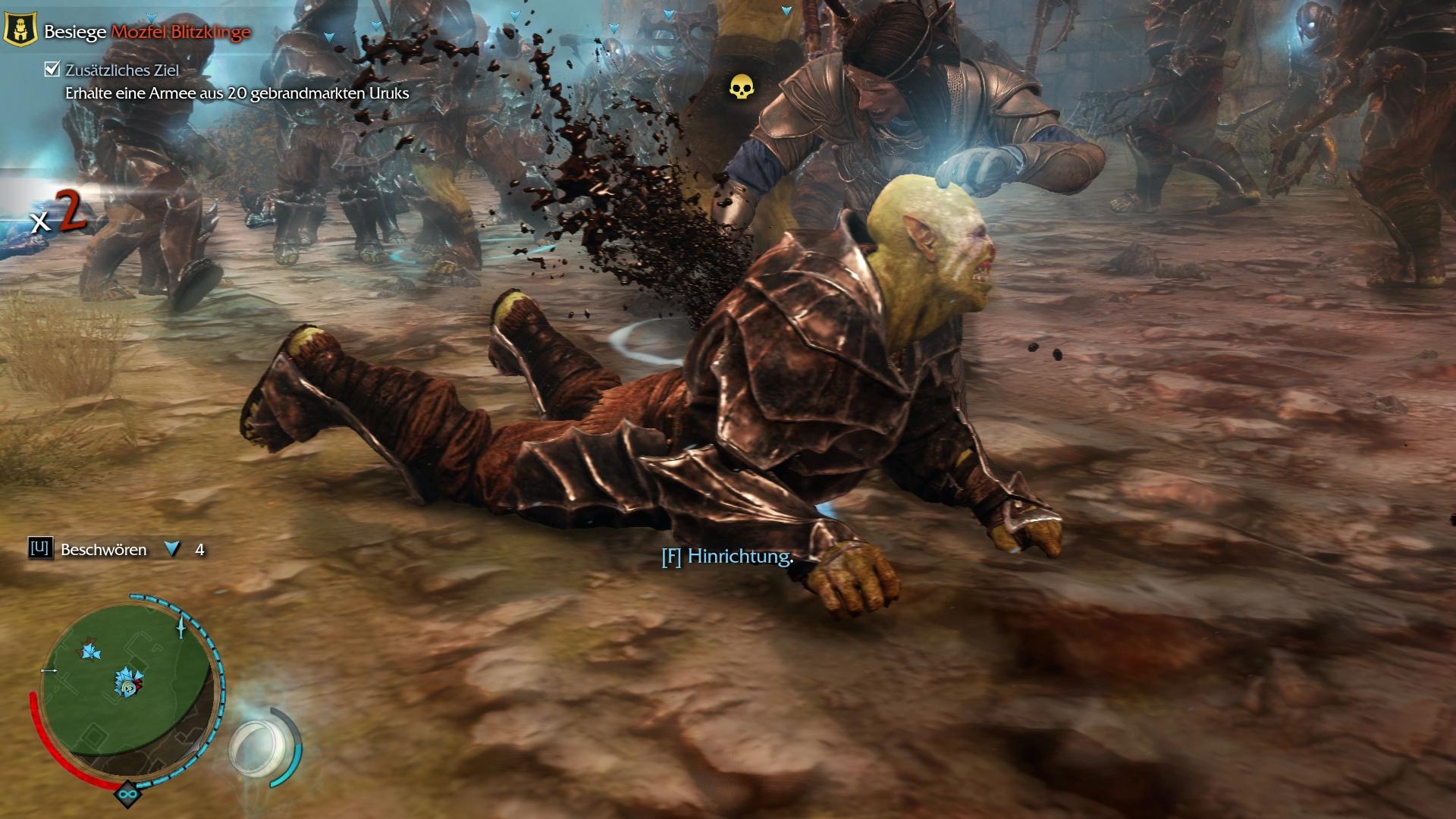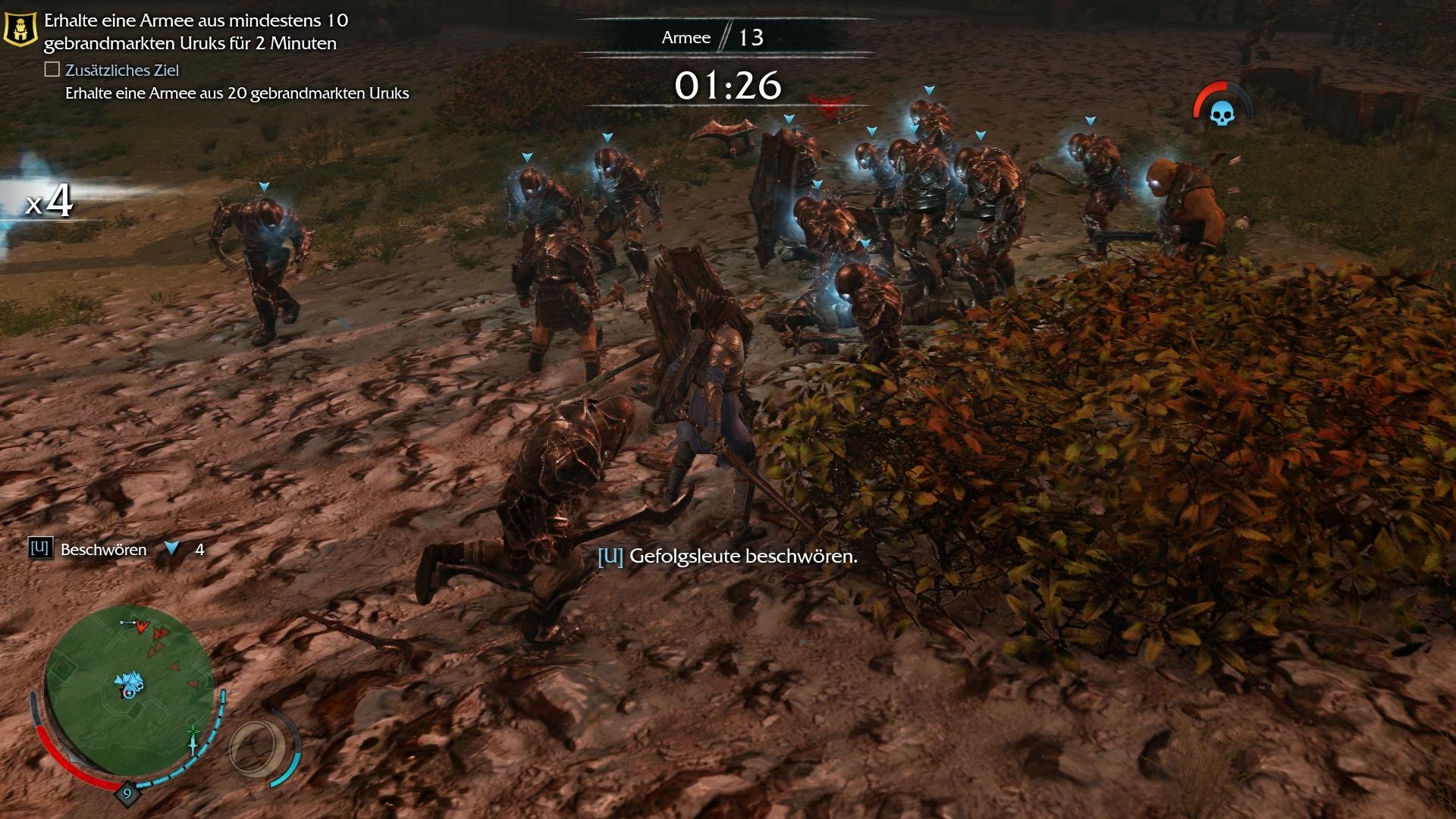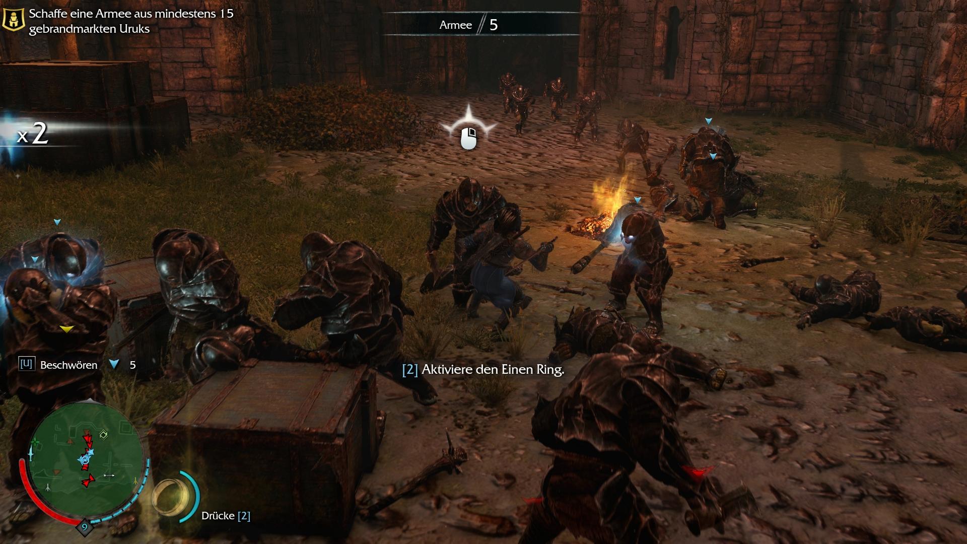 Sollte die Anzahl der eigenen Uruks auf 11 oder sogar 10 zehn fallen, beschwört zusätzliche Uruks oder setzt euren Ring ein und spammt Geisterblitze. Da ihr pausenlos Uruks konvertiert, könnt ihr den mitunter auch mehrfach während des Auftrags einsetzen.