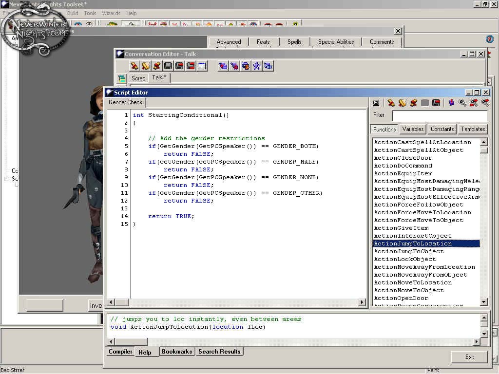 Einige von uns sind Hobbygärtner und werden mit Genugtuung hier verweilen, mit einem wunderbaren Konversationsbaum, den die Welt noch nicht gesehen hat. Doch ein paar von uns bevorzugen es, mit tiefgründiger Magie hinter den Worten unserer Charaktere zu arbeiten, weshalb wir uns möglicherweise wünschen, dass unsere Charaktere verschieden auf Helden mit unterschiedlichen persönlichen Zügen, Geschlecht oder Rasse reagieren. Oder eventuell ist die Reaktion anders, wenn unser Held einen bestimmten Gegenstand bei sich trägt, oder eine bestimmte Situation unserer Geschichte durchlebt hat. Oder vielleicht wollen wir, dass unsere Charaktere gewisse Aktionen vollführen, während sie sprechen, sich vor dem Helden verbeugen oder ihnen zuwinken, während er durch die Straße zieht. Möglicherweise wollen wir die Unterhaltung auch mit Sprachausgabe und anderen Geräuschen unterlegen, um die anderen Sinne ebenfalls zu beschäftigen. All dies wird spielend leicht im Konversationseditor möglich gemacht, jedes wiederum durch seine eigenen Bibliotheken. Wie mit allem, was wir bei unserem letzten Treffen besprochen haben, ist die Bibliothek zur Hilfe und nicht als Begrenzung gedacht. Wenn ihr eure eigenen Details einbringen wollt, könnt ihr das tun, indem ihr unser zweites fortgeschrittenes Werkzeug benutzt, den Skript-Editor.