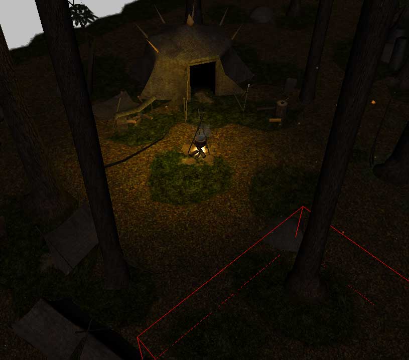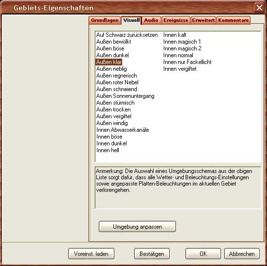 Zu Anfang haben wir über eine regnerische Nacht geredet. Davon habt ihr bei eurem Spaziergang sicherlich nichts bemerkt. Doch dazu kommen wir jetzt. Wählt aus dem "Bearbeiten" Menü die Gebiets-Eigenschaften aus und klickt darin auf "Visuell". Hier gibt es eine Reihe von vorgefertigten Wetter- bzw. Beleuchtungsszenarios. Aber es ist so einfach, ein eigenes zu entwerfen, darum wollen wir es uns das nicht entgehen lassen. Wählt zunächst ein einigermaßen passendes aus, wie z.B. "Außen stürmisch" und drückt dann auf "Umgebung anpassen".