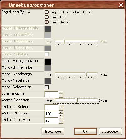 Es öffnet sich das Fenster der Umgebungsoptionen. Da unser Gebiet primär Nachts spielen soll, wählen wir der Einfachheit halber "immer Nacht" aus. Die Mond-Hintergrundfarbe definiert die Farbe des reflektierten Lichts. Für ein normales Waldstück würde ich hier ein dunkles Grün empfehlen, was dem Szenario einen moosähnlichen Touch verleihen würde. Für unser derzeitiges Ziel ist jedoch Schwarz angebracht. Mond Diffuse-Farbe ist das Licht, was der Mond selbst abstrahlt. Weiß würde somit den Eindruck eines Vollmondes erwecken. Für unsere Lichtverhältnisse ist ein sehr dunkles Grau aber passender.