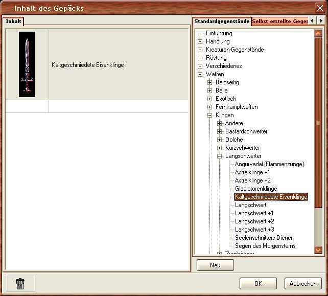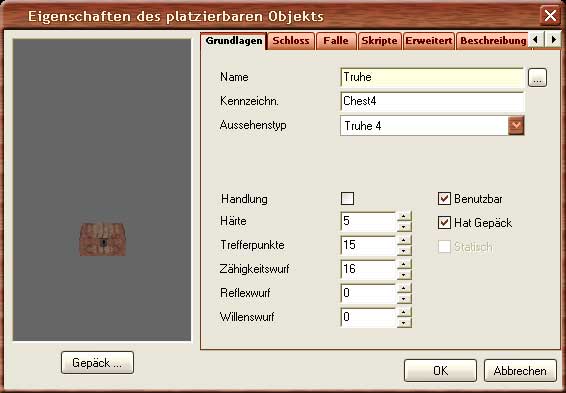 Wenn ihr etwas bestimmtes in eine Truhe legen wollt, müsst ihr die Eigenschaften dieser verändern. Drückt dazu mit der rechten Maustaste auf die Kiste und wählt "Eigenschaften" aus. Das Eigenschaftenfenster des platzierten Objektes öffnet sich. Hier könnt ihr Dinge wie Attribute, Beschreibung, Fallen oder ähnliches festlegen. Aber das geht für unser Einführungstutorial etwas zu weit. Für den Moment wollen wir die Truhe lediglich füllen. Wählt hierzu "Benutzbar" und "Hat Gepäck" aus, falls das noch nicht der Fall sein sollte. Klickt anschließend auf den "Gepäck" Knopf und ihr landet im Inhalt des Gepäcks. Wo ihr wiederum eine Auswahlliste der Standardgegenstände zur Auswahl habt. Sucht euch ein oder zwei Gegenstände aus, die euch gefallen, und zieht sie per Drag & Drop in das Inhaltsfenster (linke Hälfte) der Kiste. Wenn ihr die Eigenschaften des jeweiligen Gegenstandes betrachten/verändern wollt, könnt ihr entweder in eurem Inhaltsfenter mit der rechten Maustaste darauf klicken, oder zuvor in der Auswahlpalette über die rechte Maustaste "Kopie bearbeiten" selektieren. Wollt ihr nun noch den Zufallsschatz loswerden, braucht ihr nur die beiden Skripte bei "OnDeath" und "OnOpen" entfernen.