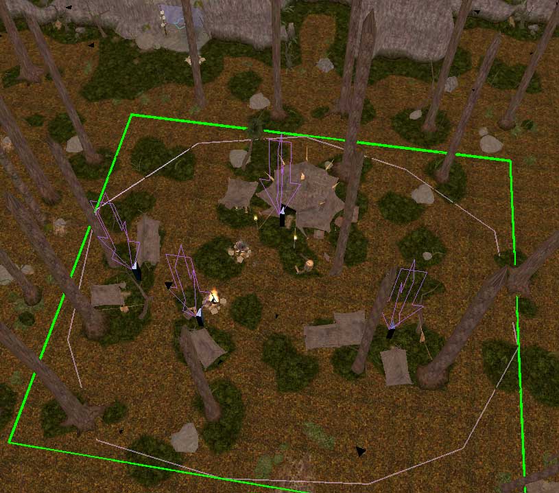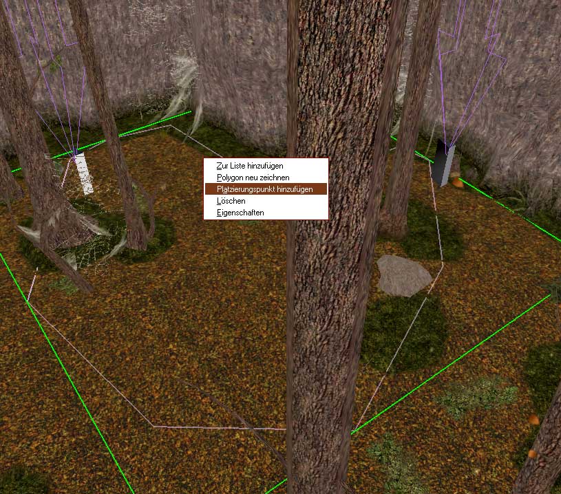 Jetzt fehlen nur noch die Platzierungspunkte, drückt innerhalb des Hauptfensters die rechte Maustaste und wählt "Platzierungspunkt hinzufügen". Das ruft einen kleinen Kasten mit einem riesigen, grauen Pfeil darauf hervor. Es wäre wohl angebracht, das Lager so aussehen zu lassen, als würden die Orks aus den Zelten kommen, also platziert vor jedem Zelteingang am Besten einen Punkt.