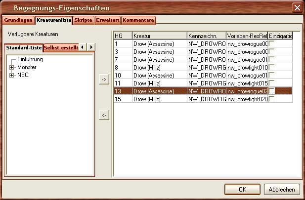 Auch bei den Dunkelelfen beginnen wir so. Sie sind ebenfalls in der Palette unter "Elfen, Drow" anzutreffen. Nur sollten wir diese Begegnung ein wenig spezifizieren. Als Platzierungspunkt würde ich übrigens einen der Höhleneingänge bestimmen. Wenn ihr das erledigt habt, drückt einmal die rechte Maustaste und wählt die "Eigenschaften" der Begegnung aus. Im "Grundlagen" Reiter könnt ihr, wenn ihr wollt, den Schwierigkeitsgrad variieren und die Mindest- und Höchstzahl von gleichzeitig zu erzeugenden Drows einstellen. 6 und 3 scheint mir für die grade Zurückziehenden zu viel, setzt es ruhig auf 4 und 2 zurück. Die Platzierungsoption bestimmt, ob der Auslöser stetig Gegner nachproduzieren oder nur einmalig auswerfen soll. Einmalig reicht für unsere Zwecke voll und ganz aus. Wechselt zur Kreaturenliste (2. Menü). Hier seht ihr eine ganze Reihe von verschiedenen Dunkelelfen, die die Begegnung an Hand der Herausforderungsstufe hervorbringen kann. Die mächtigen Magier und Klerikerinnen dürften jedoch längst abgezogen sein, entfernt sie also aus der Liste. Oder lasst einen drin und wählt für in die "Einzigartig" Option, damit er nur einmal erzeugt wird.