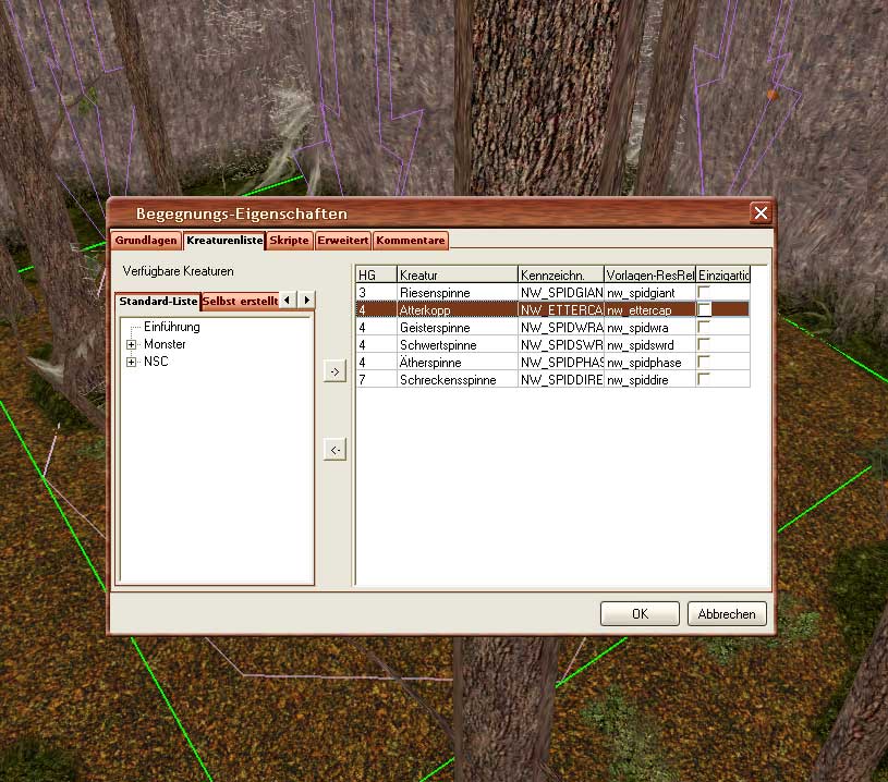 Weiter geht es mit den Spinnen. Begebt euch zu eurer Spinnennetzverhangenen Waldstelle zurück und wählt "Ungeziefer, Spinnen" aus der mittelschweren Palette. Verfahrt wieder wie bei den Orks und gebt sowohl Auslöser als auch mehrere Spinnennetze als Platzierungspunkte an.