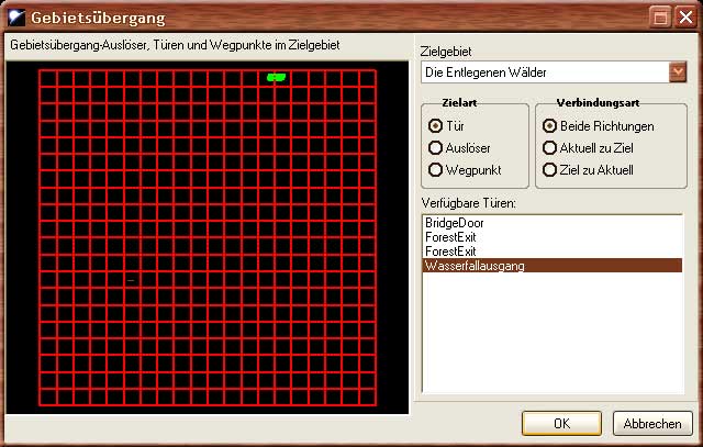 Wechselt auf die erste Karte, sucht euch dort ein entsprechendes Gegenstück aus und benennt auch dieses passend. Wo ihr grade im Tür-Eigenschaftenmenü seid, könnt ihr da auch bleiben. Wechselt zum "Gebietsübergang" Reiter, gebt als Zieltyp "Tür" an und drückt den "Gebietsübergang erstellen" Knopf. Jetzt könnt ihr den Ausgangspnukt des Gebietsübergangs auswählen. Wie ihr seht, bietet euch das Werkzeugset alle Türen der derzeitigen Karte an. Wechselt das "Zielgebiet" zu den "Entlegenen Wäldern" und sucht euch aus den verfügbaren Türen die Kennzeichnung aus, die ihr vorhin angegeben habt. Achtet darauf, dass die Verbindungsart auf "Beide Richtungen" steht und bestätigt den Übergang. Das war es.