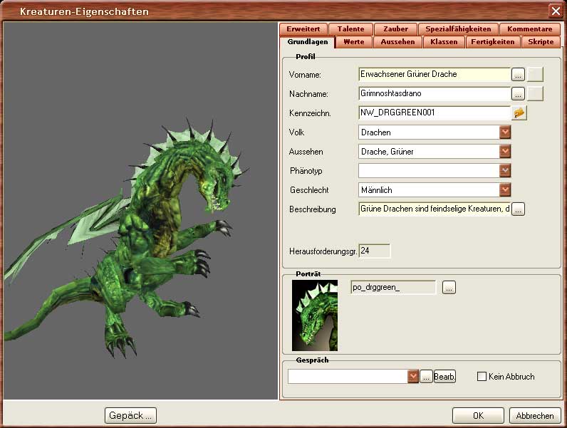 Der Legende nach hat sich Grimnoshtasdrano seit 65 Wintern in den endlosen Höhlen eingenistet. Wie wäre es also mit einem grünen Drachen, der einen der Höhlenausgänge bewacht? Das bedeutet nicht, dass die Spieler Grimnosh bekämpfen sollen, dazu sind sie dann wahrscheinlich doch zu schwach. Grimnosh trägt nicht ohne Grund den Titel Rätseldrache, aber dazu später mehr. Öffnet die Kreaturenleiste und die darin enthaltene Monsterpalette. Wie üblich bekommt ihr die verschiedensten Monstergattungen zu Gesicht. Die Drachengruppe ist in wiederum in 4 Typen und 10 Farben untergliedert. Der Rätseldrache ist bekanntlich grün und nicht sonderlich alt, ich würde einen "Erwachsenen Grünen Drachen" vorschlagen.
