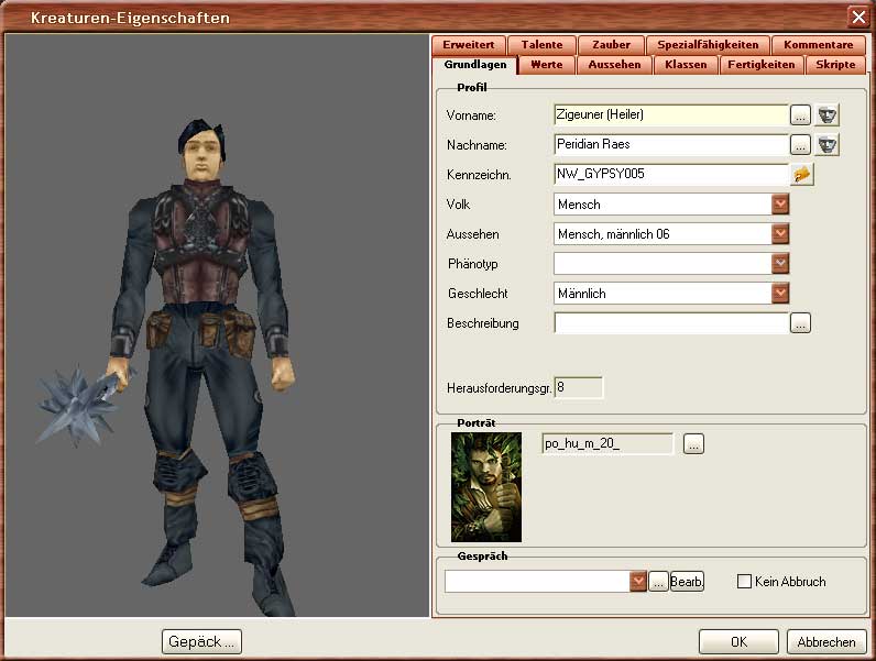 Was uns jetzt zu guter Letzt fehlt, ist der Waldläufer, Peridian Raes. Ich sehe grade, den gibt es in eurer Palette ja noch gar nicht. Nun gut, nehmt einfach etwas ähnliches. Ein Zigeuner (Heiler) aus der NSC/Menschenpalette kommt dem gewissermaßen nahe. Setzt ihn hinter das Lagerfeuer, von dem unsere Abenteuer in der Dunkelheit der Nacht quasi angezogen werden.