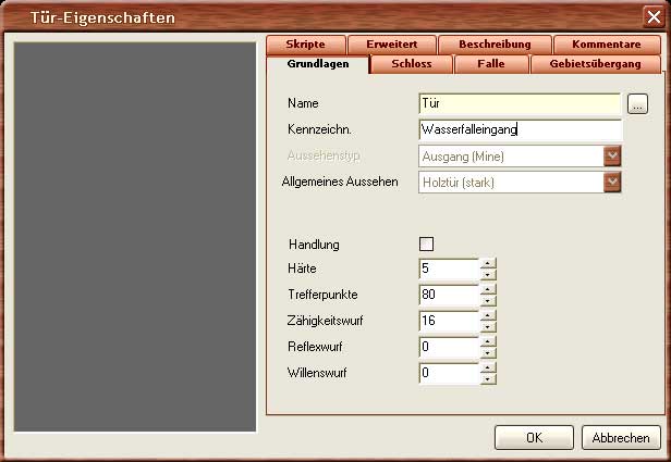 Jetzt haben wir zwei Gebiete, aber wie gelangen die Spieler von einem in das andere? Dazu müsst ihr einen sogenannten Gebietsübergang erstellen. Bevor wir diesen festlegen können, solltet ihr den entsprechenden Türen/Höhlen jedoch bessere Namen geben. Nehmt euch die 3. Höhlenöffnung vor und klickt wie üblich mit der rechten Maustaste darauf, um die Eigenschaften hervorzurufen. In das Feld "Kennzeichnung" gehört der passende Name, ich habe in dem Fall "Wasserfalleingang" gewählt, da das gegenüberliegende Stück einen solchen eingebaut hat.