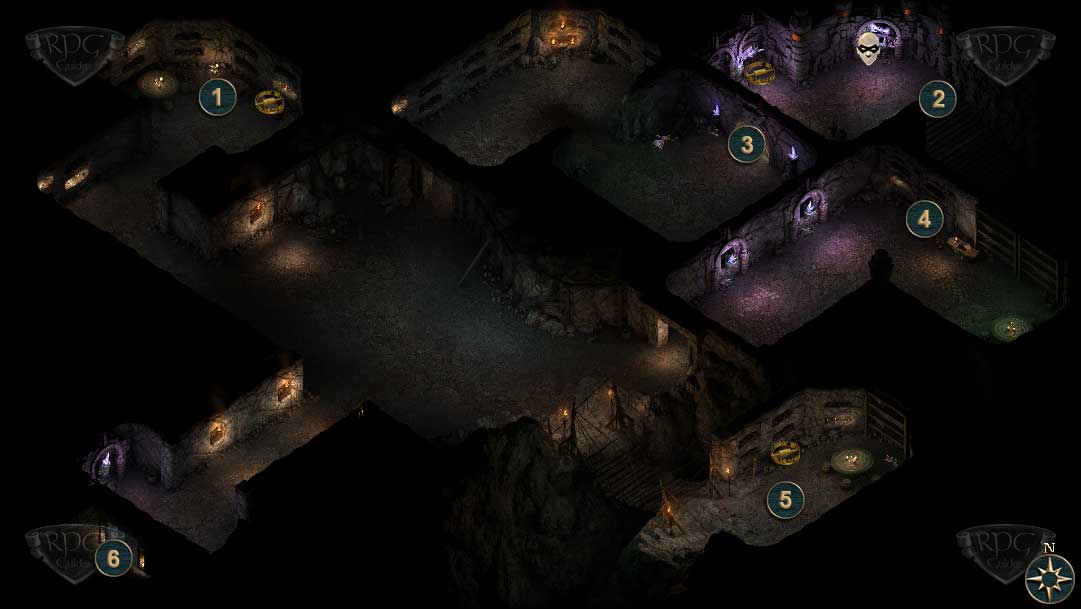 Die Katakomben gehören den ursprünglichen engwithanischen Arbeitern, die unter Einsatz ihres Lebens die gigantische Adra Statue errichteten. Sobald ihr diese Ebene von Od Nua gesäubert habt, hören die Angriffe von Skeletten auf Caed Nua auf. Das bedeutet jedoch, dass ihr zunächst auf dieser Ebene unzählige Skelette in Form von Kämpfern, Bogenschützen und Zauberern bezwingen müsst. Die Treppe zu Ebene 7 [2] wird durch eine schwere Doppeltür [3] versperrt, die sich nur mit drei Aufsehersiegeln öffnen lässt. Das Blutstein-Aufsehersiegel solltet ihr bereits auf Ebene 4 gefunden haben. Das Peridot-Aufsehersiegel liegt in dem Sarkophag im Nordwesten [1] und das Saphir-Aufsehersiegel im Südosten [5]. Beide Särge sind mit Stufe 5 Fallen versehen. In letzterem Raum ist übrigens ebenfalls "Hirbels Schutzhaut" (Mittelschwere Rüstung) zu finden. Am Tor selbst [3] spricht euch ein verirrter Geist an, von dessen Leichnam ihr eine weitere Seite des Expeditionstagebuchs bekommt und damit Hinweise zum Öffnen des Tores.
