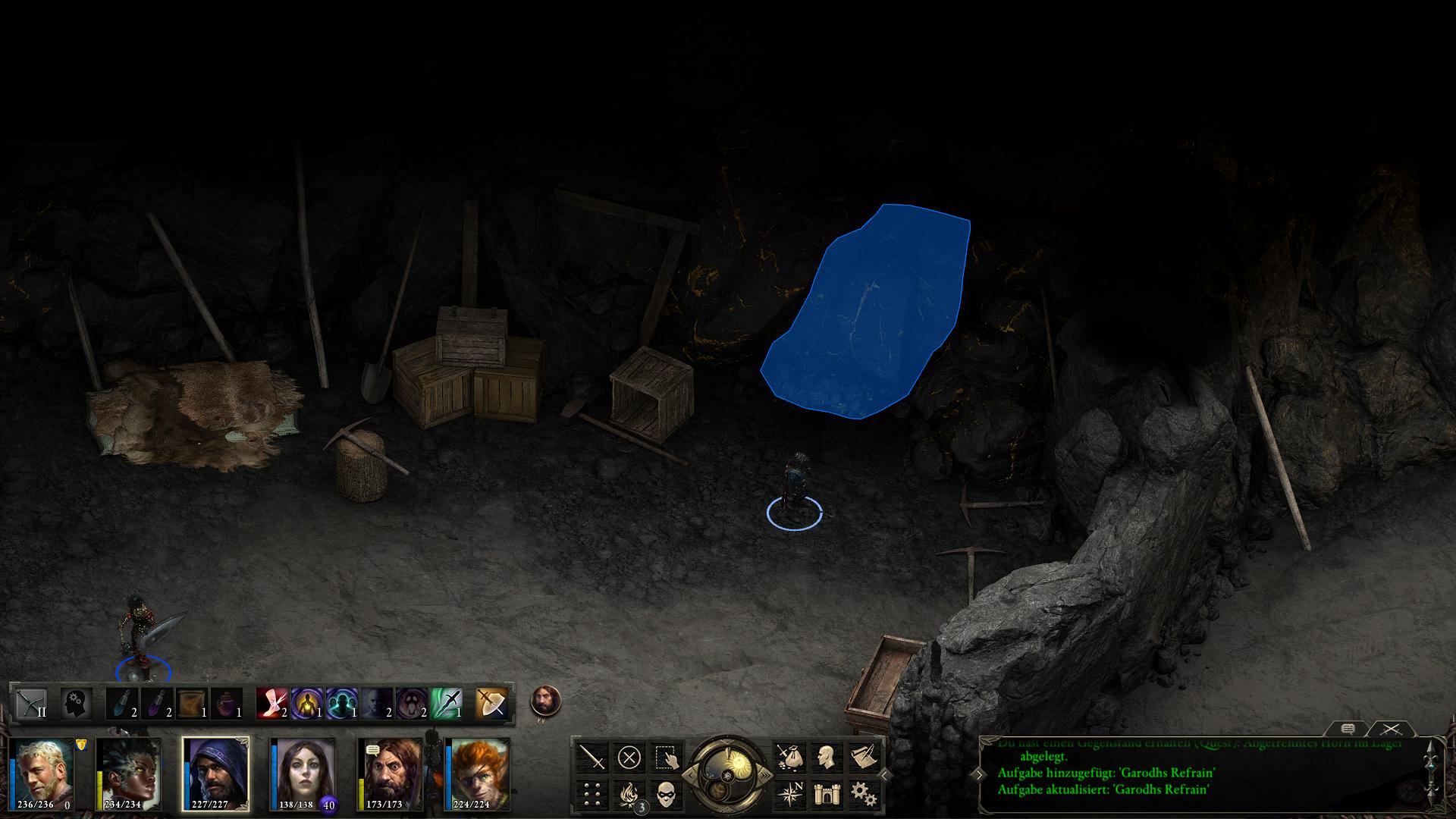 Ob ihr nun über die Treppe [4] oder den Eistunnel [7] in die untere Höhle gelangt seid, ist euer nächstes Ziel die Treppe zur Halle der Oger-Matronin [1] im Nordwesten. Direkt davor leuchten drei Obelisken. Bei ihnen handelt es sich um Fallen, die über einen Kontakt am Boden ausgelöst werden und ihr wie üblich entschärfen müsst. Wollt ihr Konfrontationen aus dem Weg gehen, seid ihr über den Eistunnel [7] gekommen und solltet jetzt südlich am See vorbei laufen. So begegnet ihr maximal einer Patrouille, die um den See läuft. Oberhalb des Sees sind hingegen mehrere Lagufaeth. In der kleinen Sackgasse neben der Rampe hoch ist ein Versteck, in dem ihr die "Haut des Wanderers" (leichte Rüstung) liegt. Wollt ihr die optionale "Garodhs Refrain" Quest erledigen, finden ihr das erste Teil, abgebrochenes Horn, in der Mine [2]. Dadurch erhaltet ihr eine Vision von Garodh und beschließt, dass er möglicherweise in Frieden ruhen kann, wenn ihr den Helm aus den drei Teilen wieder zusammensetzt.
