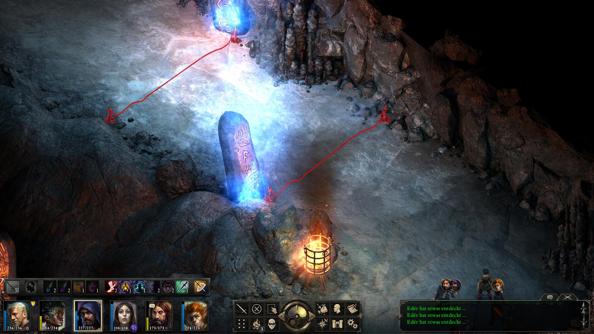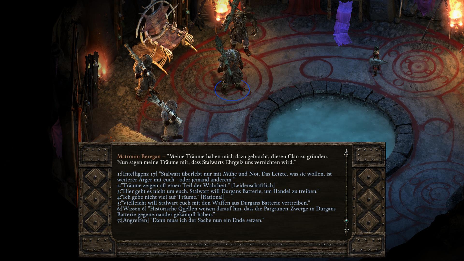 Die Verhandlungen mit Matronin Beregan sind selbst mit niedrigen Attributen problemlos friedlich zu lösen. Die Diskussion erfordert lediglich gegen Ende zwingend Intelligenz 13 oder Entschlossenheit 12, um nicht im Kampf zu enden, was höchstwahrscheinlich die meisten Charaktere haben dürften. Wodurch ihr erfahrt, dass ihre Felsoger gar nicht hinter dem Angriff auf Stalwart stecken und ihr sogar Frieden aushandeln könnt. Obendrein überlässt euch Matronin Beregan bei geglückten Verhandlungen die "Batterie-Reliefkachel" für Durgans Batterie, das Expeditionstagebuch der Bleiernen Schlüssel Gruppe uvm. Selbstverständlich steht es euch ebenso frei, sie und ihr Gefolge zu töten. Dadurch erhaltet ihr obendrein noch den "Hüftgürtel des Sterblichen Schutzes" und einen magischen Ring. Außerdem hält euch dann keiner mehr davon ab die Truhe zu knacken (Schwierigkeitsgrad 10) und euch daraus eventuelle Armschienen oder dergleichen zu holen. Mit der Kachel im Gepäck kann es nun weiter zu Durgans Batterie gehen.