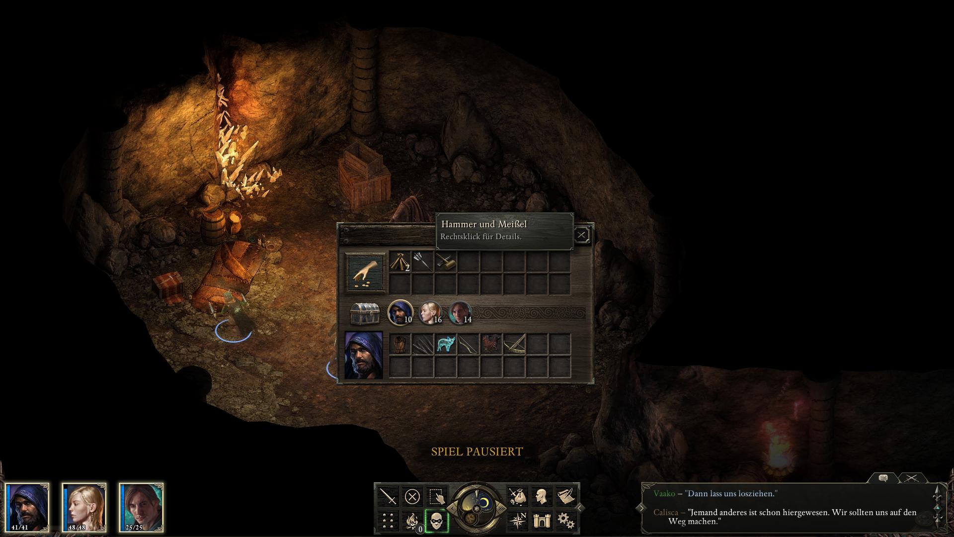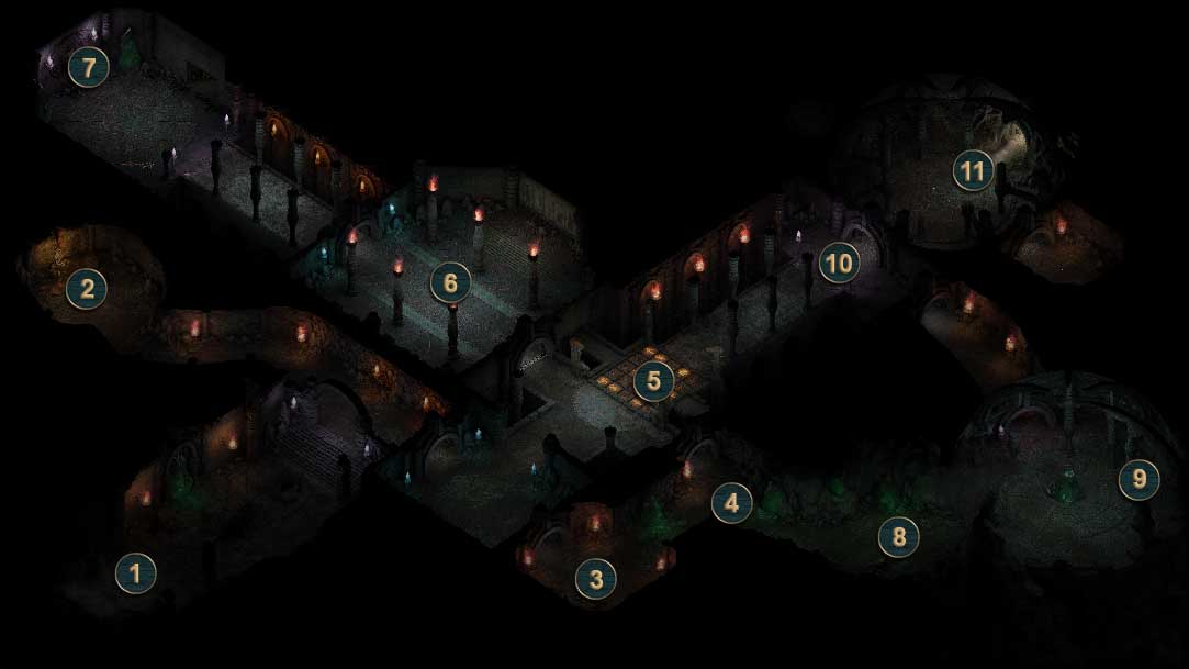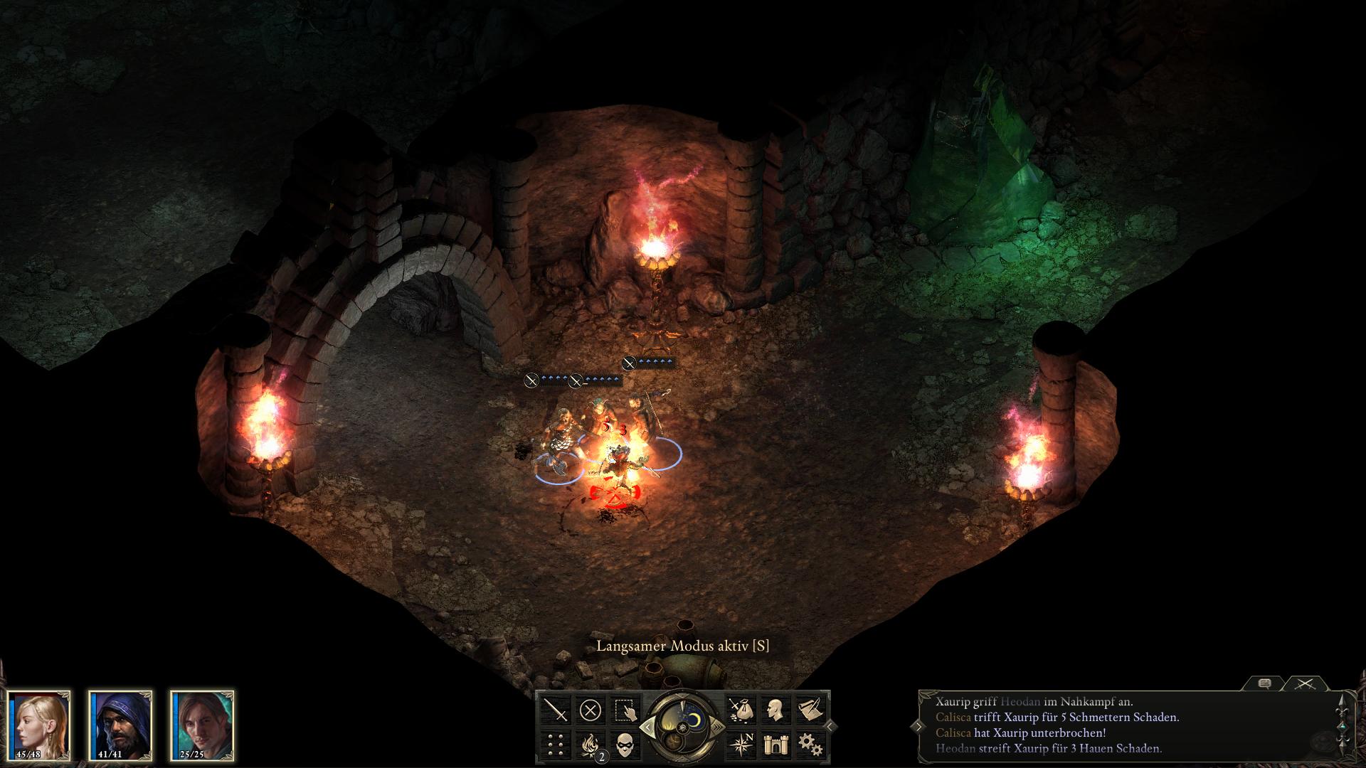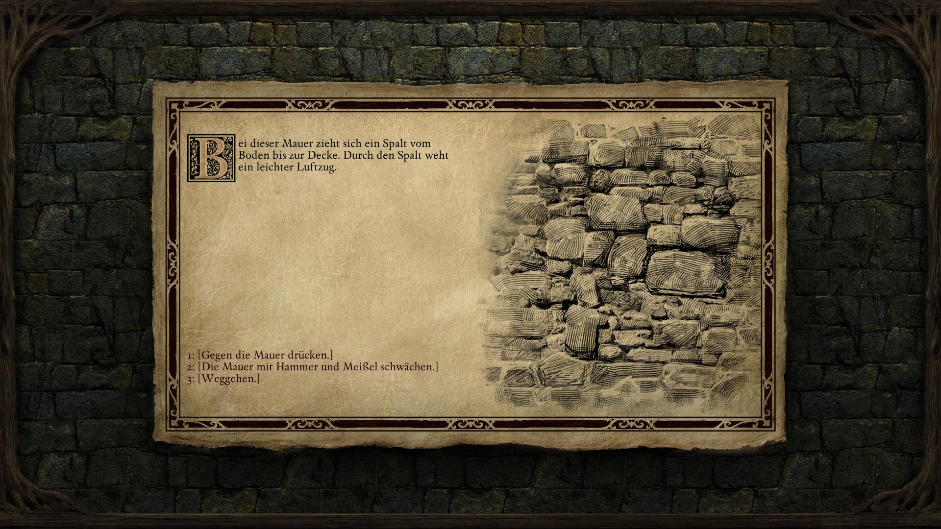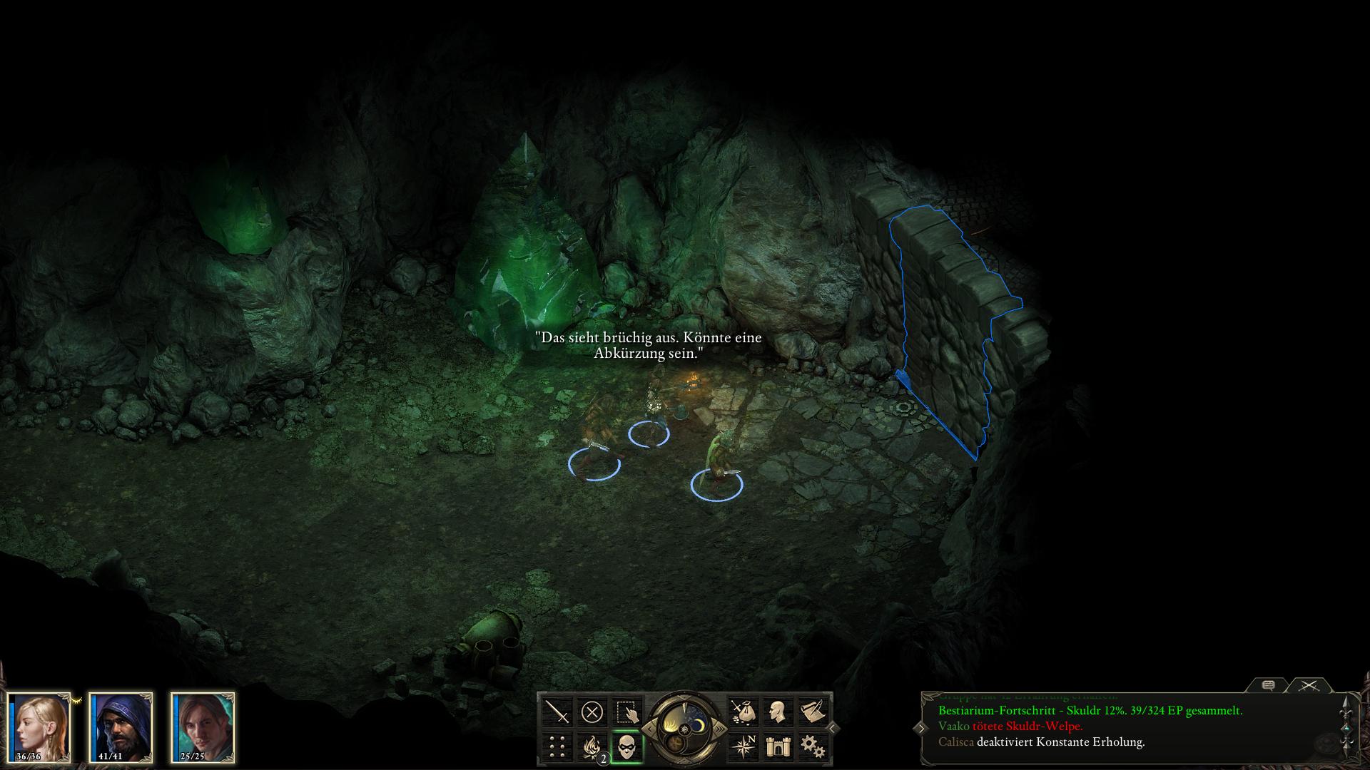 Es gibt nun zwei Wege zum Ausgang zu gelangen. Entweder über das Bodenplattenrätsel [5] im Zentrum oder durch die Mauer [8] im Osten. Wie Calisca vermutet, lässt sich die Mauer zum Einsturz bringen. Das geht über den typischen Interaktionsbildschirm. Ihr könnt entweder den gefunden Hammer und Meißel [2] dafür verwenden, oder einen Charakter mit 16 Macht (Might) oder mehr dagegen drücken lassen. Falls euer Hauptcharakter selbst nicht dazu in der Lage ist, lasst es Calisca machen, sie besitzt 17 Macht. Um die Mauer herum stehen zwei Skuldr-Welpen (einer davor und einer im Raum dahinter). Wenn ihr den ersten erledigt, erhaltet ihr Fleisch, was ihr dem Xaurip geben könntet. Da der zweite hinter einer Säule steht, könnt ihr euch an ihn im Schleichmodus heran schleichen und überraschen.
