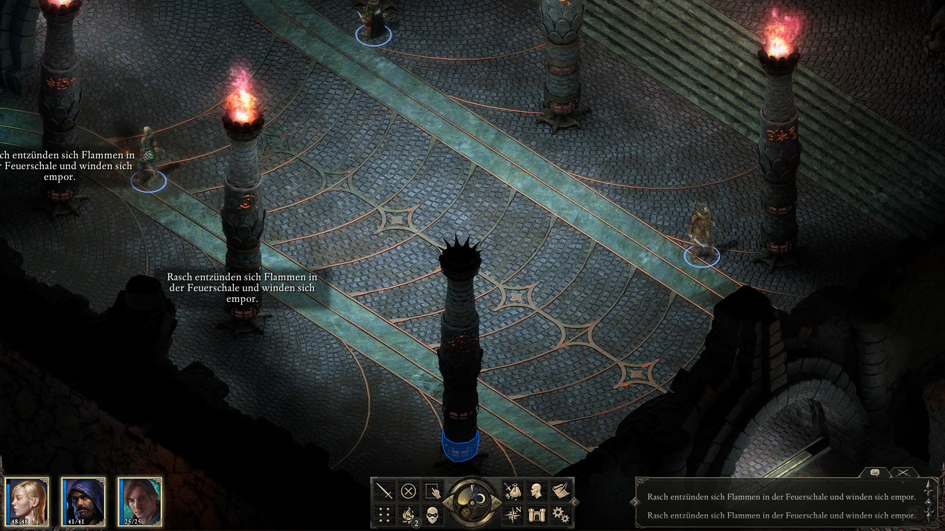Der Alternative Weg führt über das Bodenplattenrätsel [5]. Ein Schritt auf die falsche Bodenplatte löst ein tödliches Flammeninferno aus. Begebt euch in die Halle westlich davon [6]. Dort stehen sechs Säulen, auf denen ähnliche Symbole abgedruckt sind und an deren Fuße unangezündete Feuerschalen sind. Mit Caliscas Fackel, der aus dem ersten Lagerraum oder der Völker-Fähigkeit eines Feuer-Gottähnlichen, könnt ihr das Feuer entfachen. Macht das mit allen sechs Säulen und die Bodenplatten im Raum davor zeigen euch den richtigen Weg an. Somit stehen euch jetzt beide Wege aus den Ruinen offen.