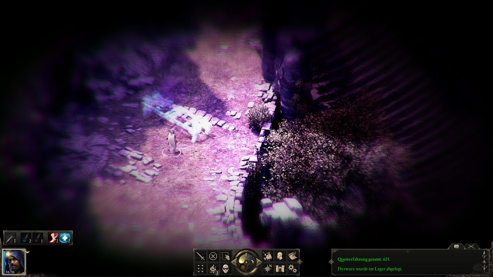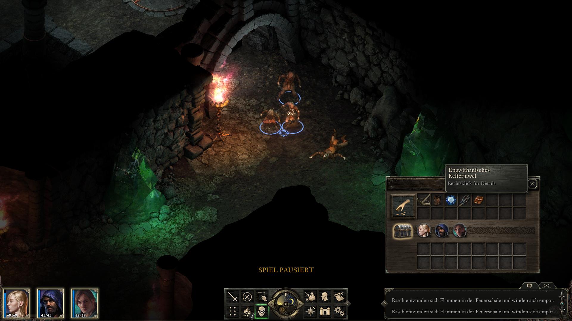 Wendet euch zunächst nach Nordwesten und plündert die Kisten im Lager [2] dort. Das bringt euch u.a. Hammer und Meißel ein. In südöstlicher Richtung steht ein vereinzelter Xaurip [3]. Ihr müsst ihn nicht töten, könnt stattdessen zurückweichen und ihn später mit Fleisch füttern. Aber es macht auch keinen Sinn ihn am Leben zu lassen. Nördlich von ihm direkt neben dem Torbogen liegt ein Leichnam [4]. Er trägt u.a. ein "Engwithanisches Reliefjuwel" bei sich. Steckt das ein.