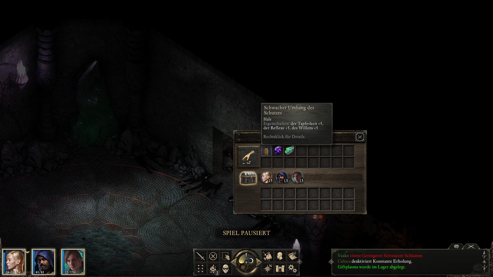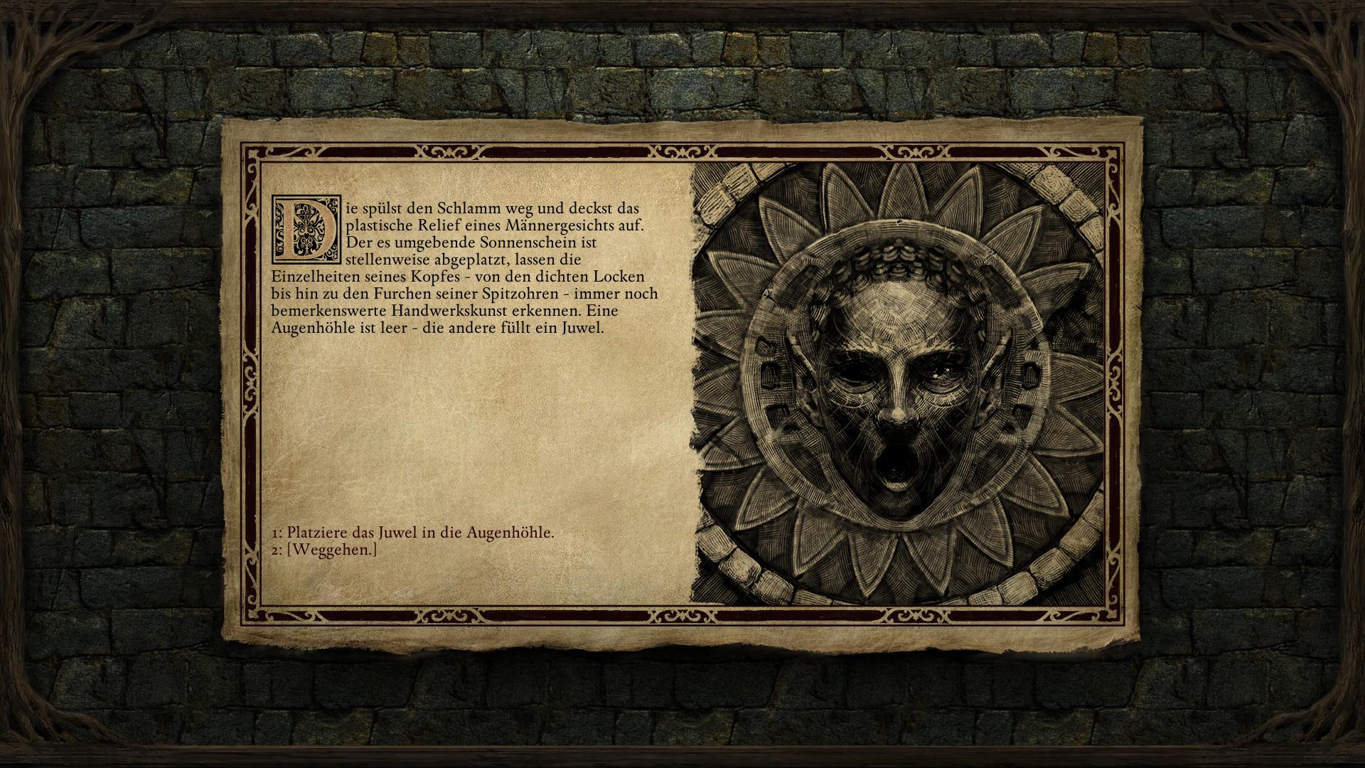 Bevor ihr entflieht, könntet ihr jedoch noch den optionalen Raum im Nordwesten [7] erkunden. Dort müsst ihr zunächst einen Geringen Schwarzen Schlamm bekämpfen und könnt euch anschließend ein gewaltiges Steingesicht in der Wand ansehen. Spült den schwarzen Schlamm mit eurem gefüllten Wasserschlauch ab und legt damit das Relief des Männergesichts frei. Wenn ihr das "Engwithanische Reliefjuwel" (Engwithan Relief Gem) bei euch tragt, könnt ihr es daraufhin in der Augenhöhle platzieren. Das öffnet die geheime Kammer der Halle. Nachdem ihr den zweiten Geringen Schwarzen Schlamm daraus bezwungen habt, könnt ihr die Kiste Plündern. Da drin ist u.a. ein "Schwacher Umhang des Schutzes", der für jeden Charakter nützlich ist. Idealerweise sollte er an euren Hauptcharakter gehen.