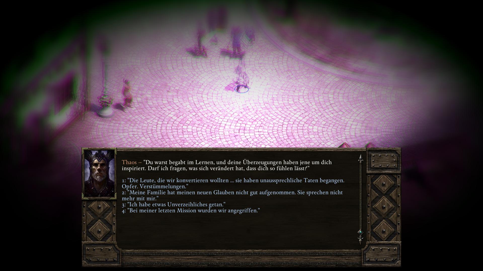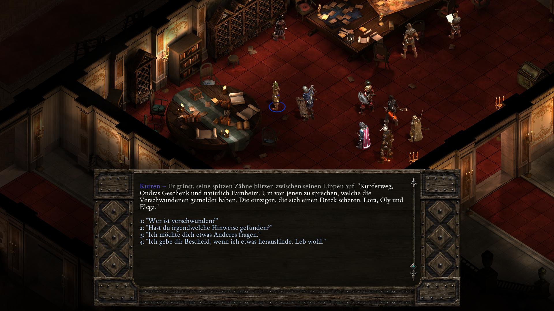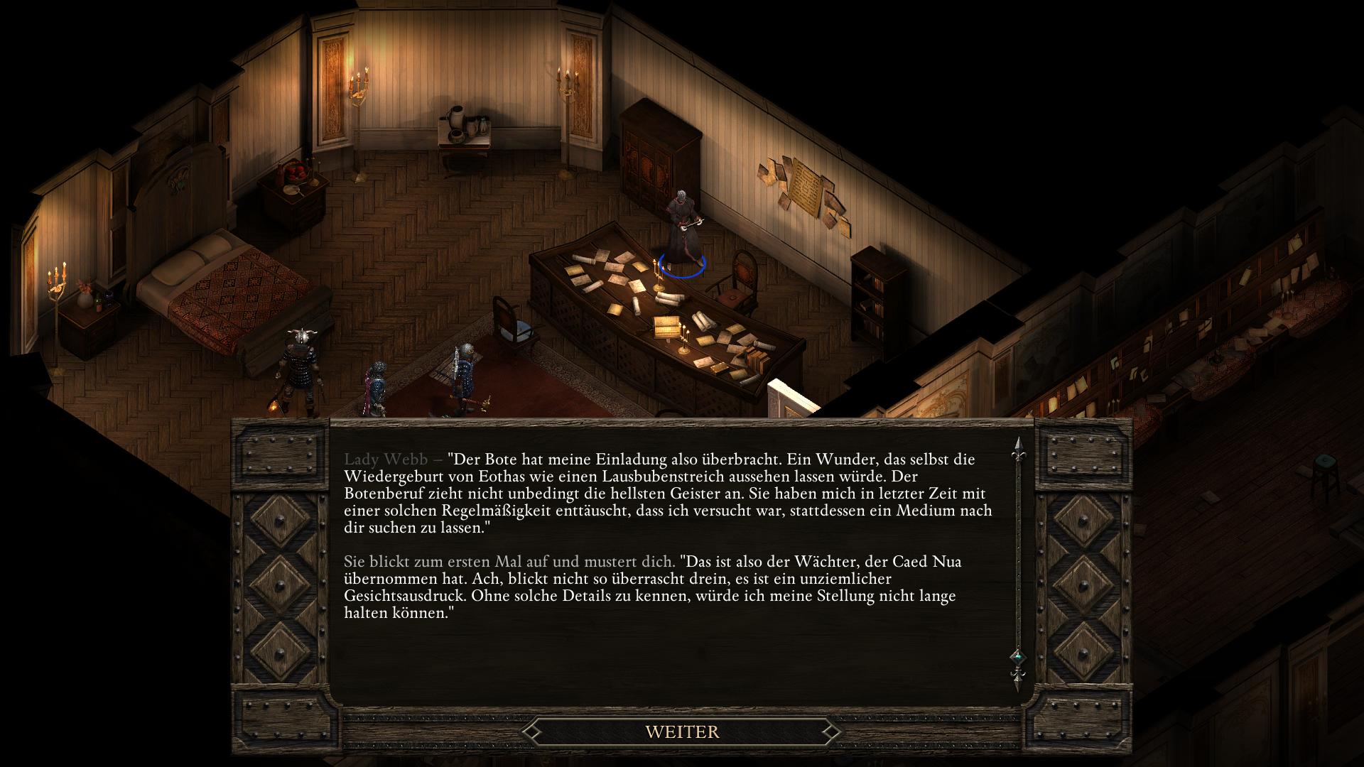 Die Dunrydstraße (Dunryd Row) ist eine Art Geheimdienst-Netzwerk und wird von der etwas älteren Dame geleitet, die eigentlich keine Gäste empfängt. Entsprechend gut weiß Lady Webb über euch bescheid. In dem Gespräch stellt sich heraus, dass ihr beide unabhängig voneinander versucht mehr über den Bleiernen Schlüssel zu erfahren. Lady Webbs Leute haben unzählige Male versucht die Organisation zu unterwandern und dabei allein dieses Jahr vier Medien verloren. Aber sie kann euch zumindest verraten, dass der Bleierne Schlüssel über 2.000 Jahre alt ist und Thaos ix Arkannon sein Gründer und Großmeister ist. Als einziges Lebewesen auf Eora gelingt es ihm nicht nur wiedergeboren zu werden, sondern das immer als exakt der selbe Mann.