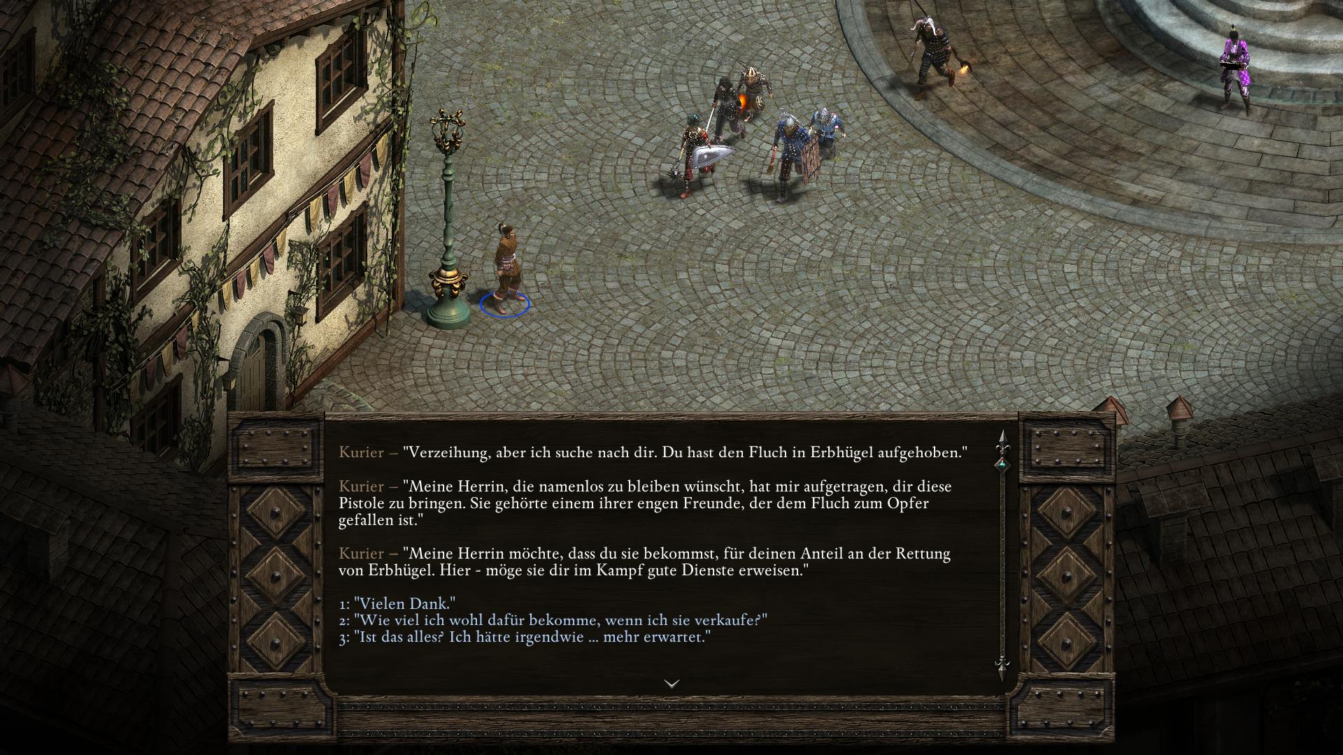 Unabhängig davon welche der drei Hauptaufgaben des zweiten Aktes ihr erledigt habt, wird euch bei Abschluss ein Bote des Hauses Hadret aufsuchen und zu Lady Webb einladen. Ihr findet das Anwesen im Südwesten [9] von Farnheim (Brackenbury). Auf dem Weg zum Haus Hadret erhaltet ihr eine neue Vision des Roben bekleideten Mannes, Thaos. Sie zeigt ein Umdenken im Charakter der Person, die ihr verkörpert. Thaos versucht ihn/euch jedoch auf seinen Pfad zurück zu führen. Als ihr das Haus Hadret letztlich erreicht, überbringt euch ein Kurier an der Haustür ein Geschenk in Form der "St. Gaurams Funke" (St. Garam's Spark) Pistole.