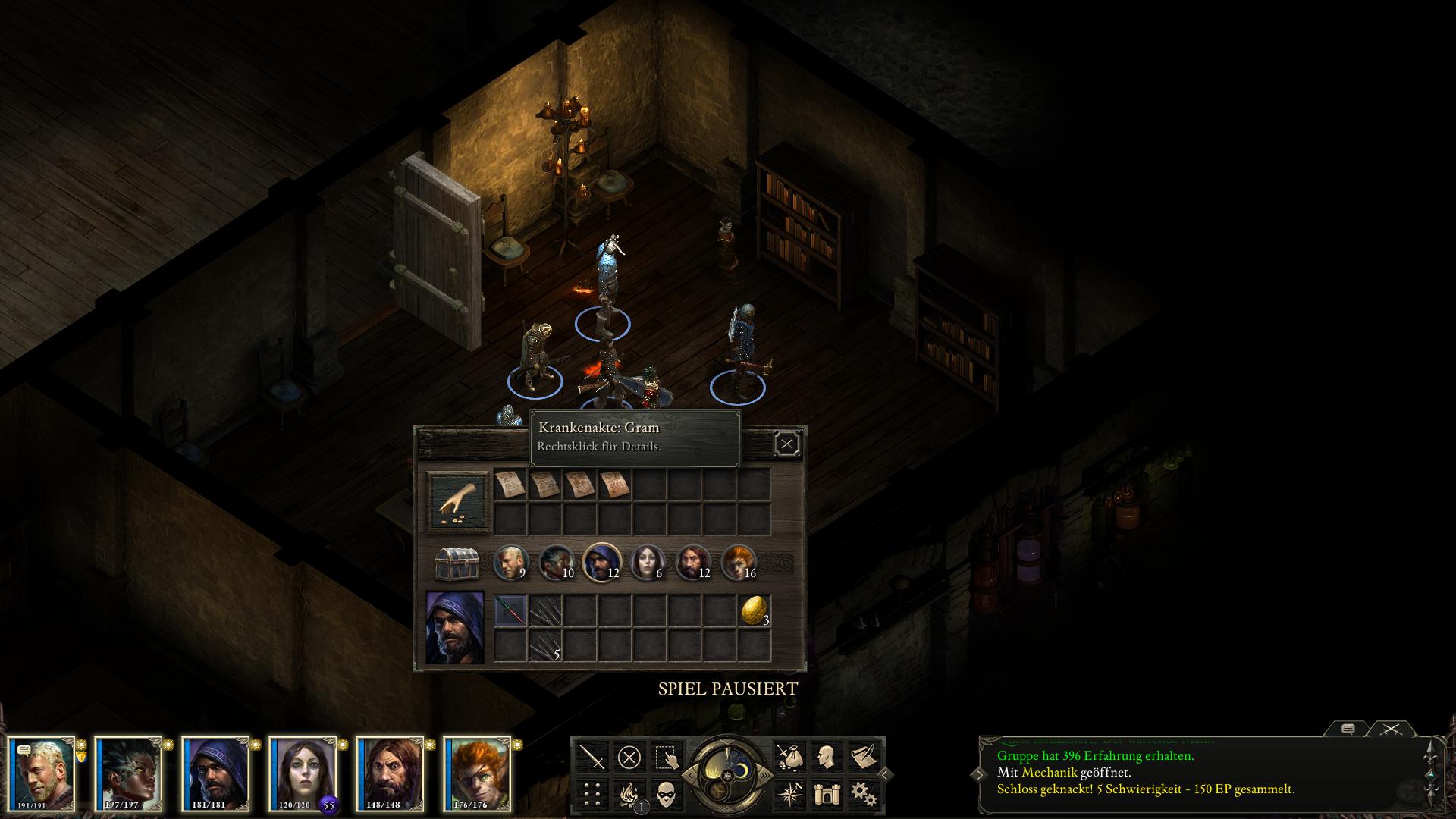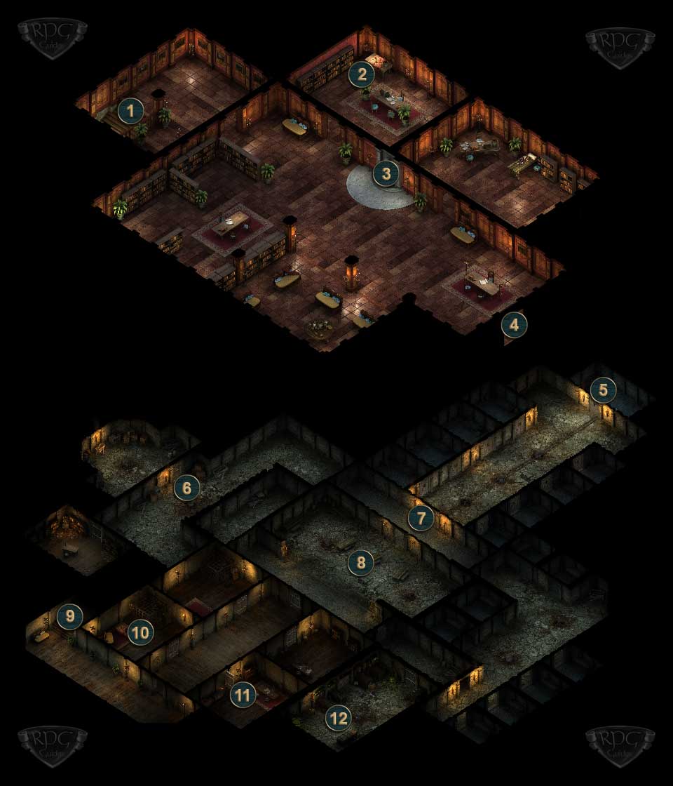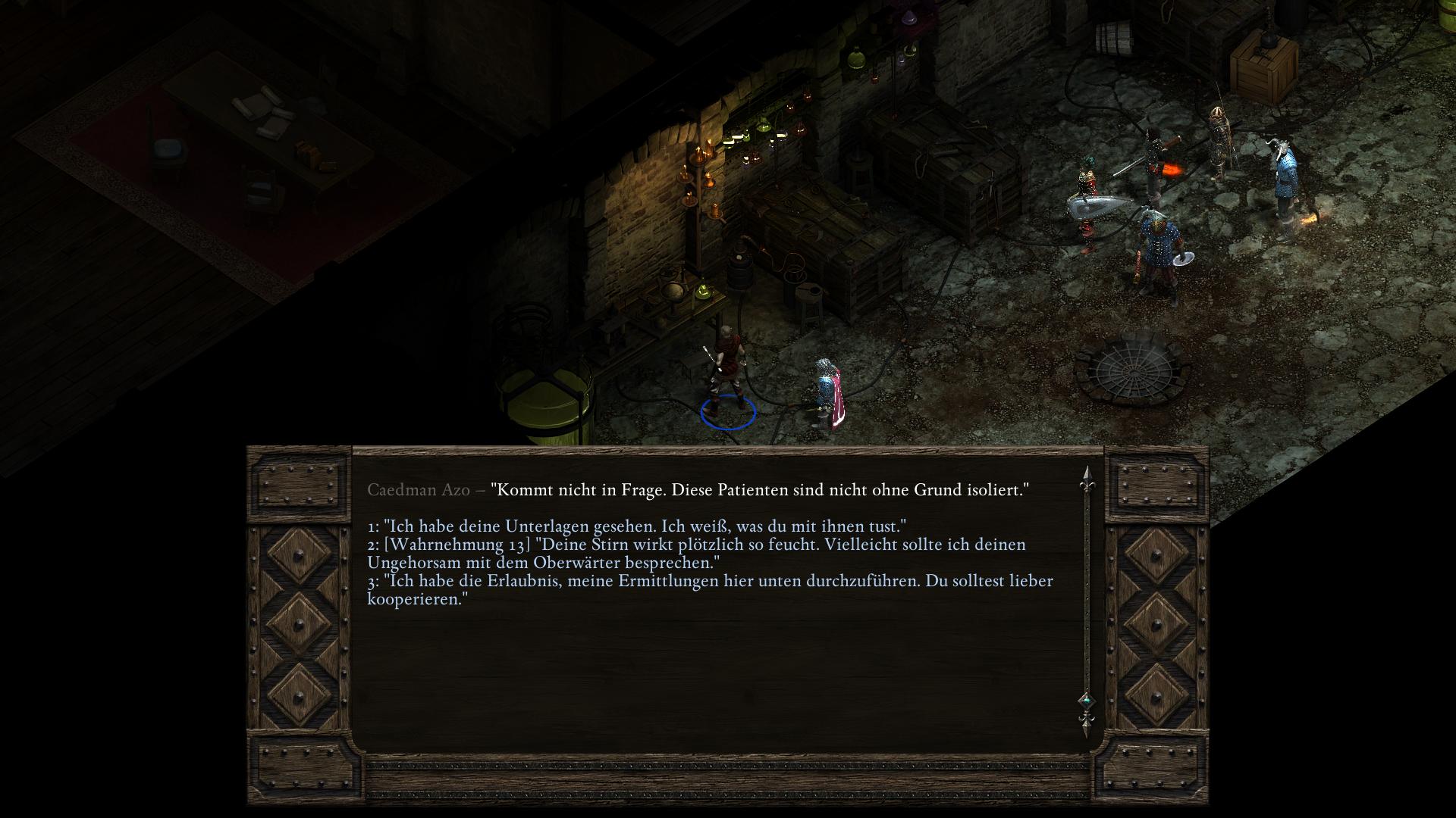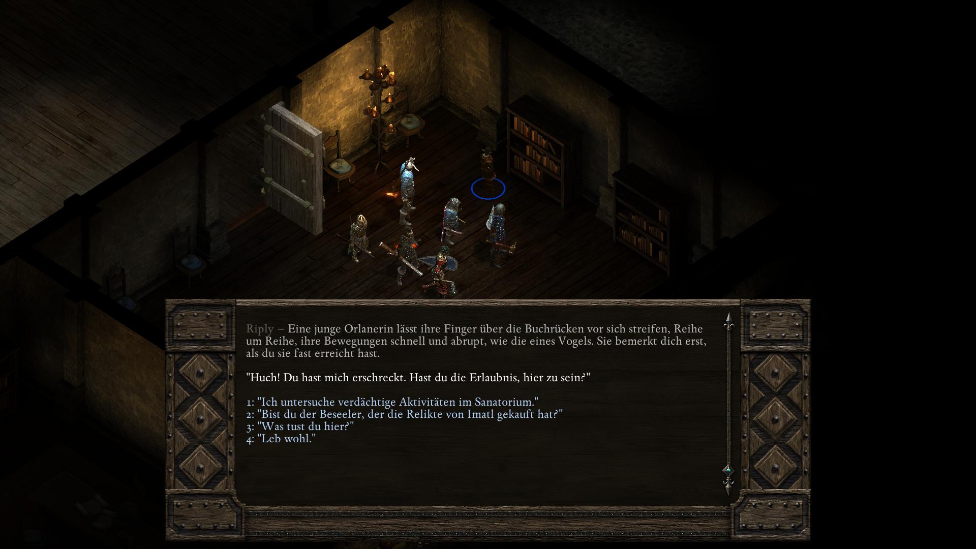 Falls ihr noch nicht hier wart und Aloth in eurer Gruppe habt, könnt ihr seine persönliche Quest nun von Bellasege [10] lösen lassen. Riplys Büro [12] ist euer nächster Anlaufpunkt. Ihr könnt die junge Orlanerin zu verdächtigen Aktivitäten im Sanatorium befragen, woraufhin sie Caedman Azo zur Sprache bringt. Alternativ könntet ihr euch auch Azos Notiz im Regal bemächtigen und daraus erfahren, dass er unerlaubt Experimente durchführt. Mit Mechanik 5 (oder Mechanik 4 + 5 Dietriche) gelangt ihr zusätzlich an die Krankenakten aus der Holzschatulle auf dem Schreibtisch, was einen weiteren Questeintrag über den "Mitternachtsmann" einbringt. Die Wachen am Ende des Ganges lassen euch leider nicht in den Patiententrakt zu Azo durch. Kehrt daher zunächst ins Erdgeschoss zurück und berichtet Oberwärter Ethelmoer [3], was ihr über Azo erfahren habt.
