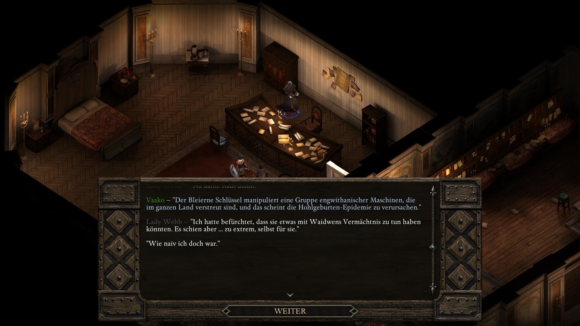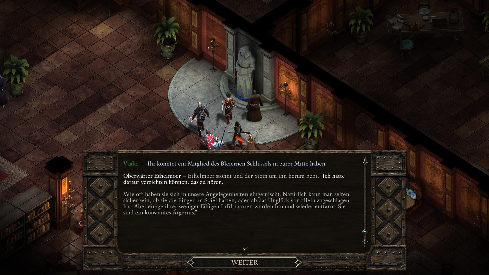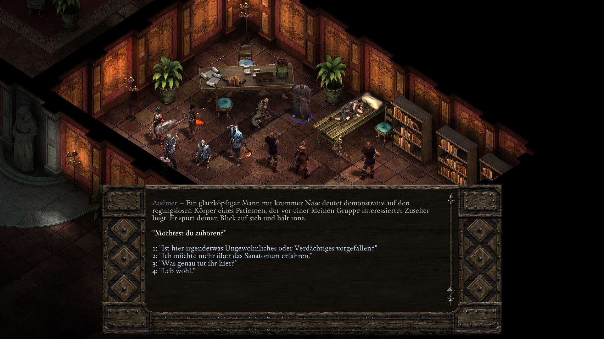 Wieder zurück in Farnheim (Brackenbury) könnt ihr Lady Webb einen Zwischenbericht über die jüngsten Ereignisse geben. Da euch das vor Abschluss der dritten Quest nicht direkt weiter bringt, ist euer neues Ziel das Sanatorium im Nordwesten von Farnheim. Mit dem permanenten Konzept des Seelenwanderung, habt ihr in Pillars of Eternity sicherlich schon einiges erlebt. Das Sanatorium treibt es jedoch zu einem neuen Höhepunkt. Der Leiter des Instituts, Oberwärter Ethelmoer, ist die Steinstatue [3] an der nördlichen Wand der Haupthalle. Konfrontiert Ethelmoer damit, dass einer seiner Patienten ein Mitglied des Bleiernen Schlüssel sein könnte. Er hätte auf diese Information zwar verzichten können, gibt euch aber die Erlaubnis im Sanatorium zu ermitteln. Befragt ihr daraufhin Audmer im Nebenraum zu ungewöhnlichen Aktivitäten, verweist euch dieser aufs Untergeschoss.