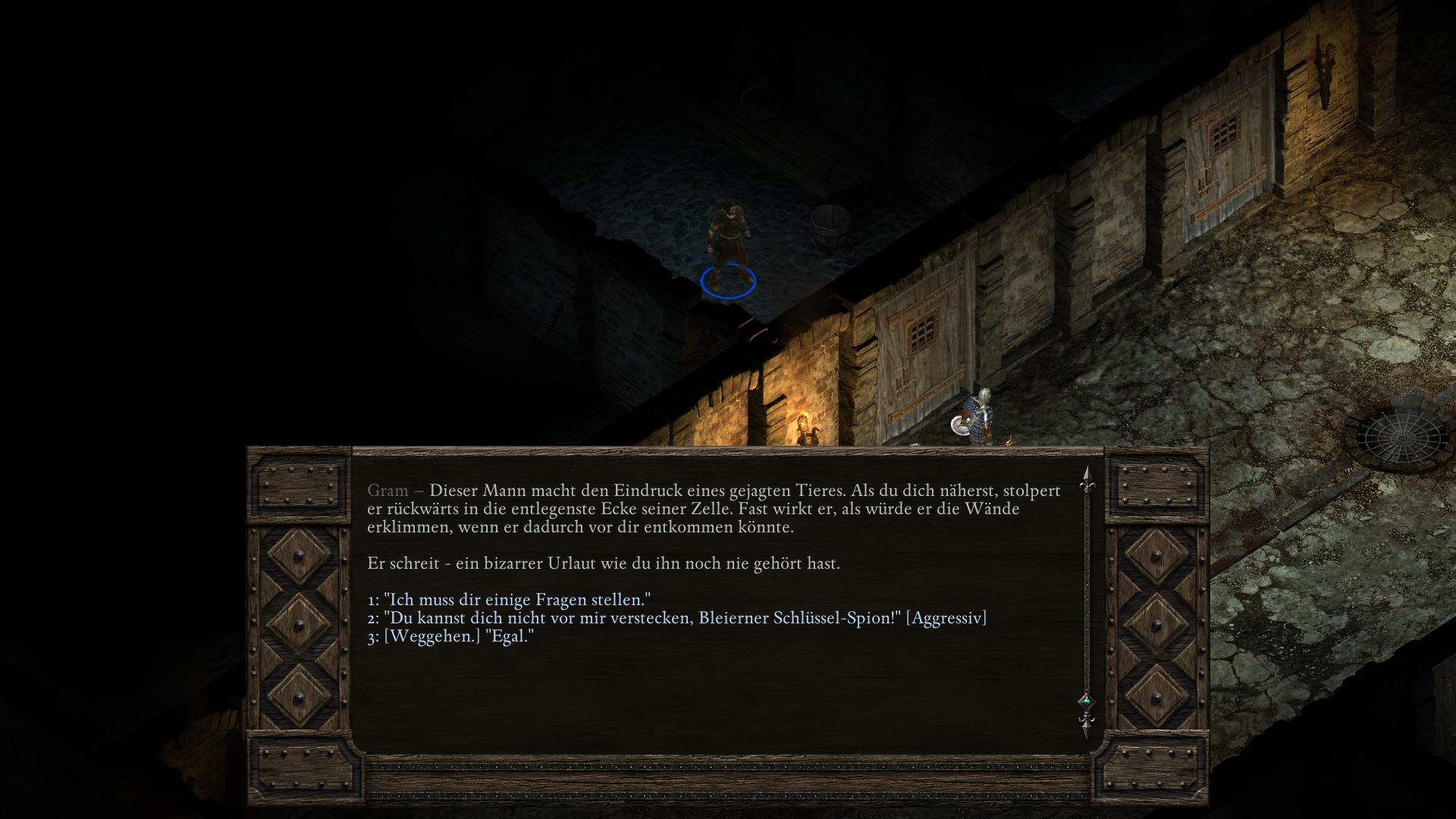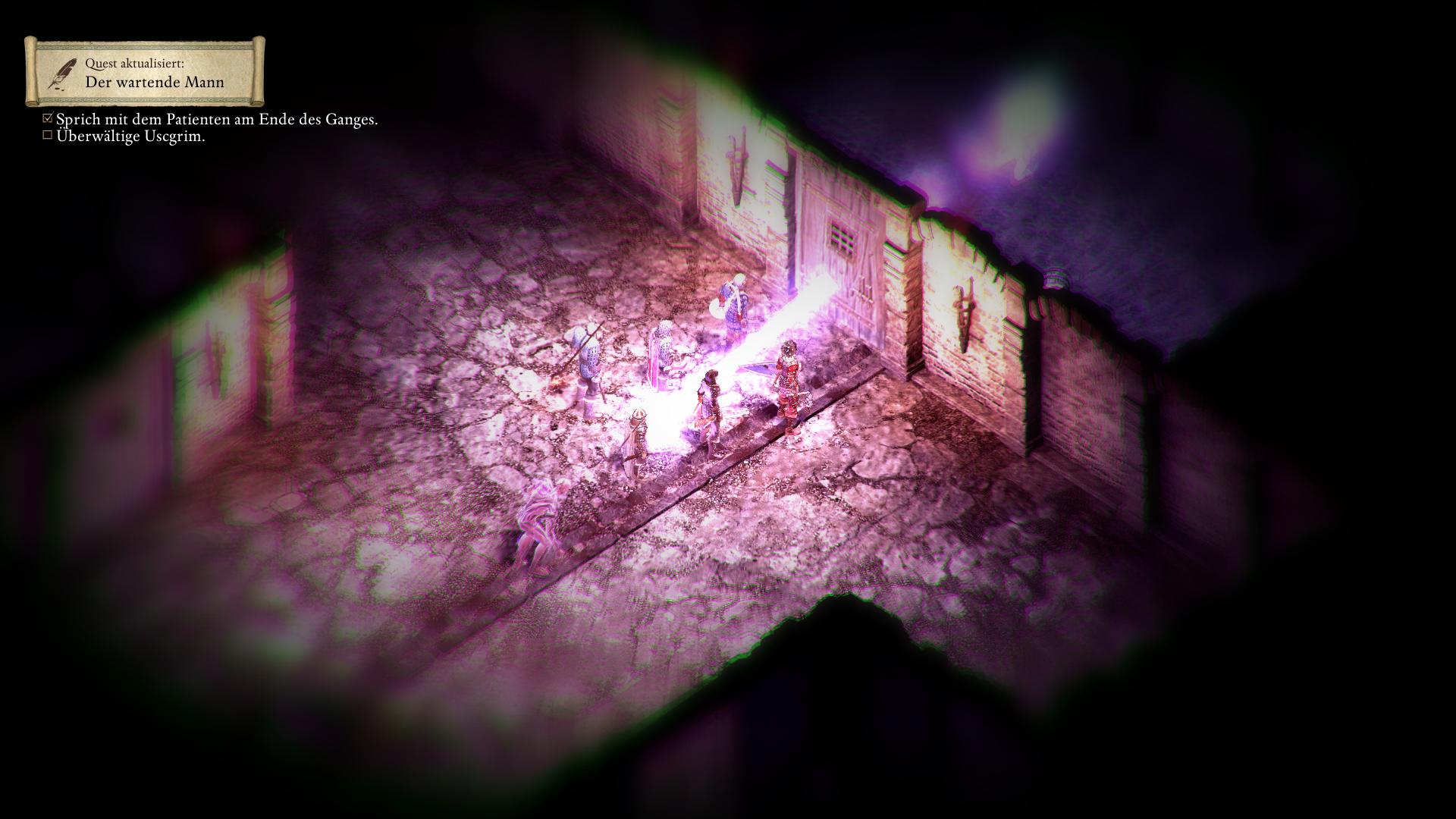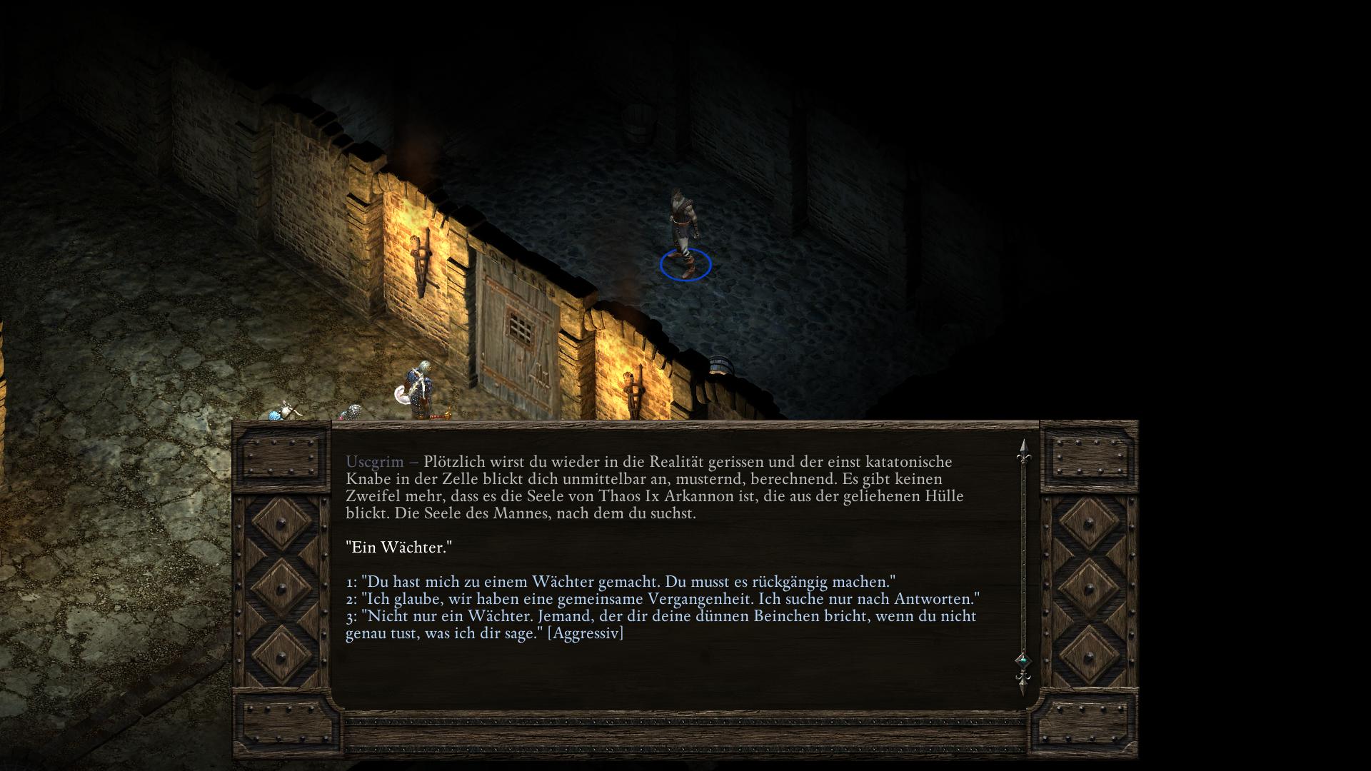 Mit Ethelmoers Erlaubnis lassen euch die Wachen passieren. Falls ihr zuvor Linete Reymond in der "Der letzte Akt" Quest beschuldigt habt, könnt ihr sie hier übrigens unter den Patienten finden. Sucht ein Gespräch mit Caedman Azo [13] und plündert die Behälter in seinem Raum, wenn euch die Mechanik (6-7) Fertigkeit dafür zur Verfügung steht. So bekommt ihr den "Rabenflügel" Streitkolben und "Blaidh Golan" (Leichte Rüstung). Bittet Caedman Azo euch Zugang zur Nordstation [7] zu geben und weißt ihr daraufhin, dass ihr die Erlaubnis von Ethelmoer habt, oder auf die Schweißperlen aus seiner Stirn (erfordert Wahrnehmung 13). Das bringt euch den "Schlüssel zur nördlichen Patientenstation" ein. Falls ihr Grams Krankenakte mitgenommen habt, besteht euer aktuelles Ziel darin, mit ihm zu kommunizieren. Gram befindet sich in der dritten Zelle auf der linken Seite. Ihr könnt in Grams Seele blicken und gelangt damit auf die Fährte des Jungen am Ende des Ganges [5]. Uscgrims Seele zeigt euch ungewohnte Bilder. Er kann zwischen Personen herspringen und ihr seht wie er Caedman Azos Experimente manipuliert, um das Ergebnis zu verfälschen. Am Ende der Vision wird euch klar, dass es Thaos Ix Arkannons Seele ist, die ihr gerade erforscht. Bevor ihr Uscgrim überwältigen könnt, schießt ein Lichtstrahl aus ihm in die Fleischkonstrukte auf dem Gang hinter euch und die gesamte Etage des Sanatoriums wird feindlich. Die Hauptaufgabe (Der wartende Mann) ist damit abgeschlossen und ihr müsst nur noch aus dem Sanatorium entkommen. Auf dem Weg nach draußen könnt ihr erneut bei Caedman Azo [13] Halt machen und ihn mit euren Erkenntnissen zu seinen Experimenten konfrontieren. Innerhalb dieses Dialogs ist es möglich Azo aufzuhetzen, wodurch ihr gezwungen seid, ihn zu töten. Das ist nicht zu empfehlen, da es die verbleibenden Beseeler oben ebenfalls feindlich macht und ihr wiederum gezwungen seid sie zu töten. Das hindert zwar nicht euer Vorankommen in der Haupthandlung, senkt euren Ruf in Trutzbucht jedoch drastisch.
