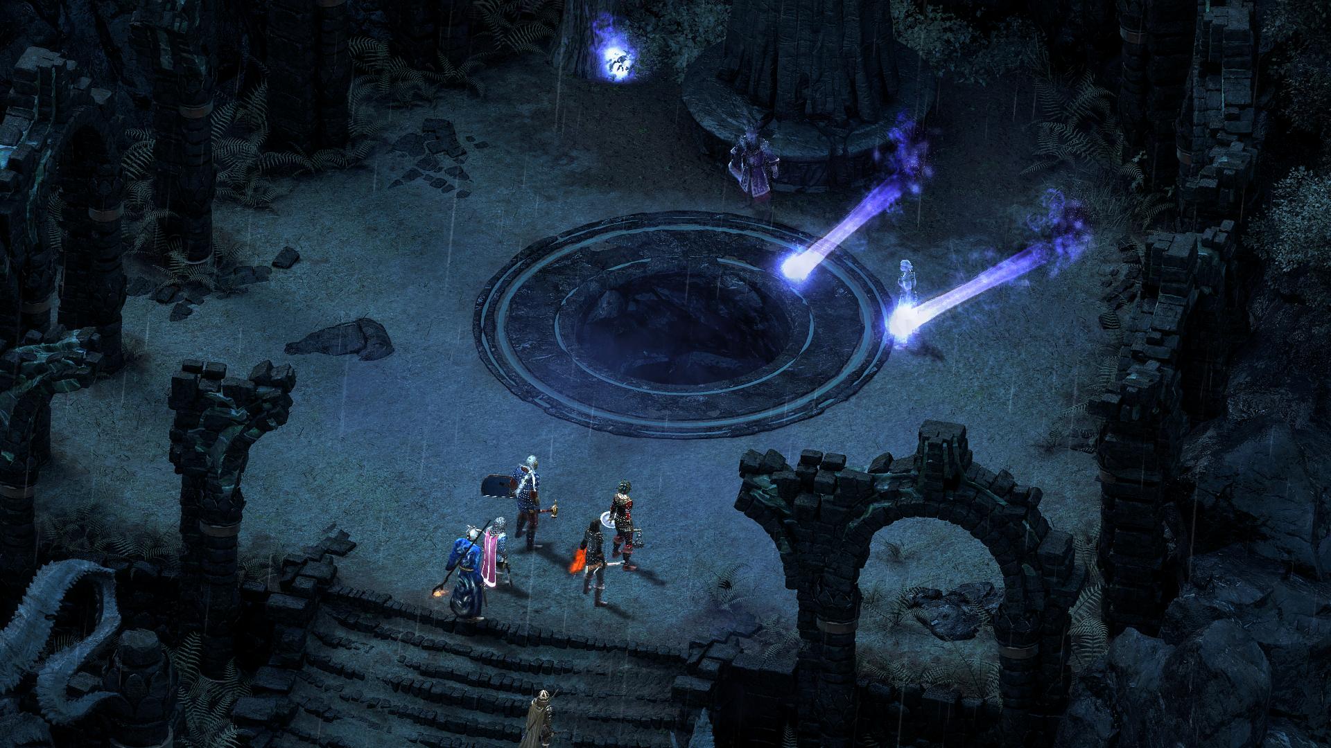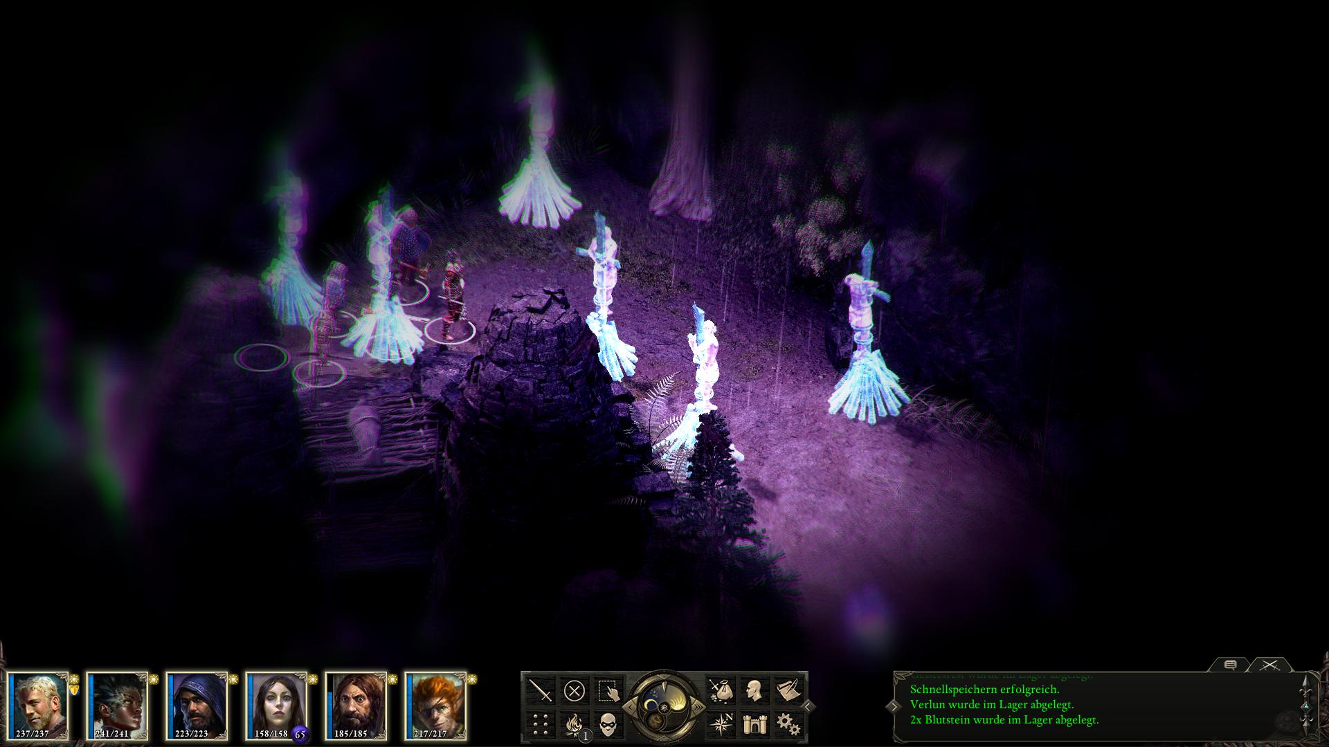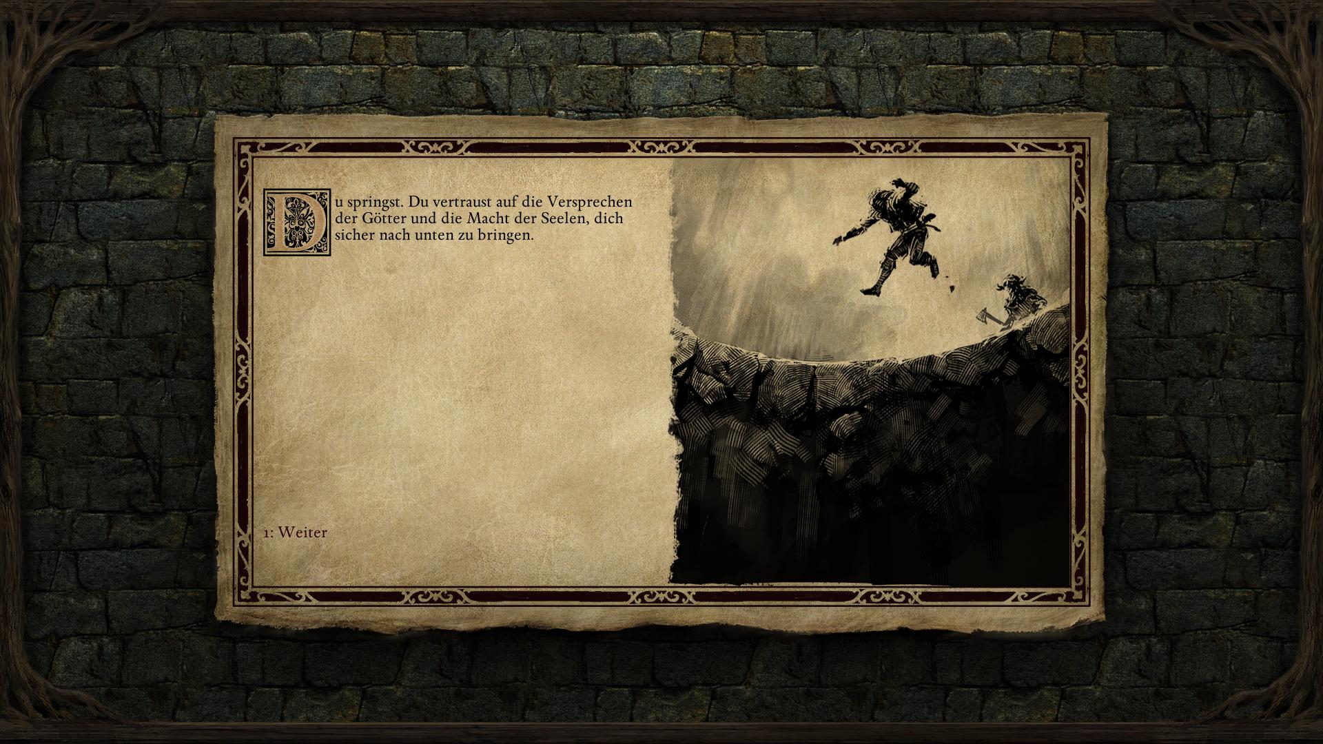 An der Grube [1] angelangt, könnt ihr die vergangene Folterung von Iovara ix Ensios durch Thaos miterleben. Am Ende der Vision bleibt euch nur noch der Sprung in die Grube. Wenn ihr diesen wagt, gibt es kein zurück mehr! Ihr landet durch den Sprung in Breith Eaman und kommt nie wieder zu einem anderen Ort zurück. Also schließt spätestens jetzt alles noch offene ab und wählt die Gruppenmitglieder aus, die ihr für den Endkampf einsetzen wollt. Die Sichere Landung erfordert neben dem Segen eines Gottes außerdem gute Attribute, sonst gibt es Verletzungen. Bei den Komplikationen des Falls habt ihr folgende Möglichkeiten: