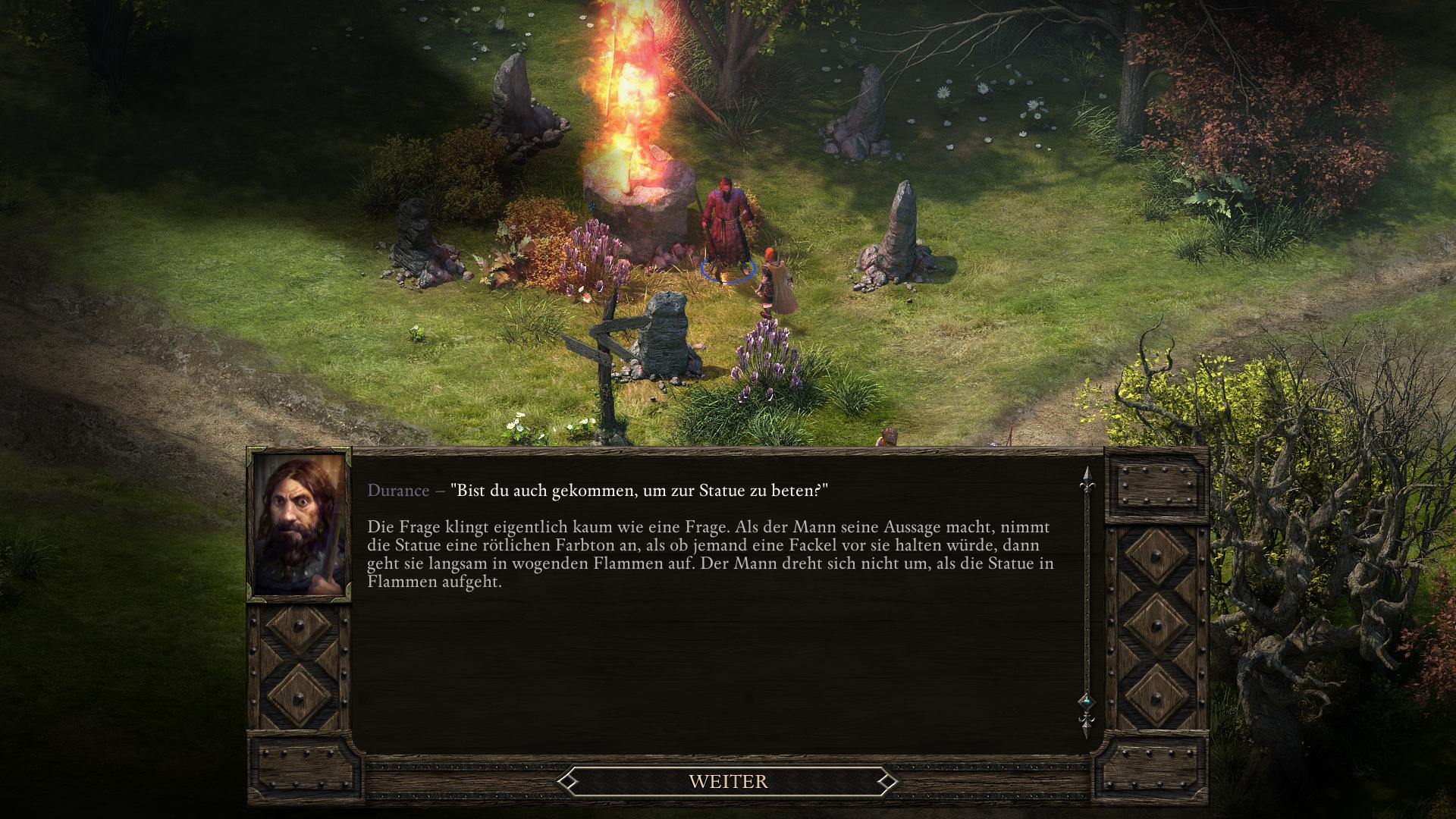 Durance ist ein Mann der (SEHR) vielen Worte. Mann merkt schnell, dass der Charakter (und die Trauernde Mutter) vom leitenden Planescape: Torment Designer Chris Avellone geschrieben wurden. Entsprechend ermüdend oder nervtötend mag Durance dem ein oder anderen erscheinen. Besonders weil Durance tatsächlich die Gruppe verlässt, wenn ihr euch dauerhaft nicht mit ihm beschäftigen wollt. Die Prüfungen von Durance ist die Geschichte um den Götterhammer, einer Art Bombe, bei deren Explosion die anderen elf Ingenieure starben und nur Durance überlebte. Auf euren Abenteuern mit Durance erhaltet ihr im Spielverlauf (immer beim Aufwachen nach einer Rast) eine Vision von Durance und müsst anschließend mit dem Magran Priester darüber diskutieren.