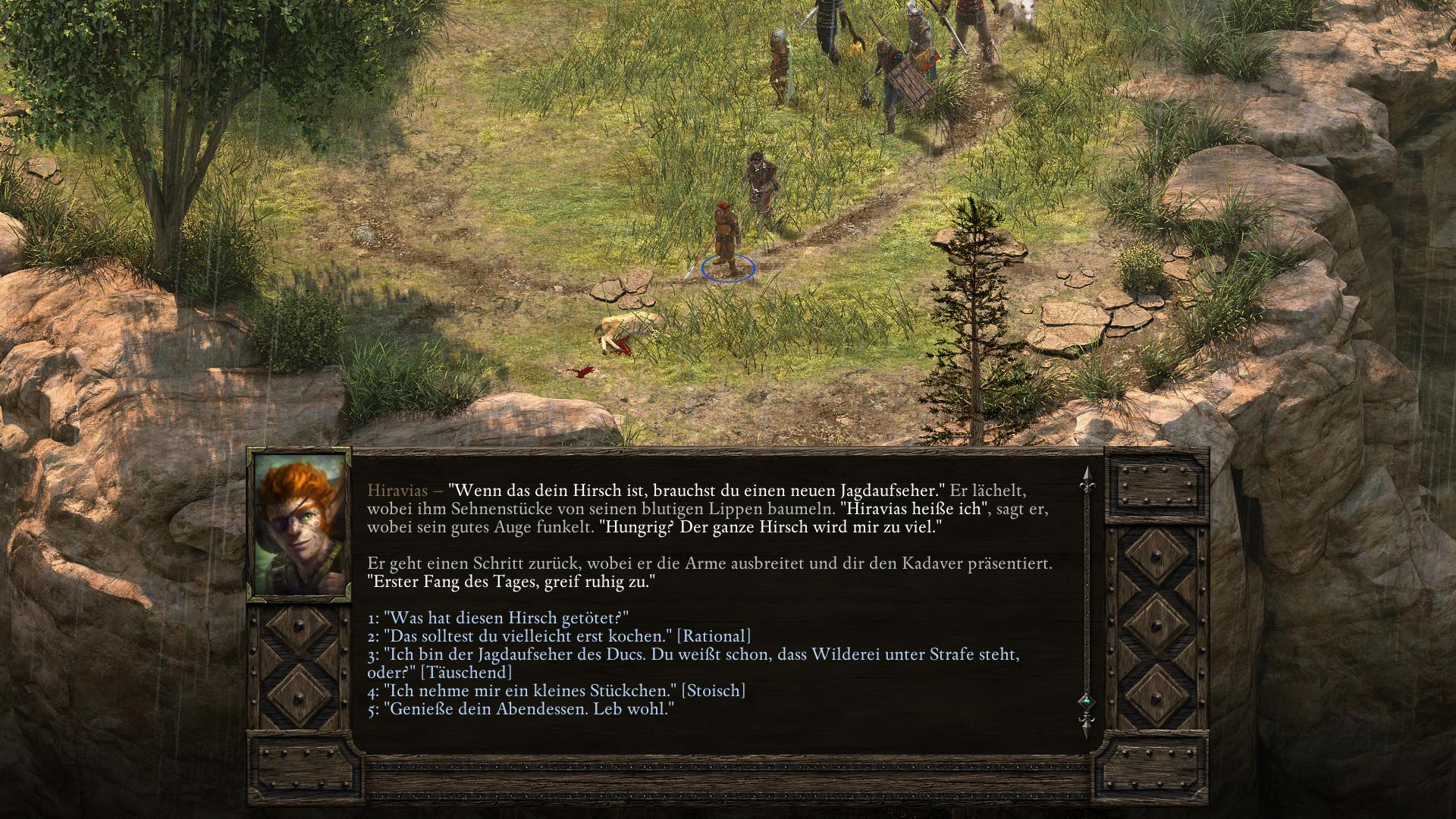Der Druide Hiravias streift durch den Süden der Sturmwallschlucht und somit begegnet ihr ihm auf dem Weg nach Dyrfort (wahrscheinlich Akt 2). Der Landstreicher sucht nach einer Erklärung für seine wahre Form und hofft, dass ihr ihm helft sie zu finden.