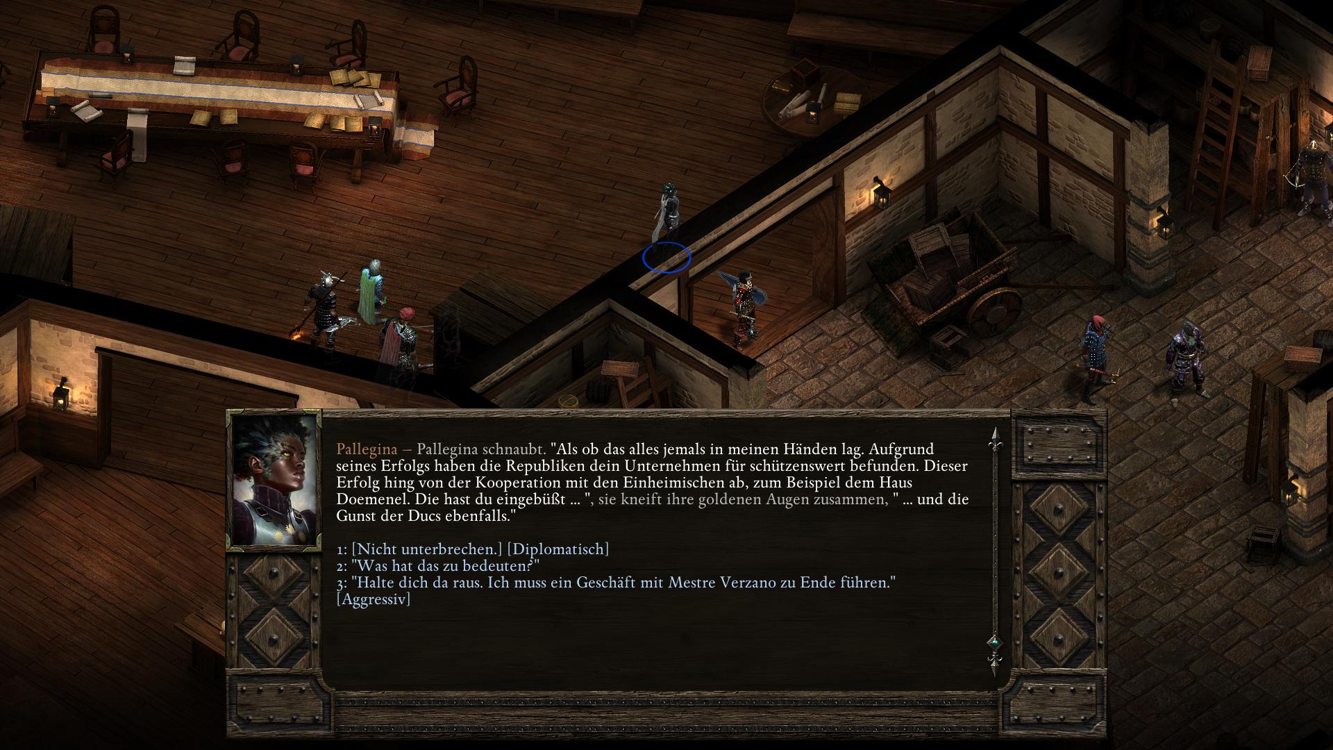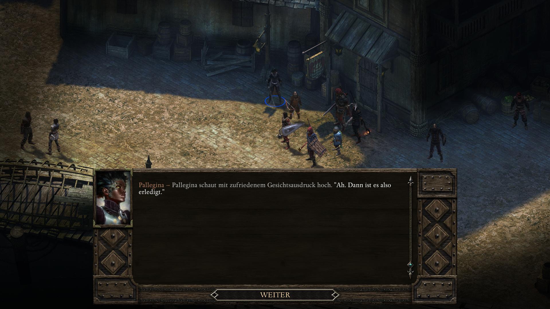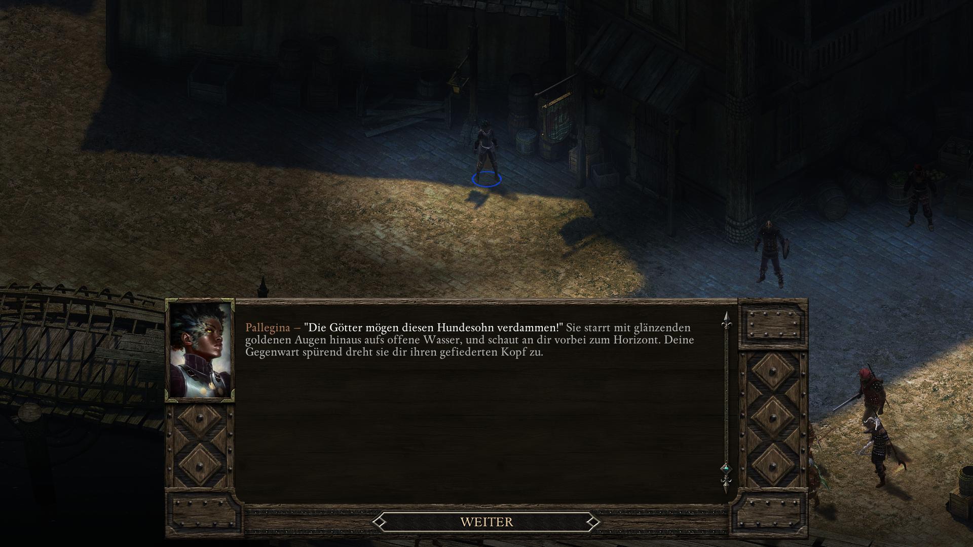 Die gottähnliche Paladinin Pallegina arbeitet für die Vailianische Botschaft in Trutzbucht (Akt 2). Ihr begegnet ihr kurz bei eine Vailianischen Lagerhaus im Ondras Geschenk Bezirk. Nachdem euch Mestre Verzano in eine dubiose Lieferung verstrickt hat und er sich den Zorn des Hauses Doemenel zugezogen hat (Um jeden Preis Quest), erscheint Pallegina erneut und ihr könnt anbieten sie zu begleiten, um letztlich etwas größeres zu leisten.