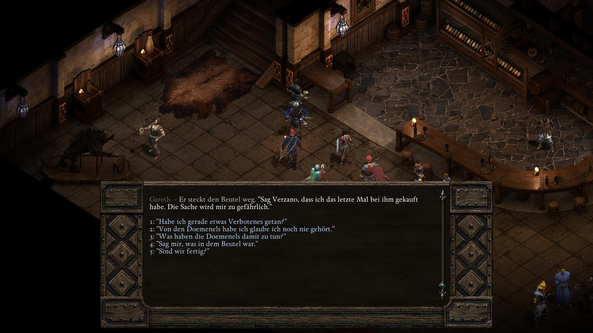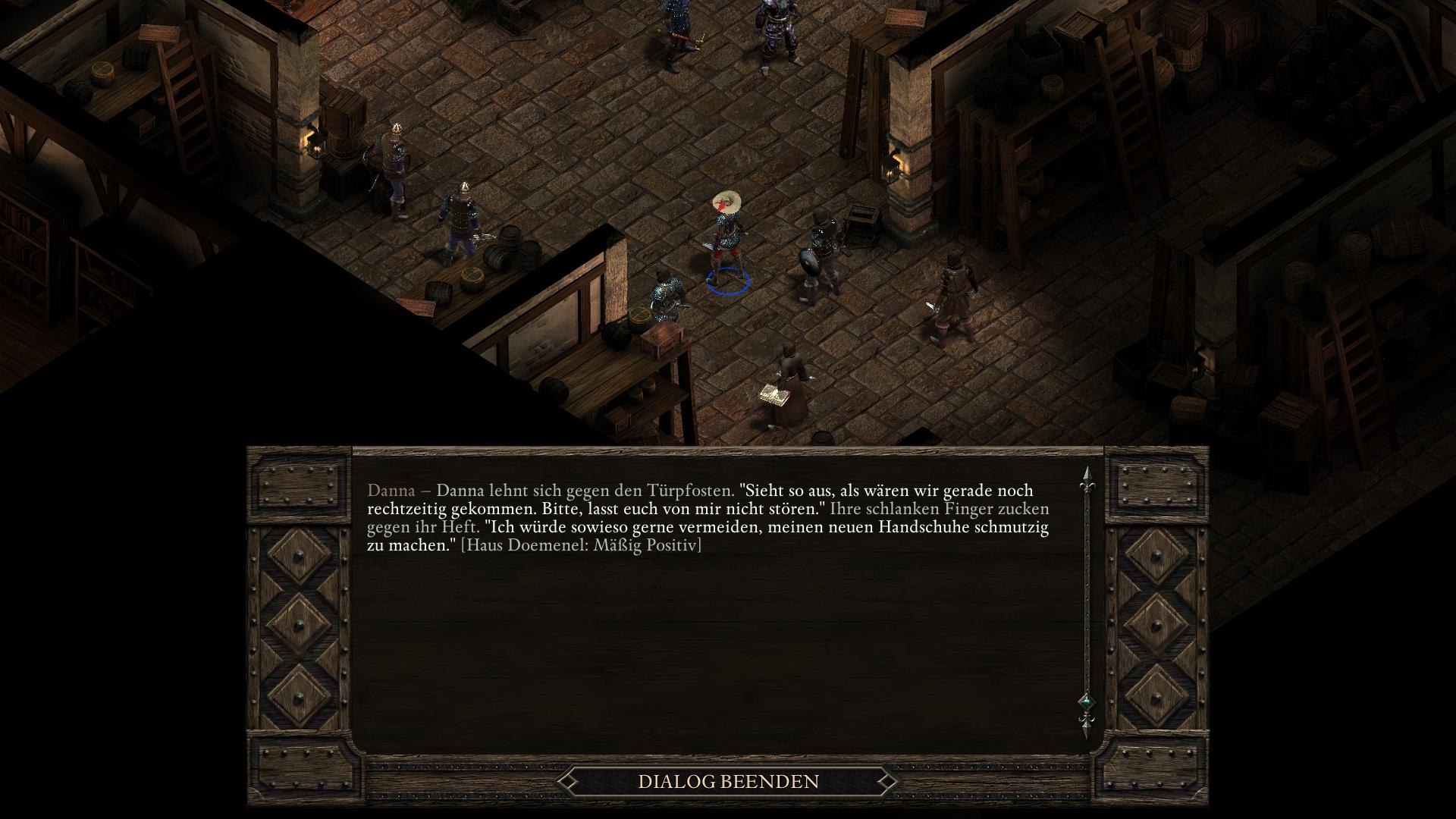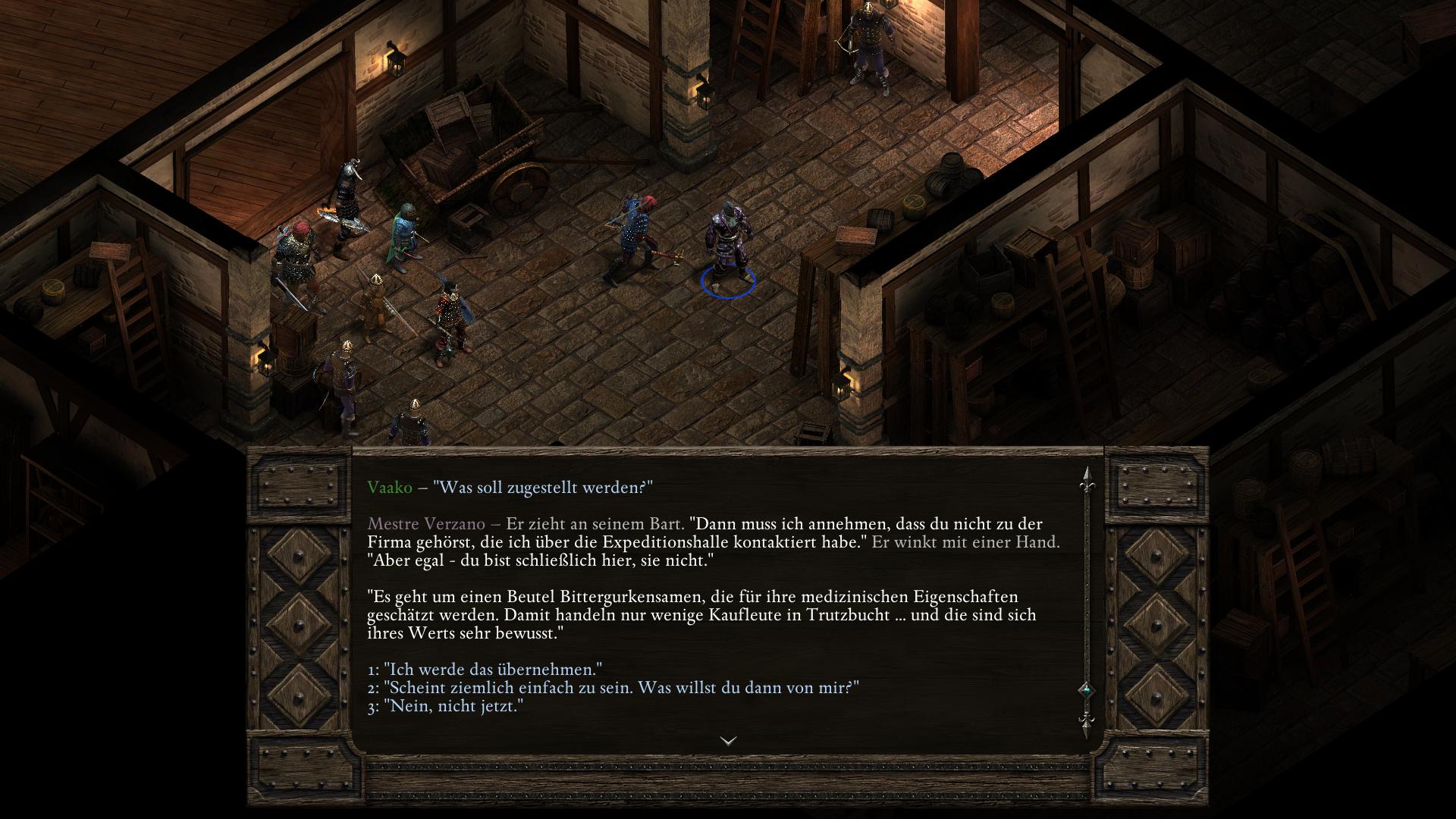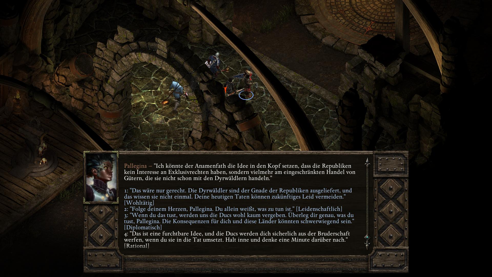 Die gottähnliche Paladinin Pallegina arbeitet für die Vailianische Botschaft in Trutzbucht (Akt 2). Ihr begegnet ihr kurz bei eine Vailianischen Lagerhaus im Ondras Geschenk Bezirk. Nachdem euch Mestre Verzano in eine dubiose Lieferung verstrickt hat und er sich den Zorn des Hauses Doemenel zugezogen hat (Um jeden Preis Quest), erscheint Pallegina erneut und ihr könnt anbieten sie zu begleiten, um letztlich etwas größeres zu leisten.