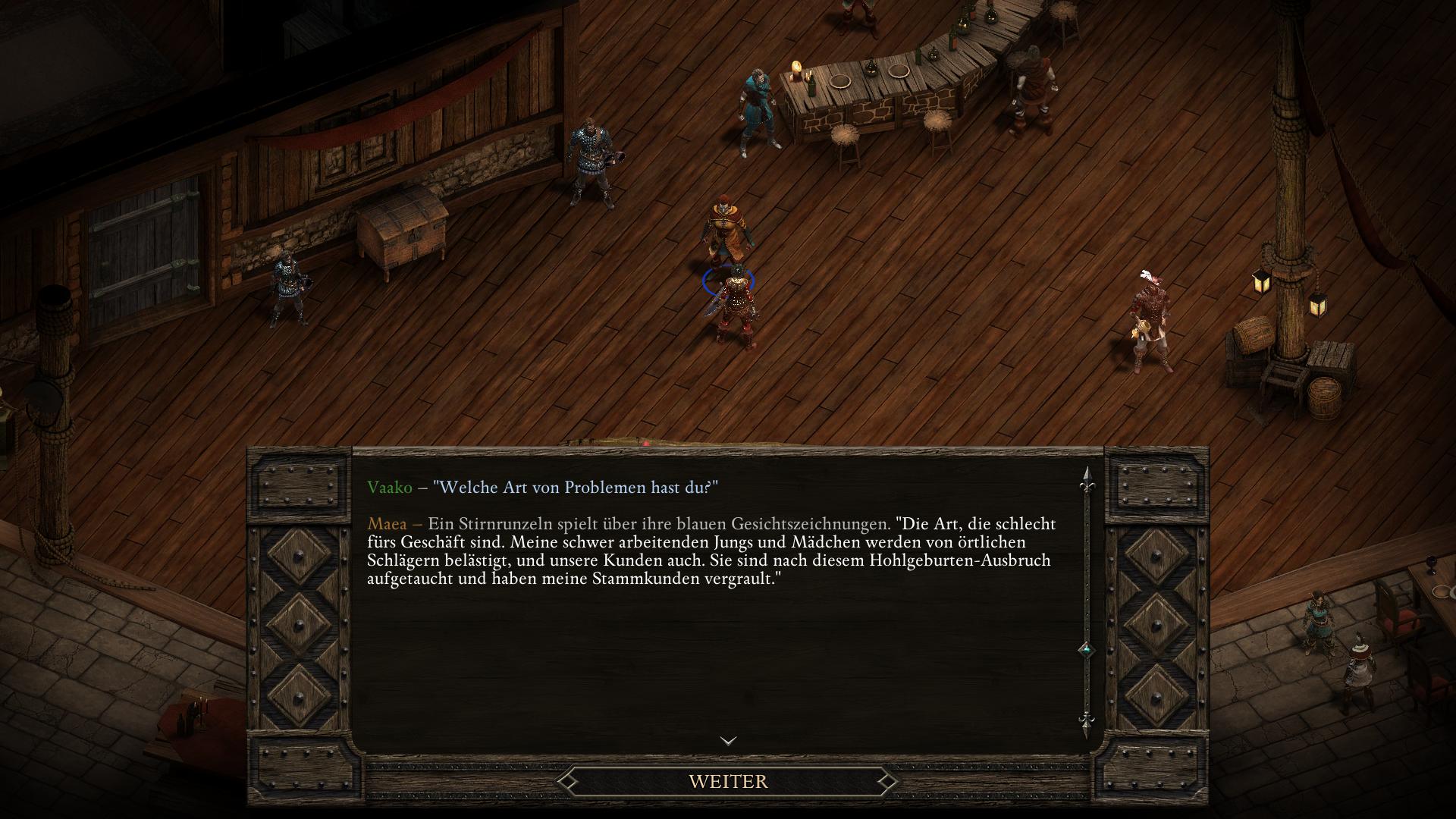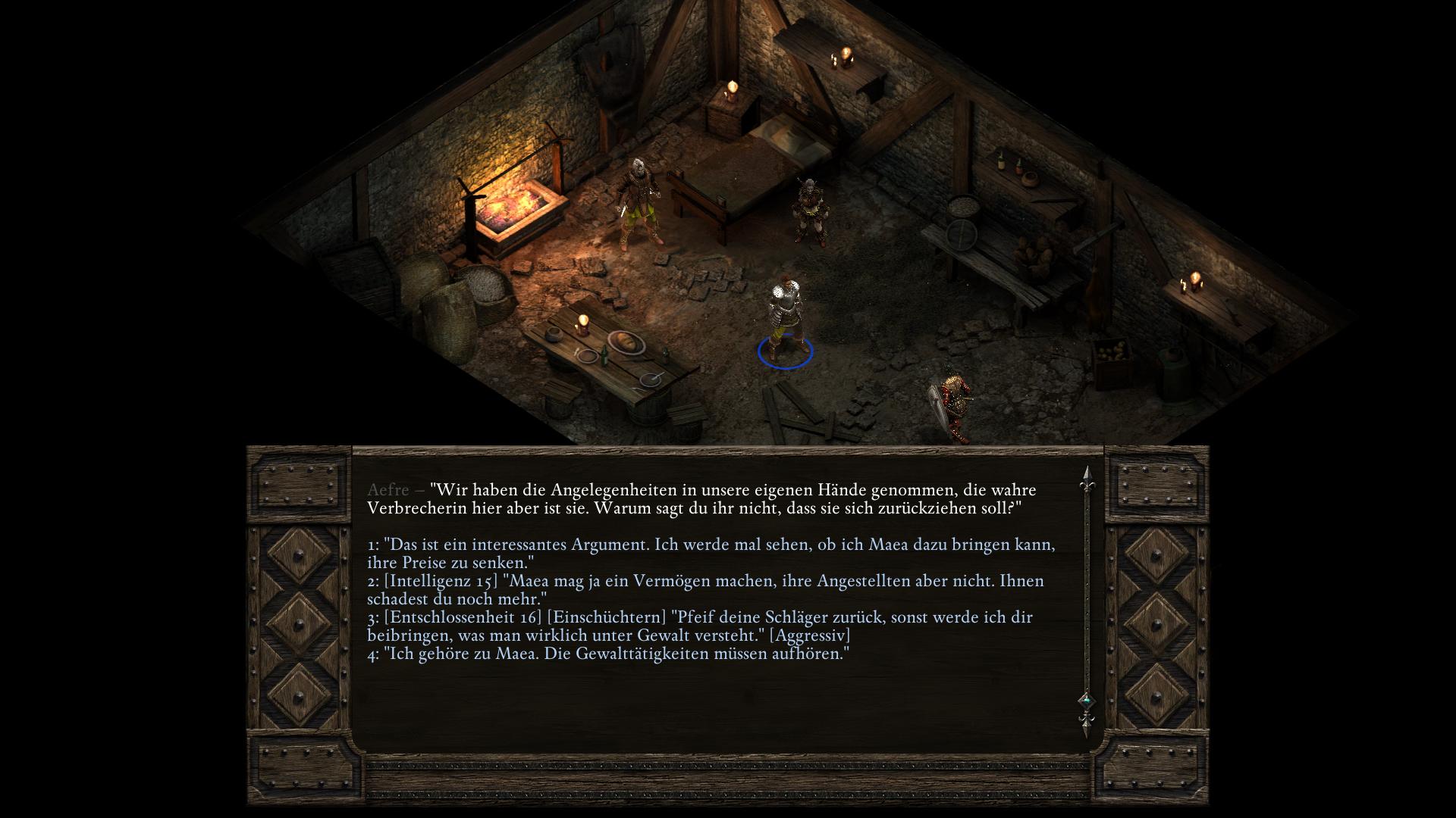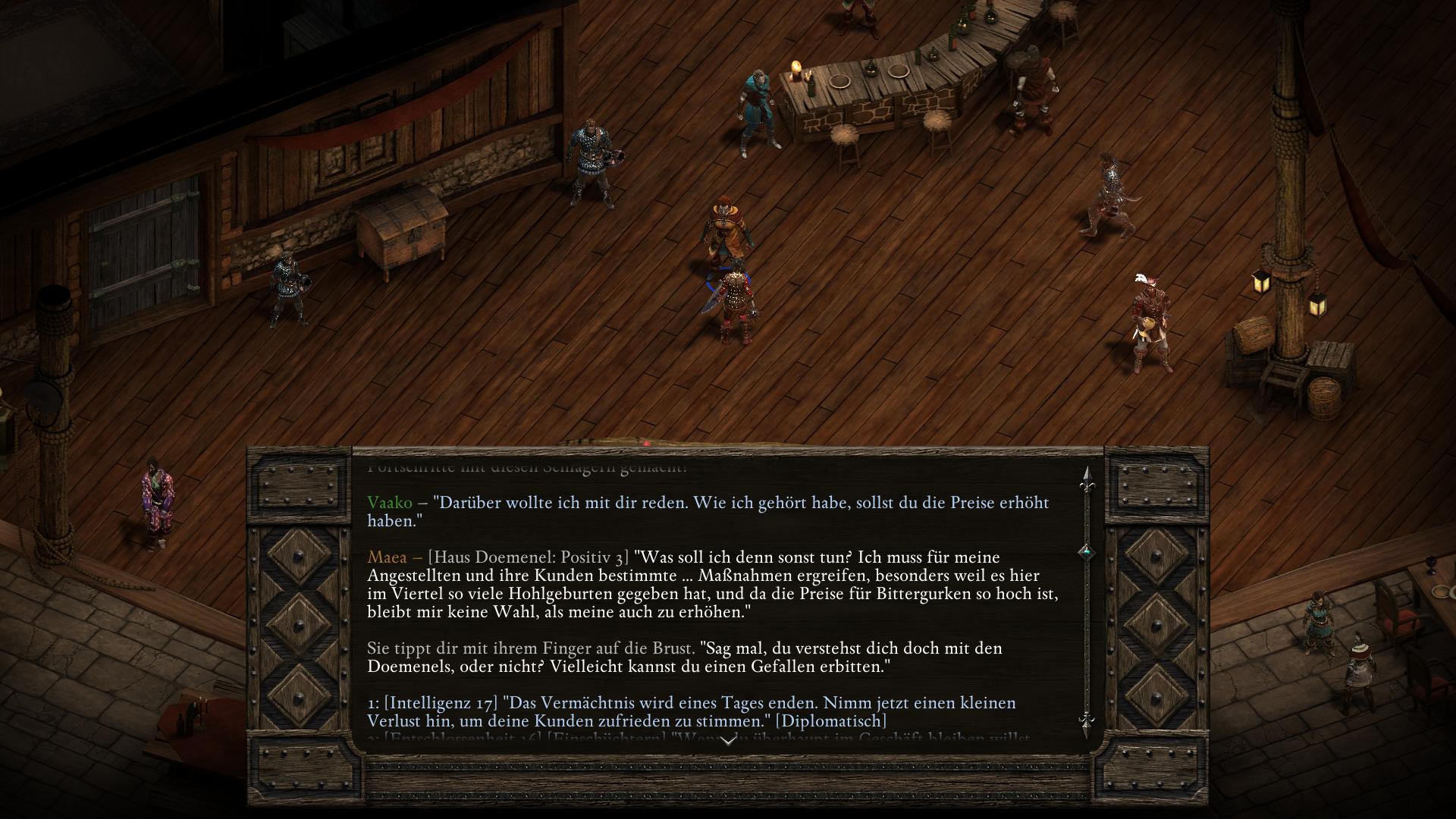 - [Intelligenz 15] "Maea mag ja ein Vermögen machen, ihre Angestellten aber nicht. Ihnen schadest du noch mehr." oder [Entschlossenheit 16] "Pfeif deine Schläger zurück, sonst werde ich dir beibringen, was man wirklich unter Gewalt versteht." beendet die Quest und bringt euch von Maea Reputation Trutzbucht: Gering Positiv sowie 600 Kupferstücke ein.
