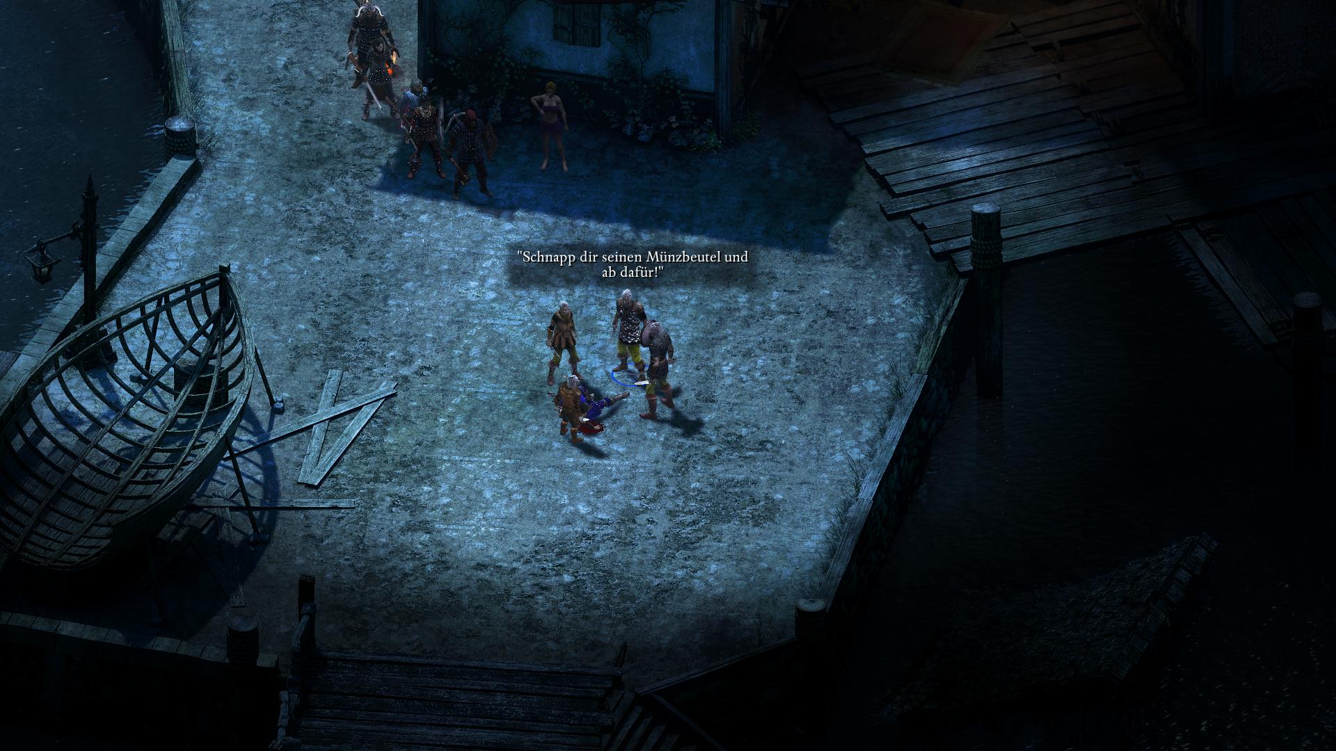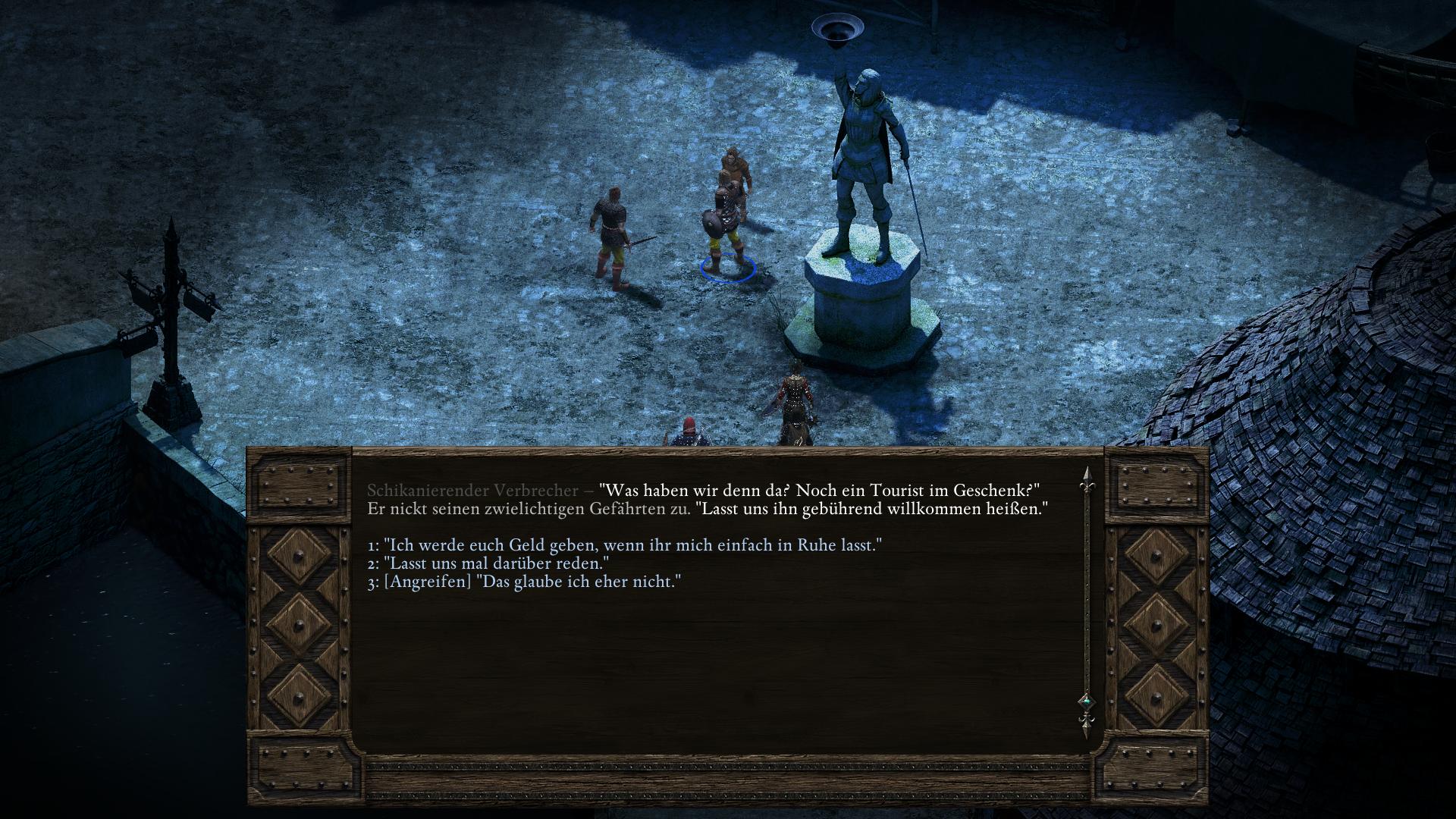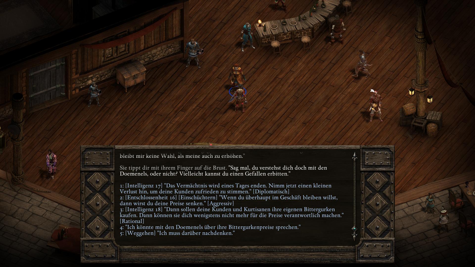 - [Intelligenz 15] "Maea mag ja ein Vermögen machen, ihre Angestellten aber nicht. Ihnen schadest du noch mehr." oder [Entschlossenheit 16] "Pfeif deine Schläger zurück, sonst werde ich dir beibringen, was man wirklich unter Gewalt versteht." beendet die Quest und bringt euch von Maea Reputation Trutzbucht: Gering Positiv sowie 600 Kupferstücke ein.