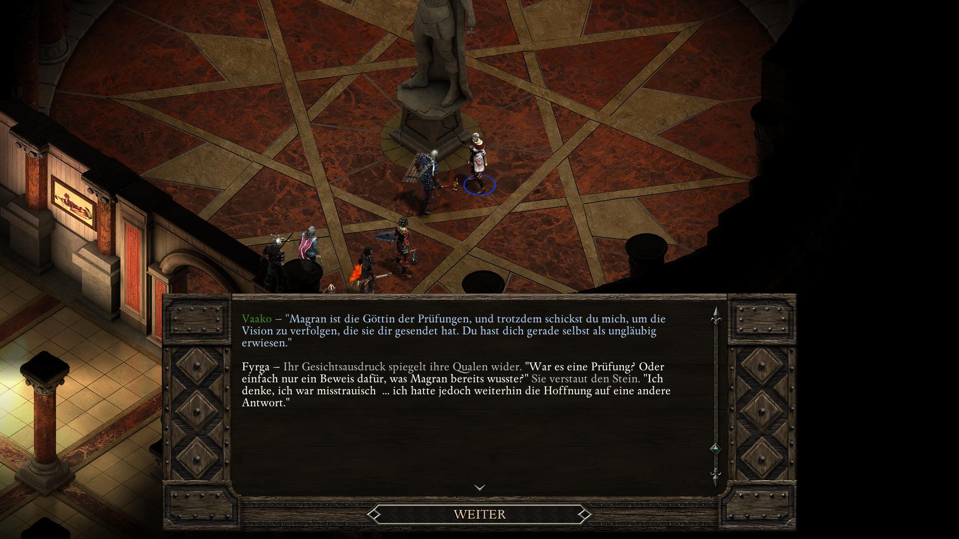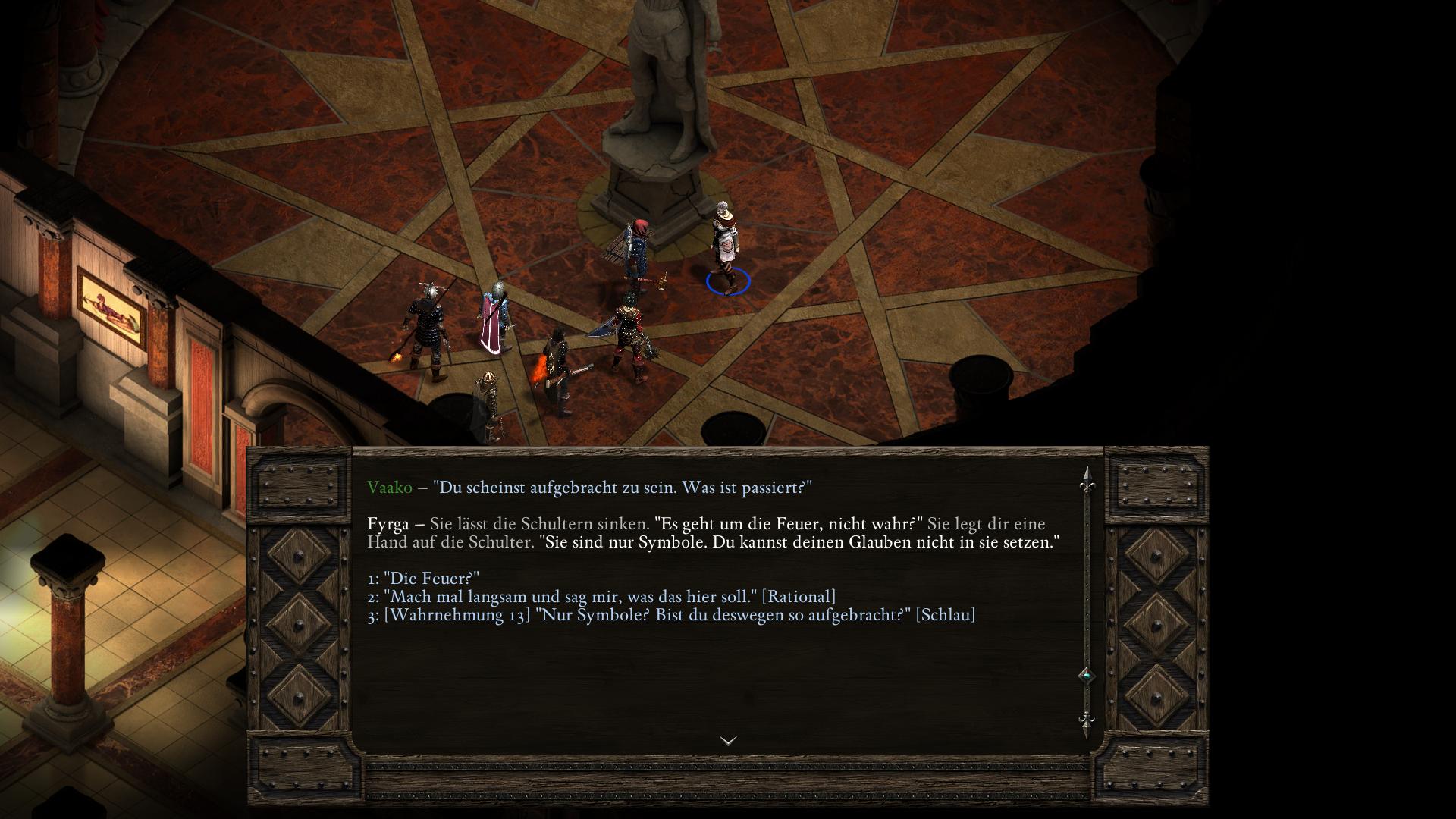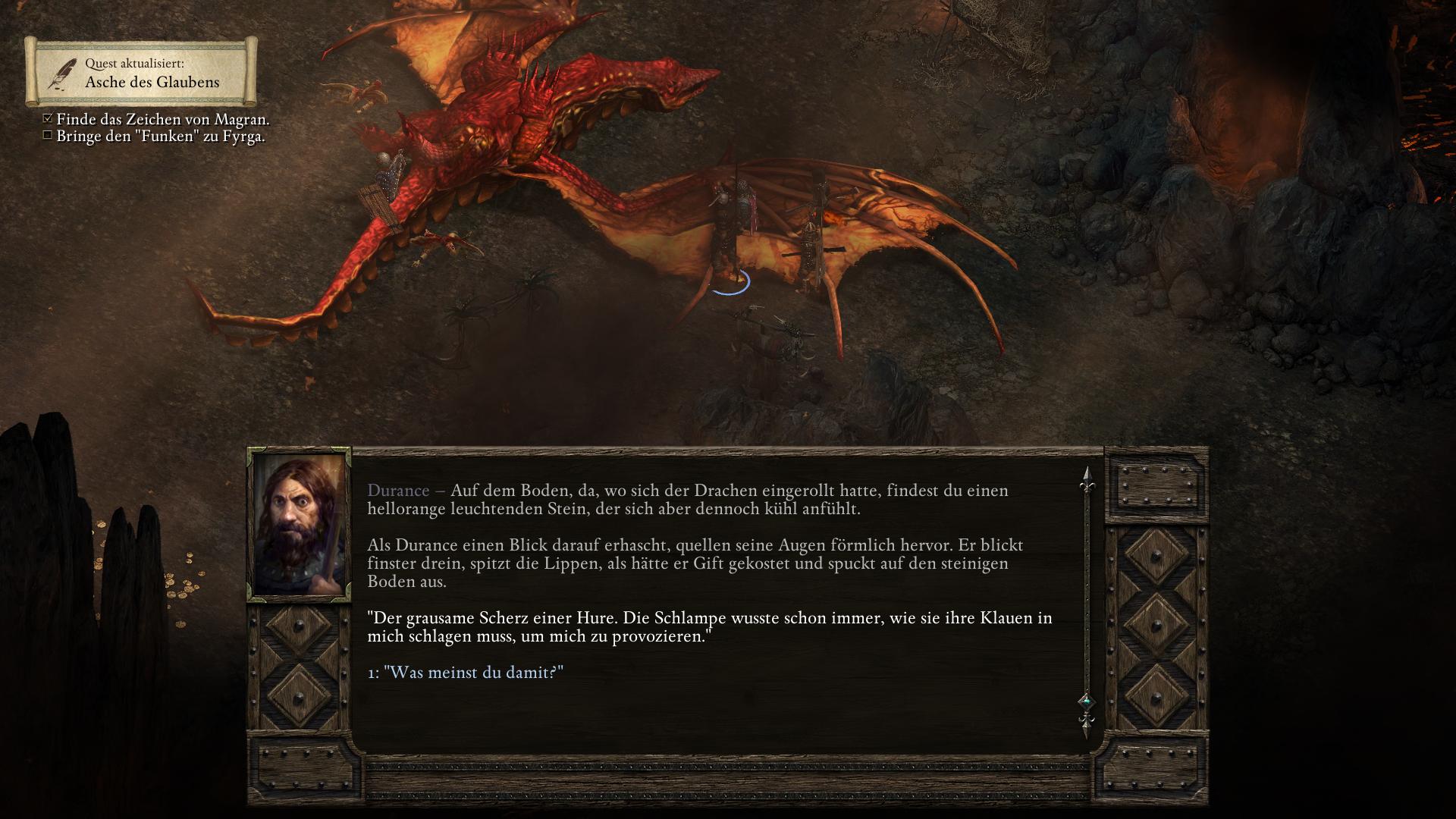 Im Palast des Ducs [2] von Trutzbucht (Defiance Bay) liegen nicht nur die Archive für Eders Ahnenforschung, sondern auch die Magran Anhängerin Fyrga. Sie ist eigentlich dafür zuständig, das heilige Feuer am Brennen zu halten. Doch eben das ist ihr misslungen. Daher schickt sie euch zu einer Höhle, deren Standort sie nur aus Träumen kennt, um einen neuen Funken zu beschaffen. Fyrga verweist euch für den Standort auf die Expeditionshalle der Dutzenden (Dozens) am Kupferweg (Copperlane). Ihr müsst diesen Zwischenschritt nicht machen und könnt stattdessen zu den Waldend-Ebenen reisen und diese nach Süden verlassen, um zu den Feuerfällen (Searing Falls) zu gelangen. Für ein paar Extra-Erfahrungspunkte könntet ihr jedoch:
