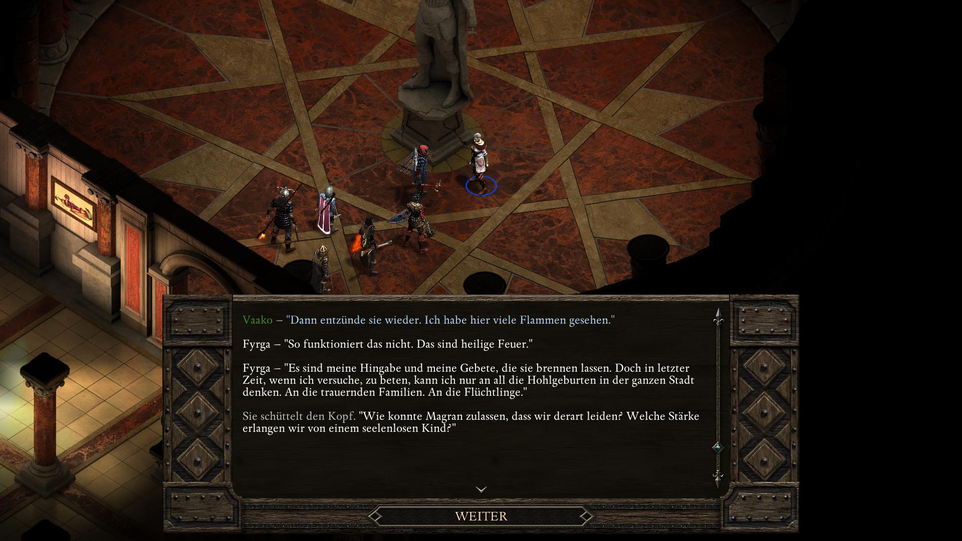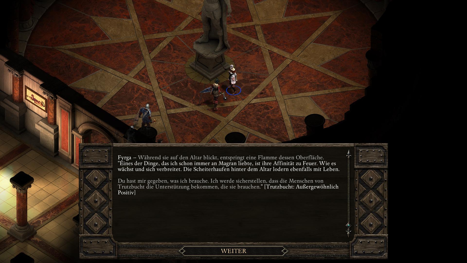 Fyrga, Ruhige Begeisterte Magrans, wurde durch die Hohlgeburten-Krise in Trutzbucht in ihrem Glauben erschüttert. Dementsprechend war sie nicht in der Lage, die heiligen Feuer der Stadt am Brennen zu halten. Sie sind ein Symbol für Triumph und Schutz und waren noch nie so wichtig wie heute.