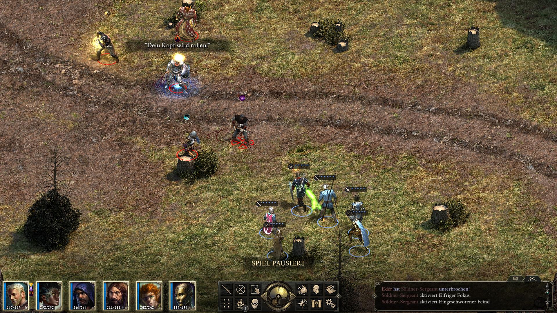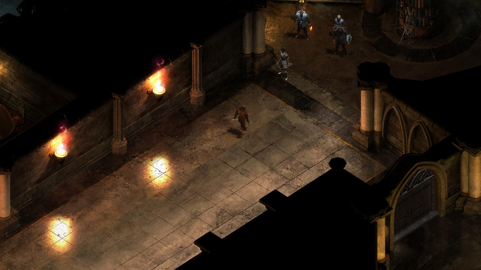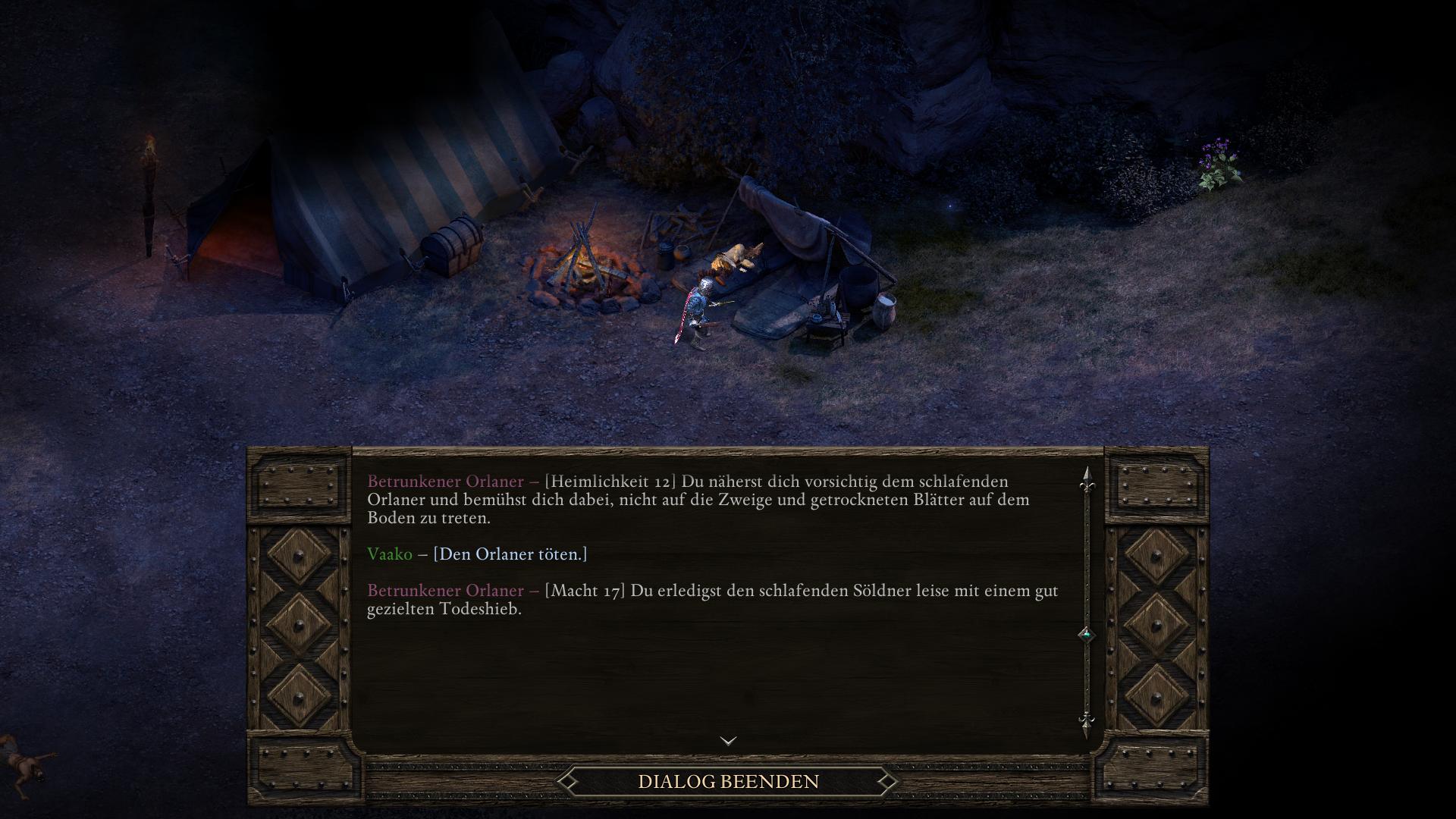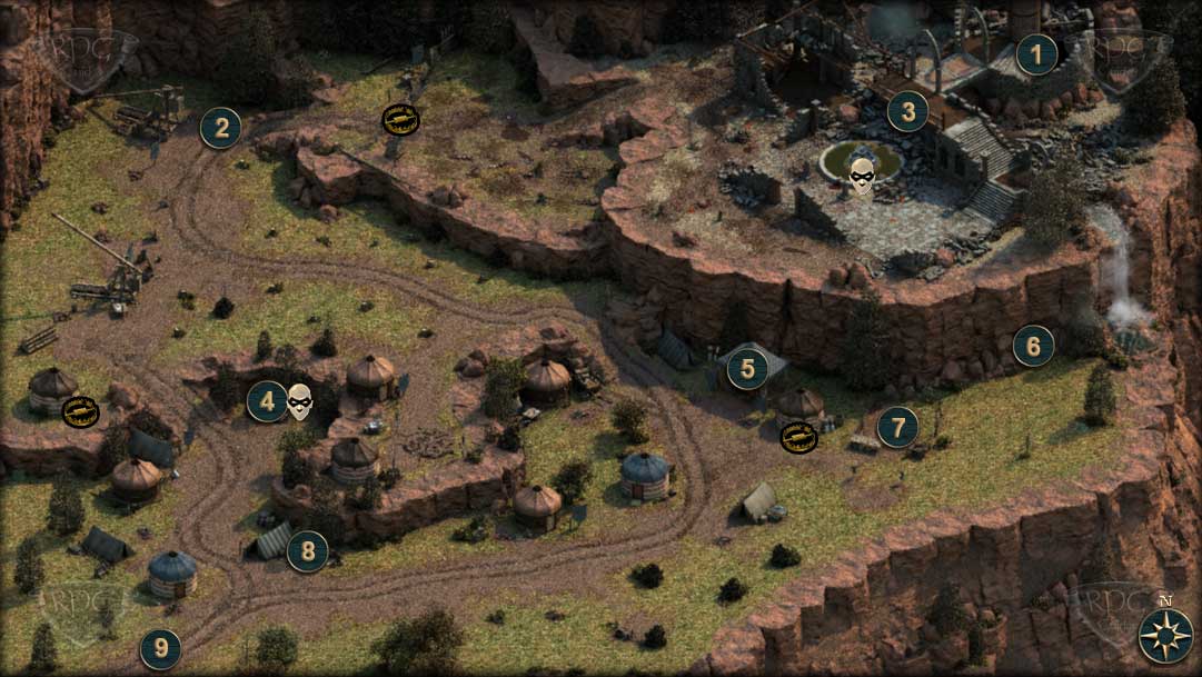 Euer Vormarsch auf Crägholdt beginnt im Südwesten des Außenareals [9]. Söldner des "Zerrissenen Banners" (Torn Bannermen) belagern bereits die Festung. Die beiden Wachposten am Eingang, lassen sich mit einem guten Ruf beim Haus Doemenel zwar beeindrucken, jedoch nicht von einem Kampf abhalten. Direkt dahinter schläft ein Mönch des Zerissenen Banners [8]. Ihn mit in den ersten oder einen Folgekampf zu ziehen, gestaltet den Sieg extrem schwierig. Mit Heimlichkeit 12 könnt ihr euch dem Betrunkenen Orlaner problemlos nähern und ihm den Schlüssel abnehmen. Mit Macht 17 kann er durch einen gezielten Todeshieb kampflos ausgeschaltet werden.