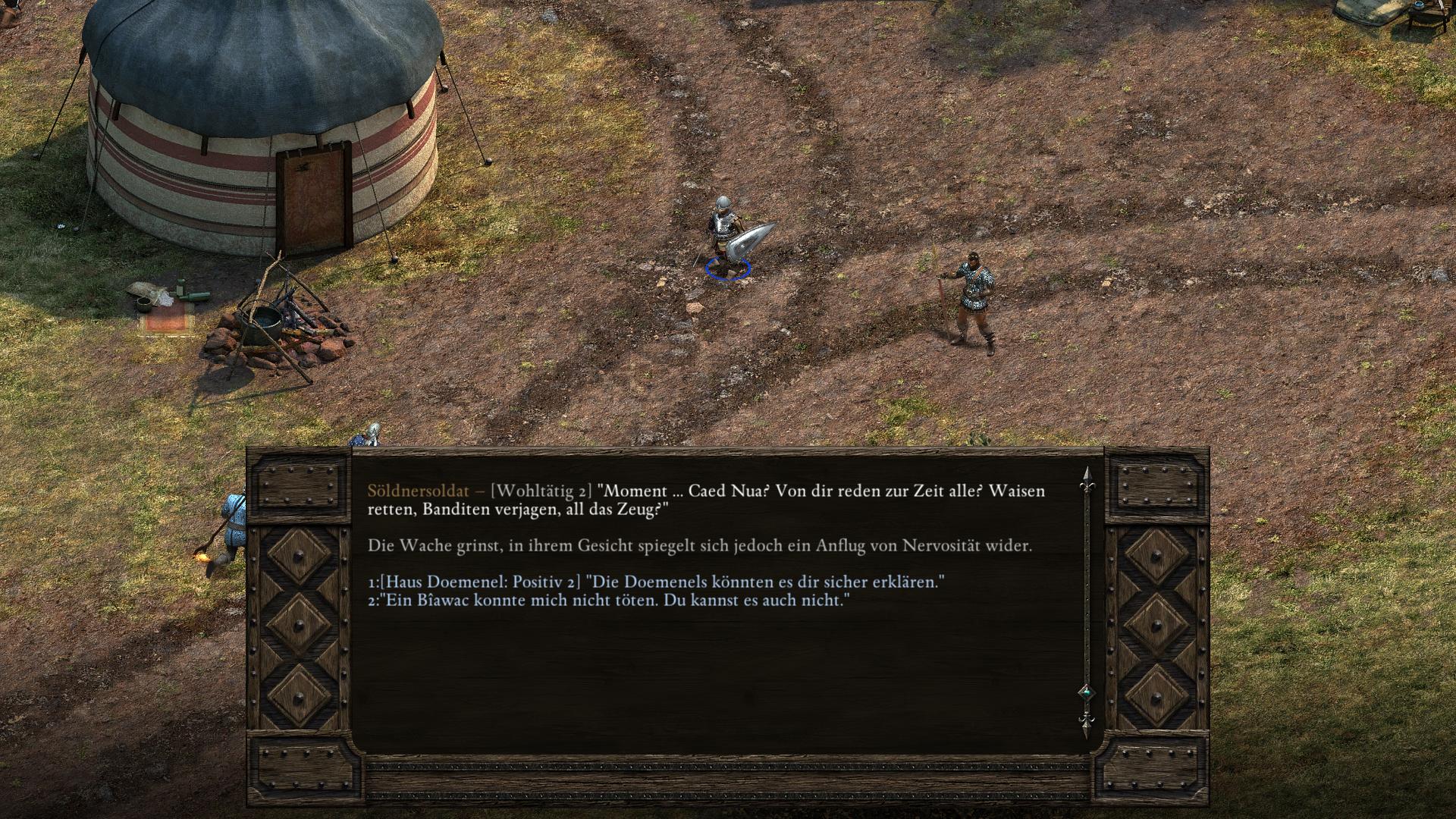 Die Burgvogtin von Caed Nua hat mir von einem Konflikt auf einer entlegenen Klippe im Dyrwald berichtet. Die Männer des Zerrissenen Banners, eine gefürchtete Söldnerbande, belagern die Festung einer örtlichen Legende - des Erzmagiers Concelhaut. Im Zentrum des Konflikts steht ein geheimnisvolles magisches Artefakt. Die Burgvogtin denkt, ich sollte die Angelegenheit untersuchen, um die Sicherheit von Caed Nua zu gewährleisten.