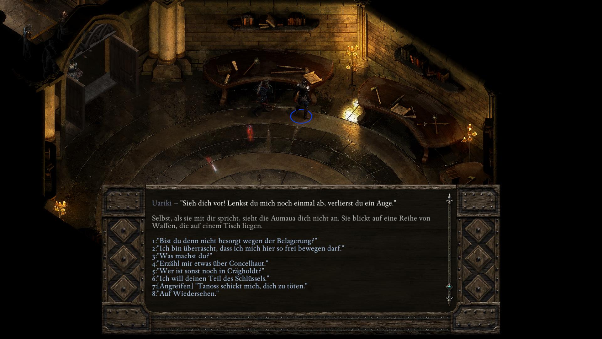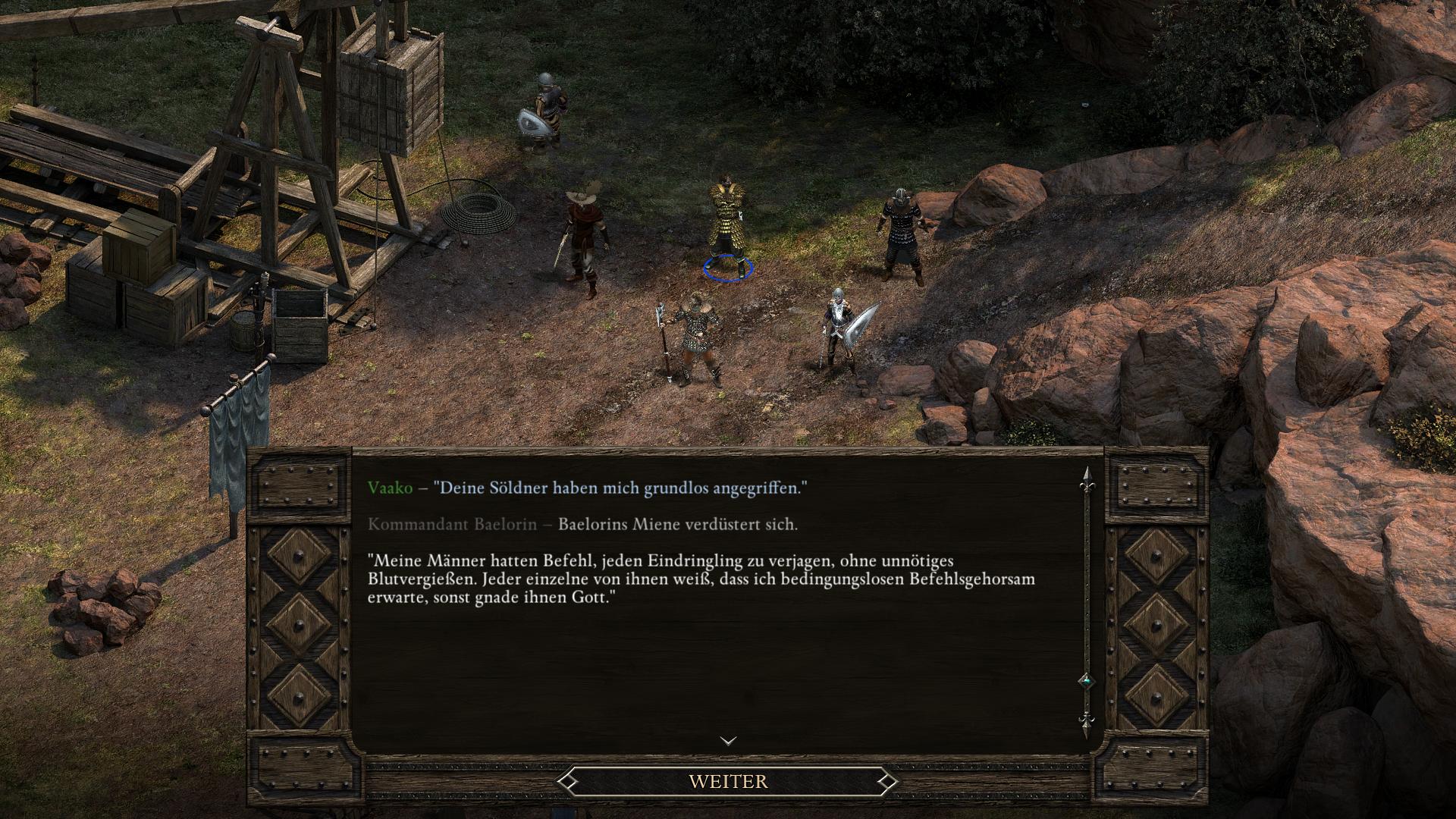 Beim Zelt im östlichen Zentrum [5] ist ein "Unsignierter Brief" zu finden, welcher die Absichten der Söldner erläutert. Die Höhle im Osten [6] dient bedauerlicherweise lediglich später als Ausgang. Somit lässt sich deren Tür von dieser Seite nicht öffnen. Euch bleibt somit keine andere Wahl, als an Kommandant Baelorin [2] (Commander Baelorin) vorbei zu marschieren, um zum Haupteingang von Crägholdt [1] zu gelangen. Die Unterhaltung führt, unabhängig von euren Argumenten, zum Kampf. Für diesen schwierigen Kampf, werdet ihr u.a. mit den Goldenen Schuppen (Mittelschwere Rüstung) belohnt.