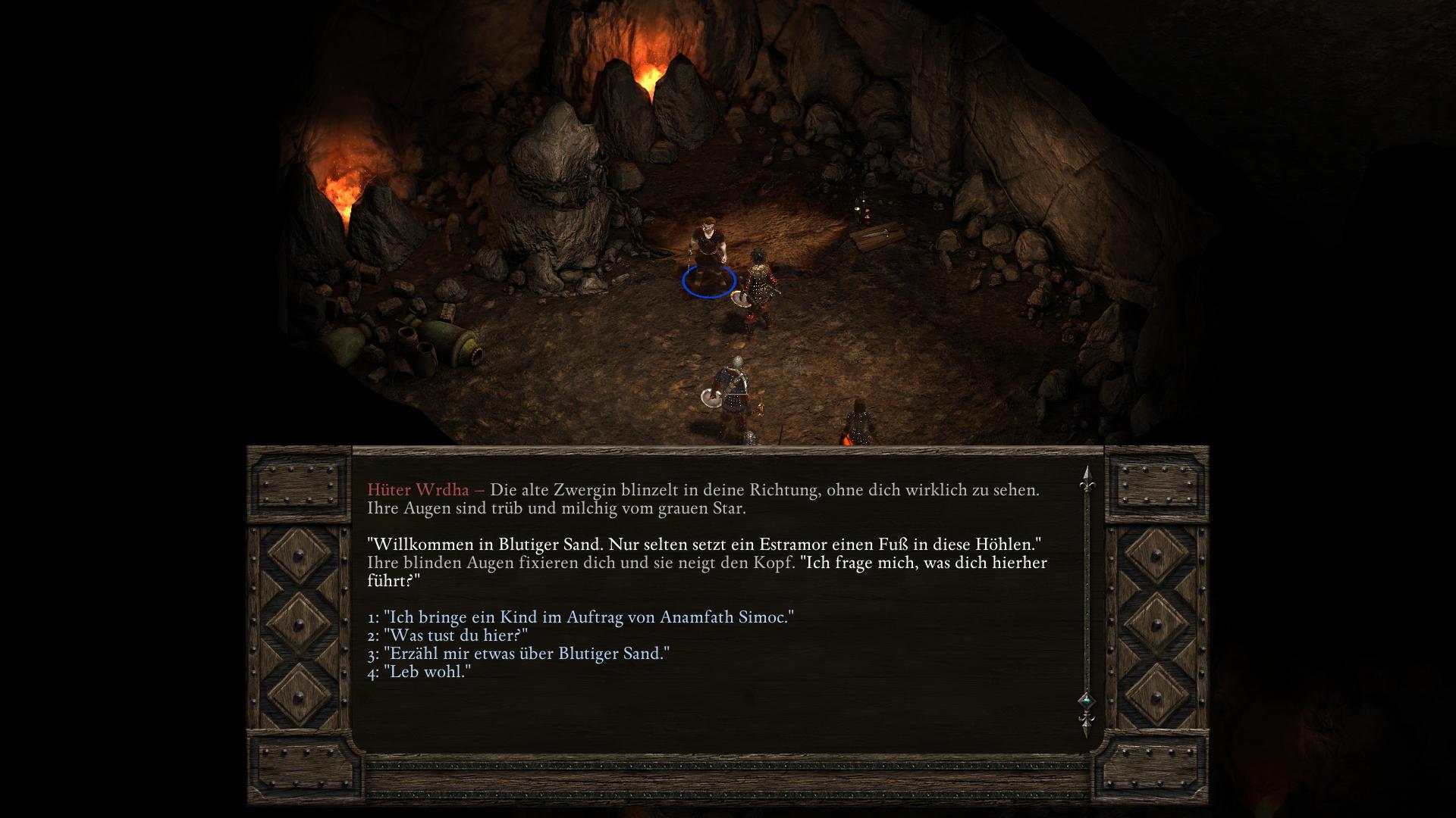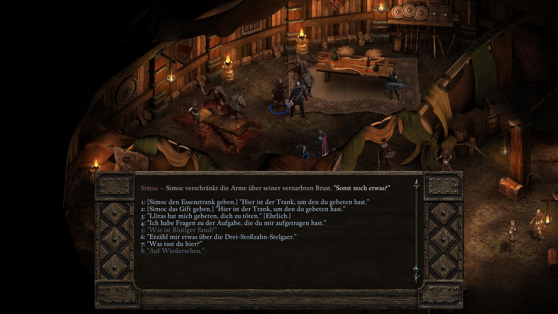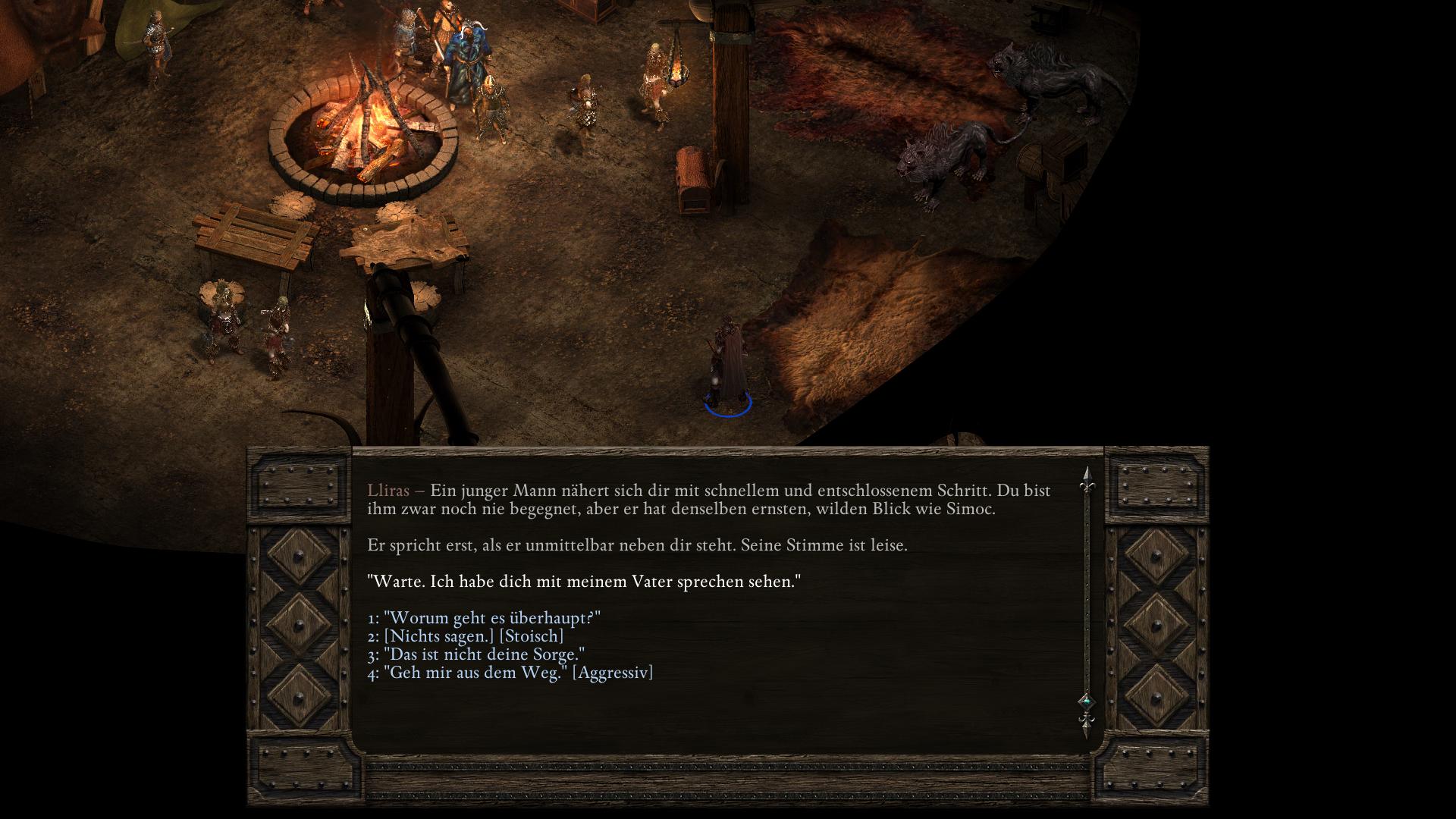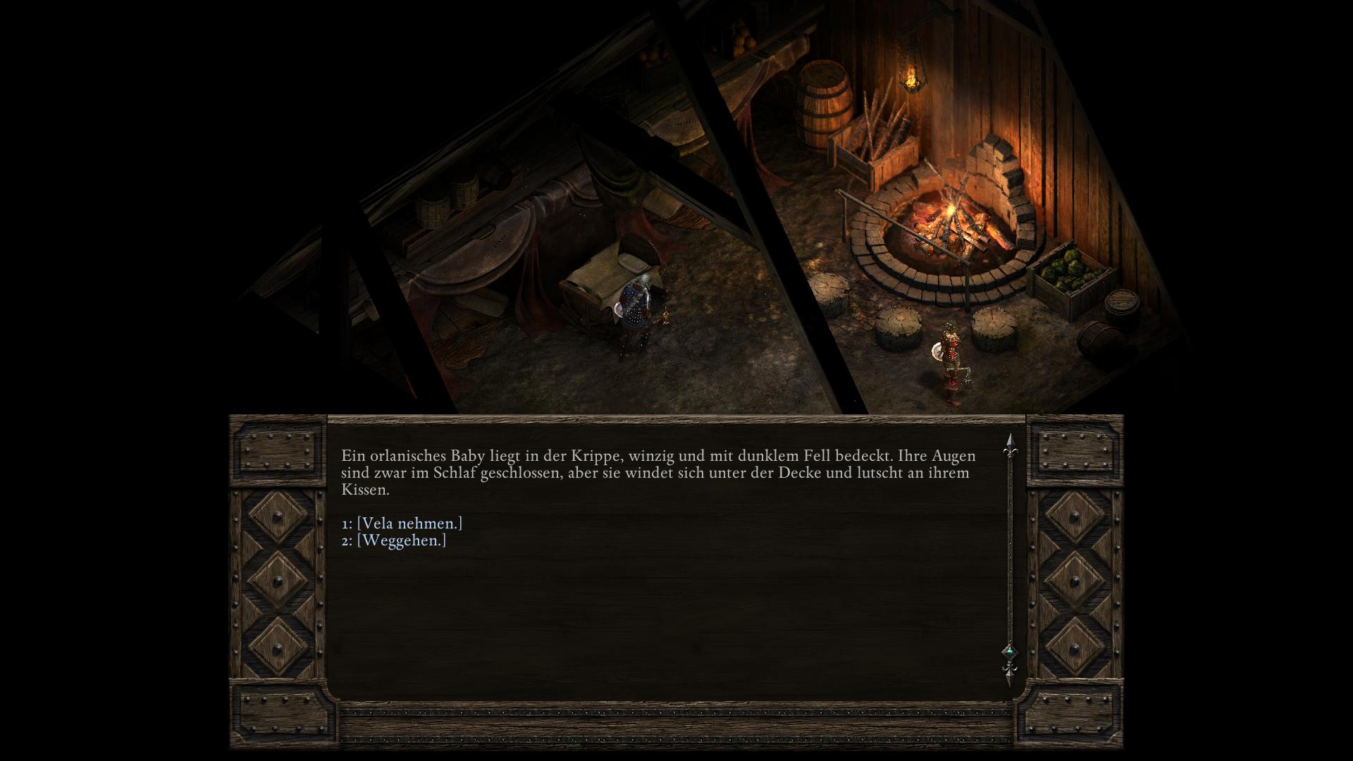 Simoc, der Anführer der Drei-Stoßzahn-Stelgaer in der Halle der Krieger [3], hat keinen würdigen Nachfolger. Zwar zeugte er während seiner Lebzeit dutzende Kinder, doch die Riow, die ihre Seelen prüften, erklärten sie für zu schwach. Obendrein besitzt Simoc eine Ziehtochter des Fischerkranich-Stamms, Vela. In dem längeren Gespräch über seine Nachkommen bittet euch Simoc, Vela zu opfern und aus ihr einen Essenztrank herzustellen. Durch den Verzehr bekäme sein als nächstes gezeugtes Kind eine stärkere Seele. Willigt ihr ein Simoc zu helfen und versucht die Hütte wieder zu verlassen, hält euch sein Sohn Lliras auf. Lliras schlägt vor statt Vela zu opfern, einfach Simoc zu töten, damit er Thronfolger wird. Eure Gefährten werden zu beiden Plänen ihre Meinungen vorbringen. Am wichtigsten ist jedoch die Einstellung der Trauernden Mutter (Grieving Mother). Denn solltet ihr tatsächlich ein unschuldiges Baby opfern, wird sie eure Gruppe für immer verlassen! Ihr habt nun also zwei Wege, die auf drei Arten enden können.