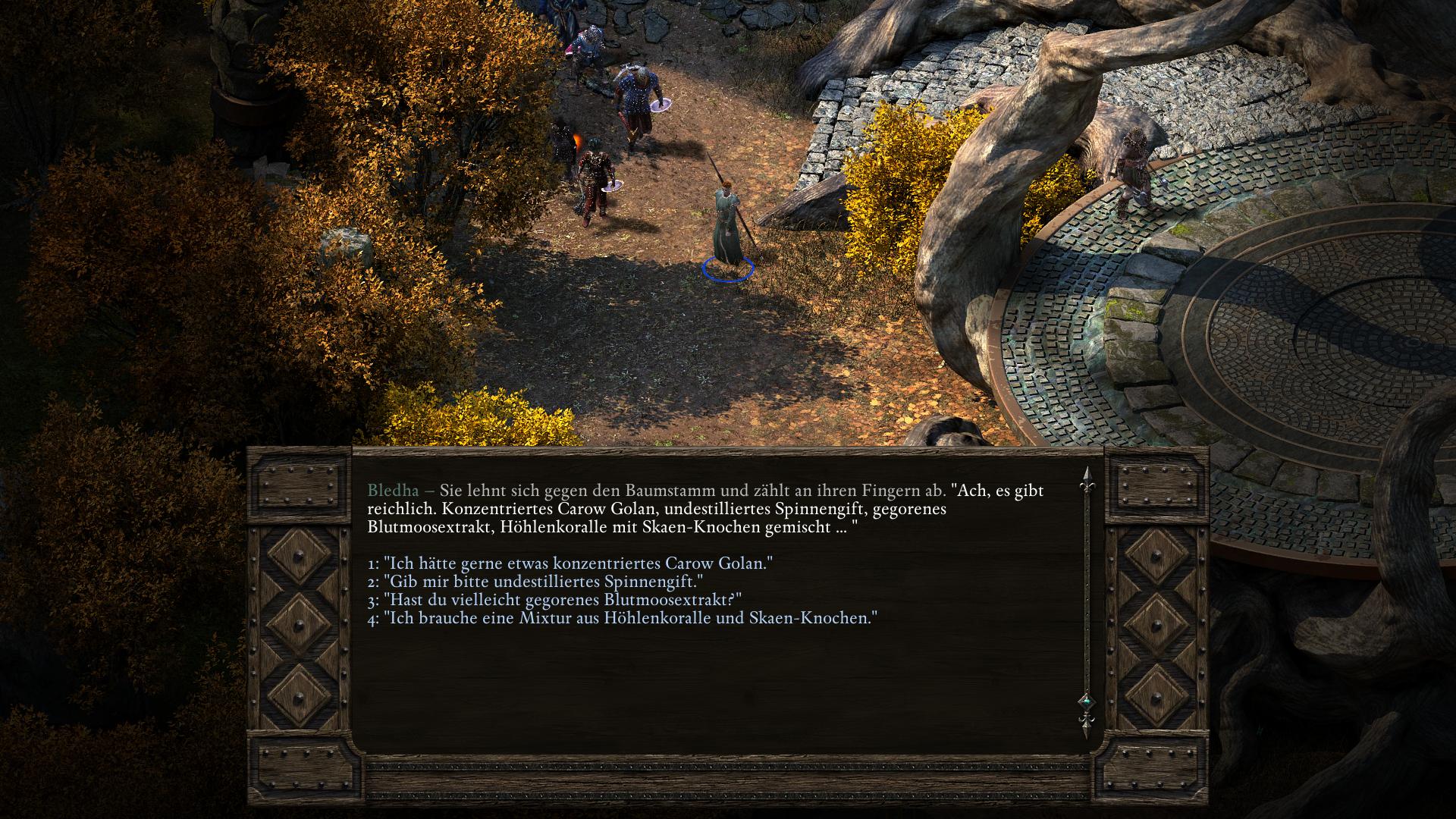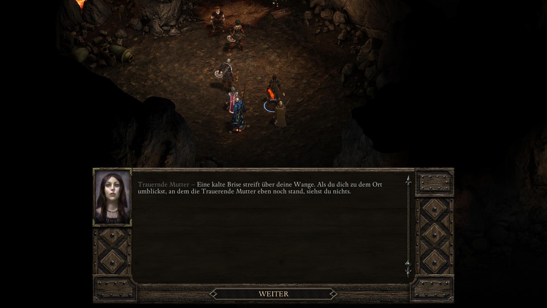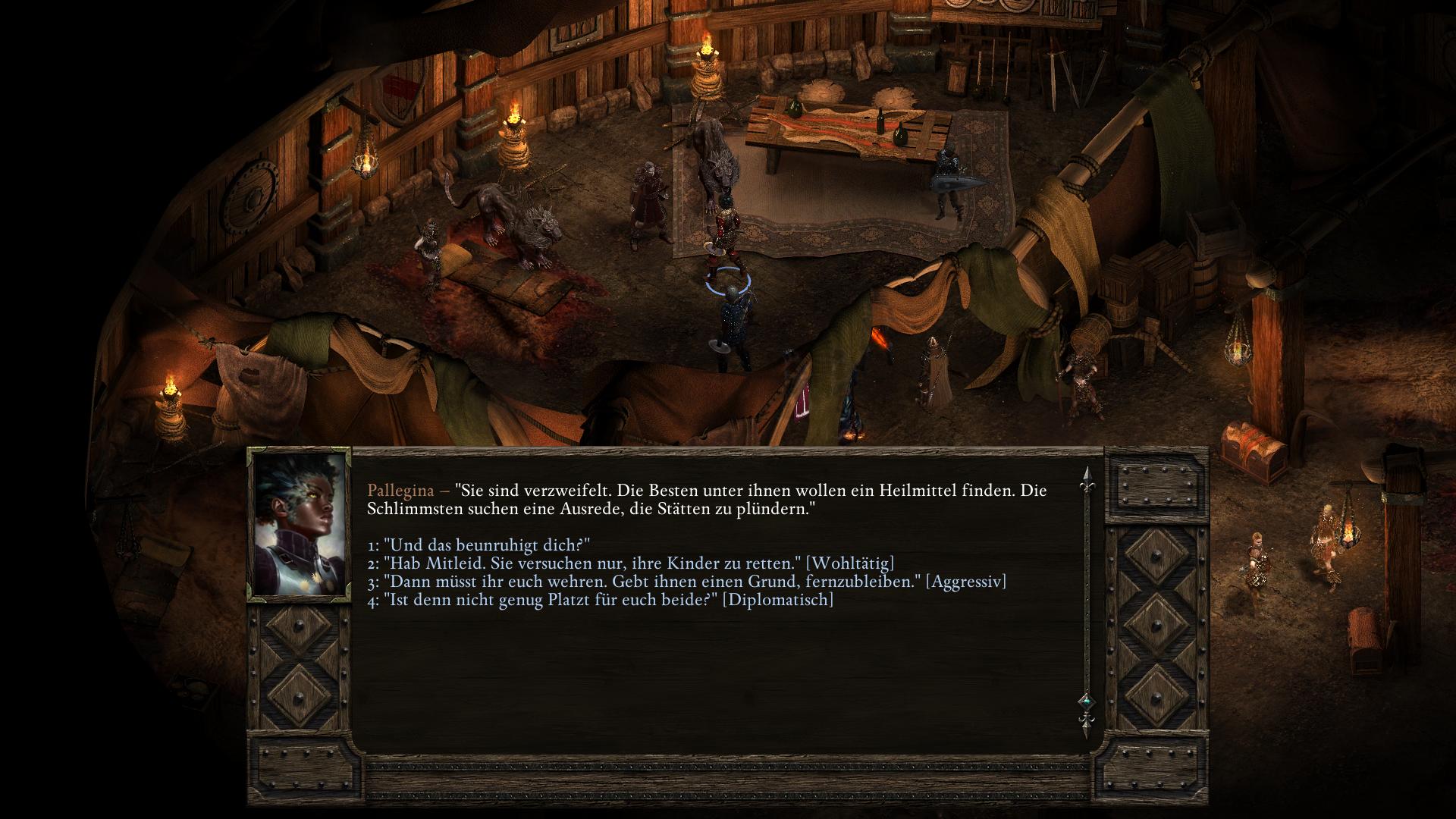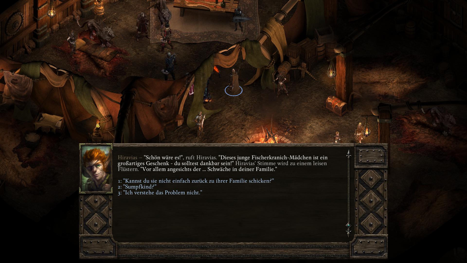 Simoc, der Anführer der Drei-Stoßzahn-Stelgaer in der Halle der Krieger [3], hat keinen würdigen Nachfolger. Zwar zeugte er während seiner Lebzeit dutzende Kinder, doch die Riow, die ihre Seelen prüften, erklärten sie für zu schwach. Obendrein besitzt Simoc eine Ziehtochter des Fischerkranich-Stamms, Vela. In dem längeren Gespräch über seine Nachkommen bittet euch Simoc, Vela zu opfern und aus ihr einen Essenztrank herzustellen. Durch den Verzehr bekäme sein als nächstes gezeugtes Kind eine stärkere Seele. Willigt ihr ein Simoc zu helfen und versucht die Hütte wieder zu verlassen, hält euch sein Sohn Lliras auf. Lliras schlägt vor statt Vela zu opfern, einfach Simoc zu töten, damit er Thronfolger wird. Eure Gefährten werden zu beiden Plänen ihre Meinungen vorbringen. Am wichtigsten ist jedoch die Einstellung der Trauernden Mutter (Grieving Mother). Denn solltet ihr tatsächlich ein unschuldiges Baby opfern, wird sie eure Gruppe für immer verlassen! Ihr habt nun also zwei Wege, die auf drei Arten enden können.