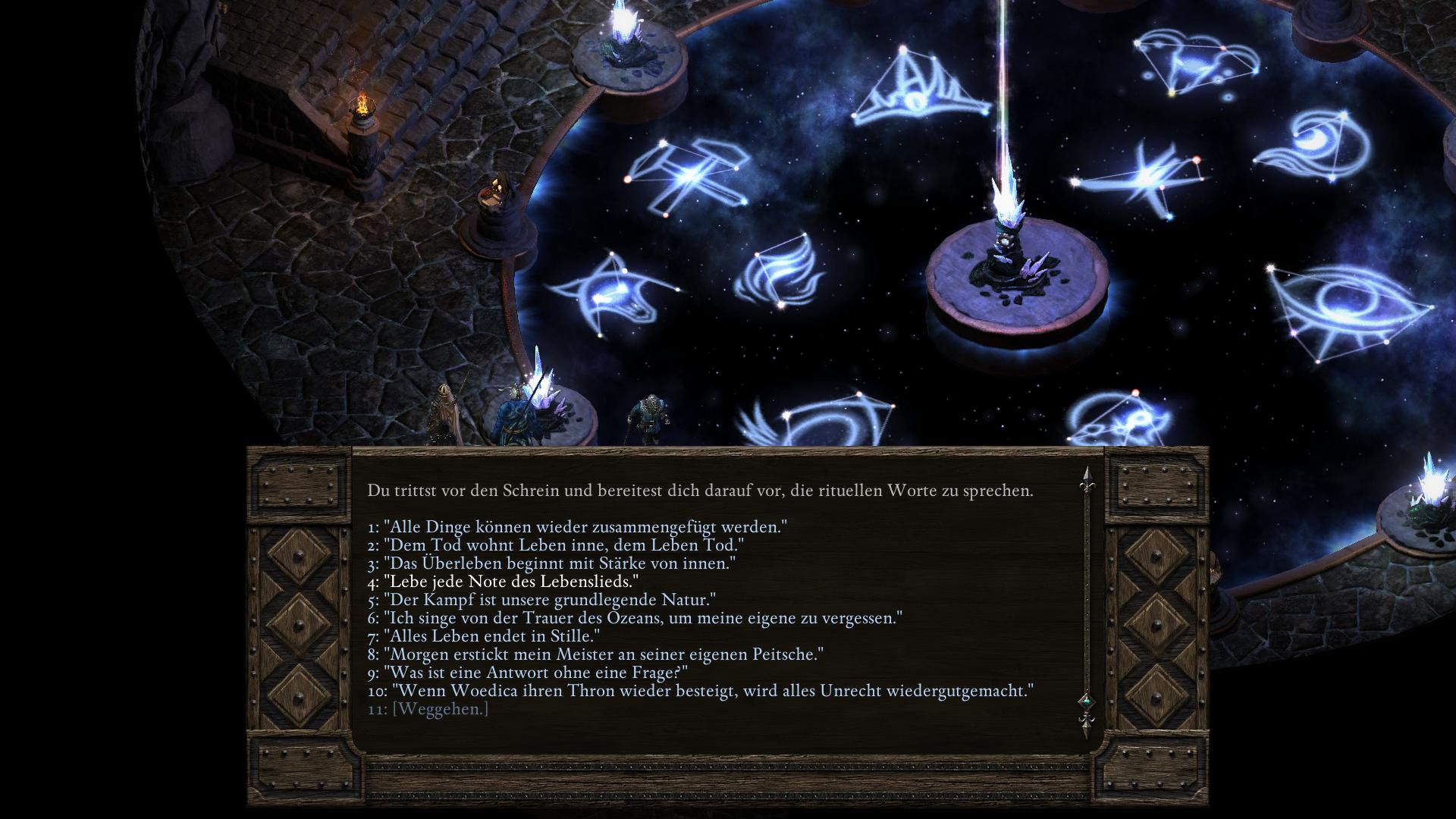 Nehmt für das Gebet als erstes das Buch "Erinnerungen einer Hebamme" aus dem linken Regal [3], um das richtige Gebet zitieren zu können. Holt euch als nächstes den Leuchtenden Adra-Splitter vom Podest rechts [6] und platziert ihn in der Mitte, damit der Raum zum Leben erwacht. Betet nun an der linksunteren Säule [7] (die am Eingang) zu Hylea. Wählt dafür den 4. Satz: "Lebe jede Note des Lebenslieds."