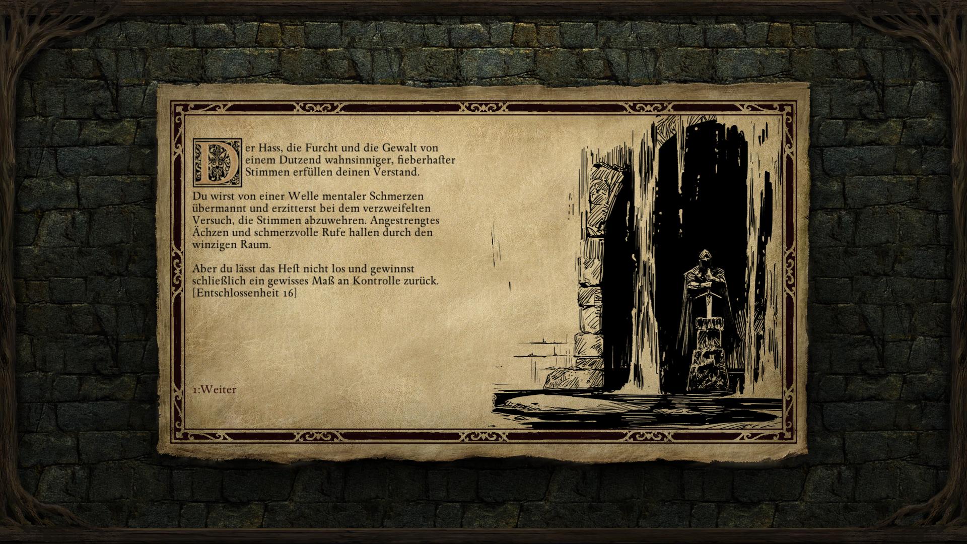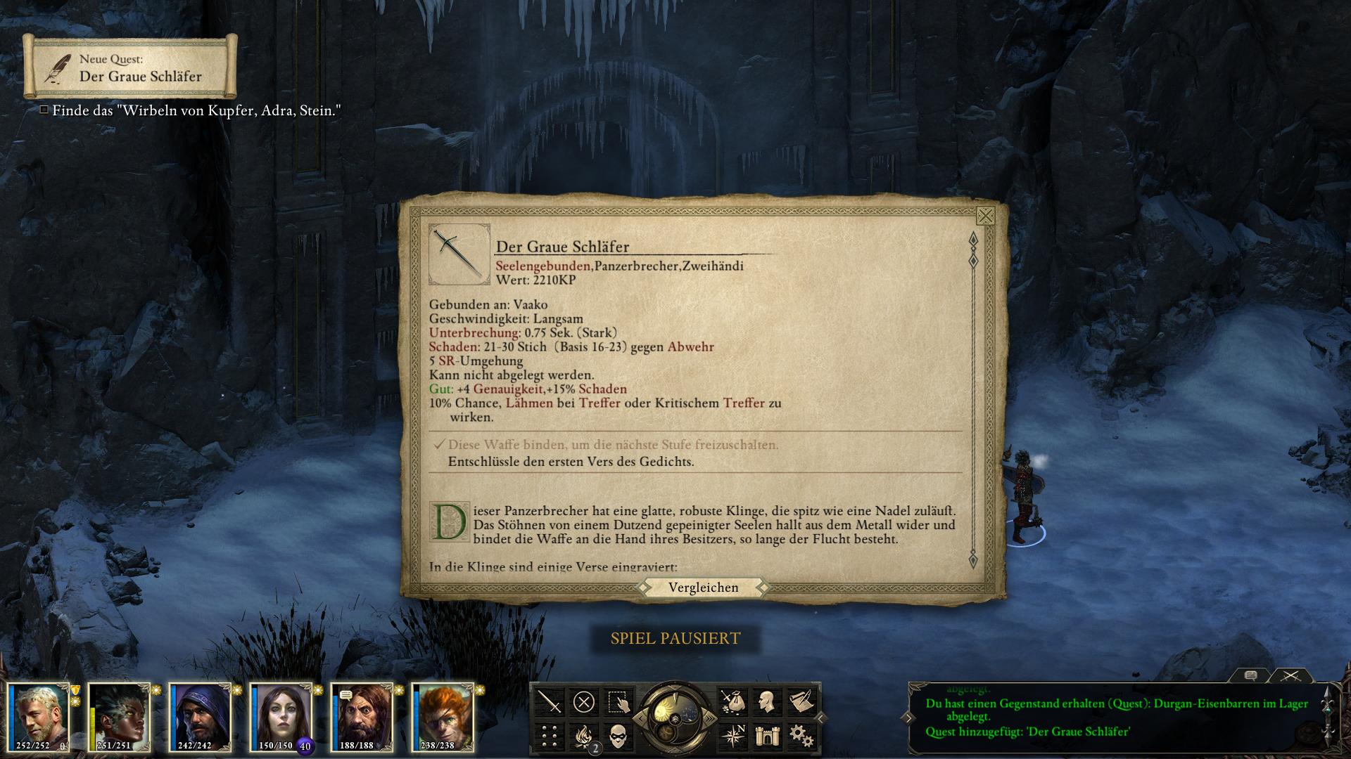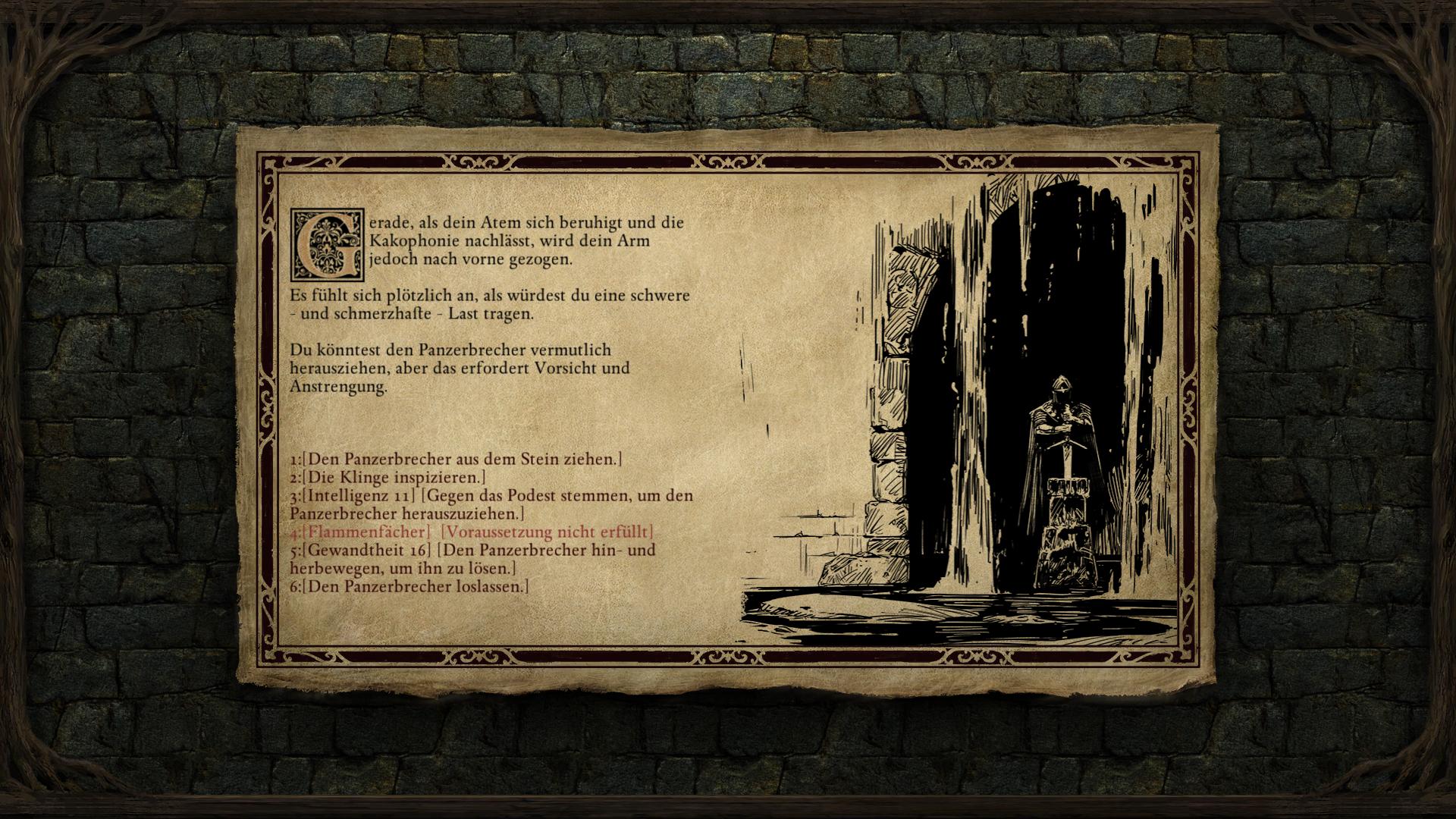 Im Nordosten der Langsicht-Fälle des Weißmark Hoheitsgebietes wird eine Zwergenruine [1] von Geistern bewacht. Nachdem ihr die Cean Gwla und Gespenster bezwungen habt, findet ihr einen Panzerbrecher (Estoc), der in einem Steinpodest steckt. Innerhalb einer Interaktionssequenz, kann ihn ein Charakter eurer Gruppe aus dem Stein ziehen. Die Untersuchungen der Gegend bringen mit Wahrnehmung 14 bereits die Schreie und Rufe gepeinigter Seelen hervor, was ein erstes Anzeichen sein sollte, dass dort etwas nicht stimmt. Versucht ihr es herauszuziehen übermannt den Charakter eine Welle mentaler Schmerzen und nur mit Entschlossenheit 16 behaltet ihr ein gewisses Maß an Kontrolle über das Heft. Weitere Hinweise gibt es mit Intelligenz 11 und Wahrnehmung 13. Es erfordert jedoch mindesten Macht 13 um das Schwert letztlich aus dem Stein zu ziehen. Das bindet den "Grauen Schläfer" an die Seele des Charakters und belegt diesen zugleich mit einem Fluch! Der Charakter kann den Panzerbrecher von dem Punkt an nicht mehr loslassen oder gar das Waffenset wechseln, bis der Fluch gebrochen ist. Die damit gleichzeitig gestartete Quest gibt Aufschluss über die drei Schritte, die zum Brechen des Fluchs nötig sind. Ihr müsst Ort finden, die den auf dem Grauen Schläfer eingravierten Versen entsprechen.