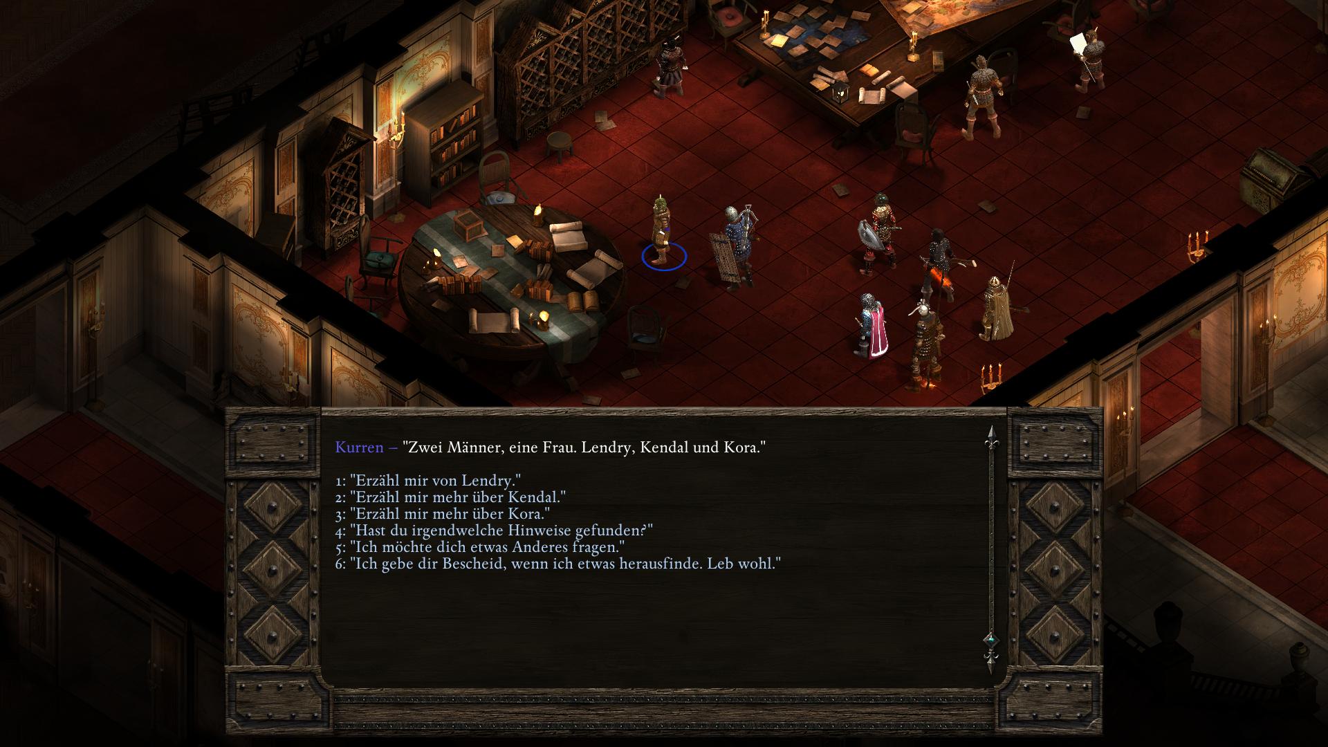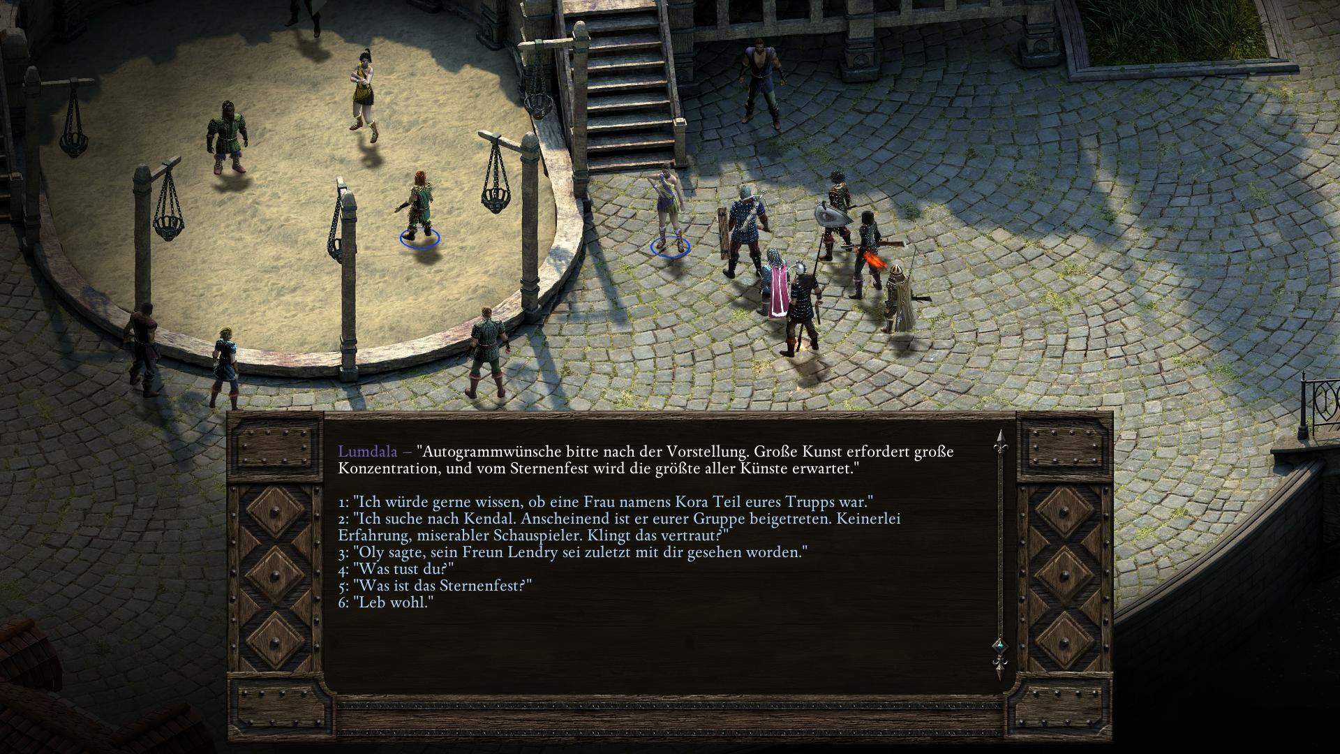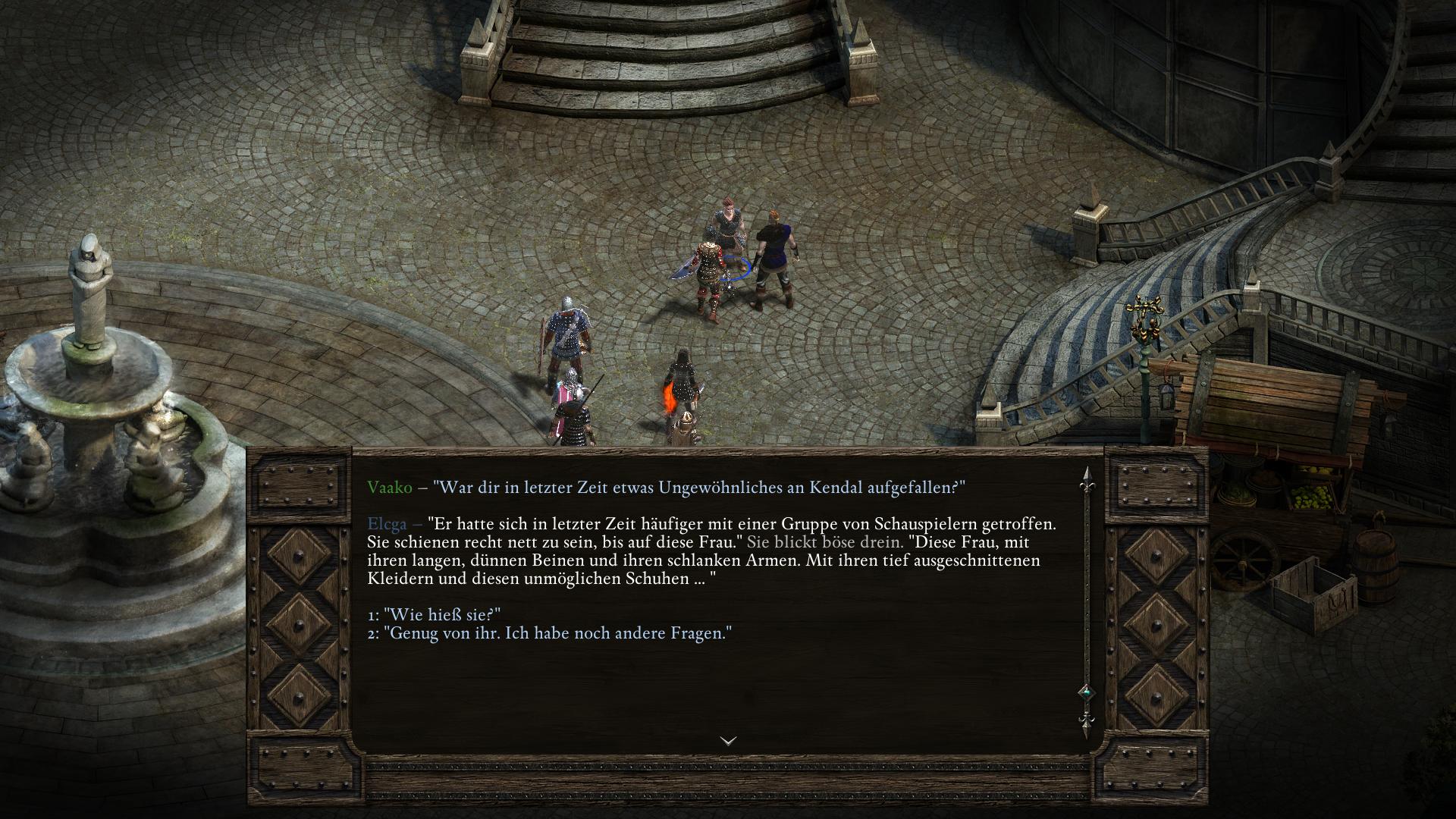Da ihr ohnehin schon in Farnheim seid, könnt ihr direkt Elcga [7] am Brunnen zu Kendals Verschwinden befragen. Elcga erzählt von einer Schauspielergruppe, mit der sich Kendal in letzter Zeit rumgetrieben hat und das ihm eine schlanke Frau mit tief ausgeschnittenen Kleidern aufgefallen ist, kennt jedoch nicht ihren Namen.