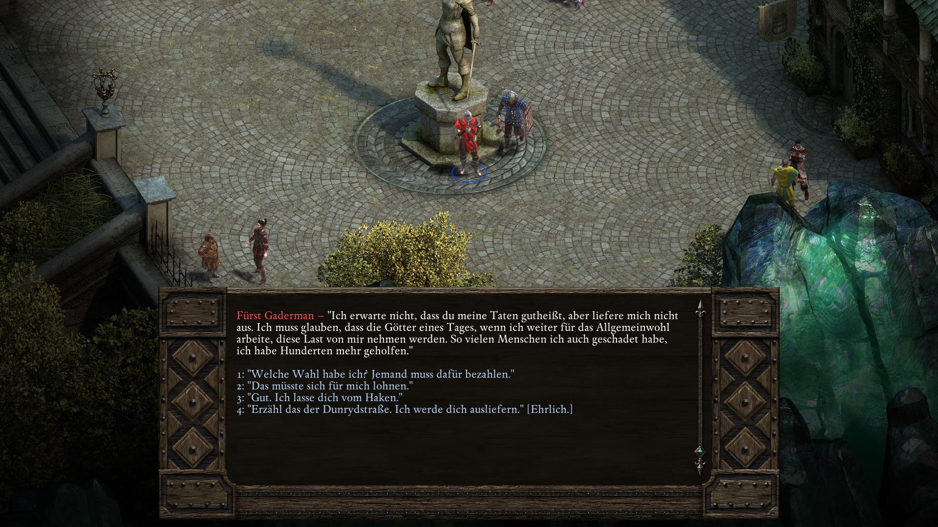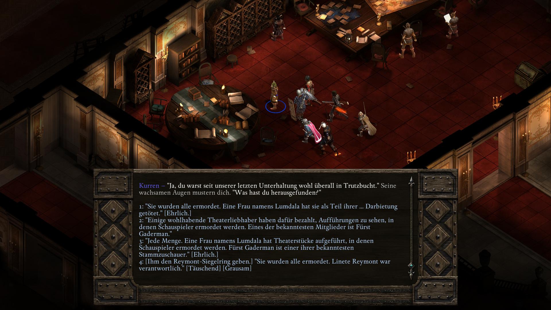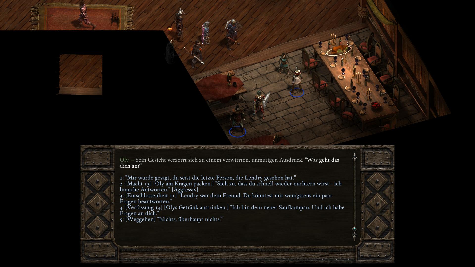 Da ihr ohnehin schon in Farnheim seid, könnt ihr direkt Elcga [7] am Brunnen zu Kendals Verschwinden befragen. Elcga erzählt von einer Schauspielergruppe, mit der sich Kendal in letzter Zeit rumgetrieben hat und das ihm eine schlanke Frau mit tief ausgeschnittenen Kleidern aufgefallen ist, kennt jedoch nicht ihren Namen.